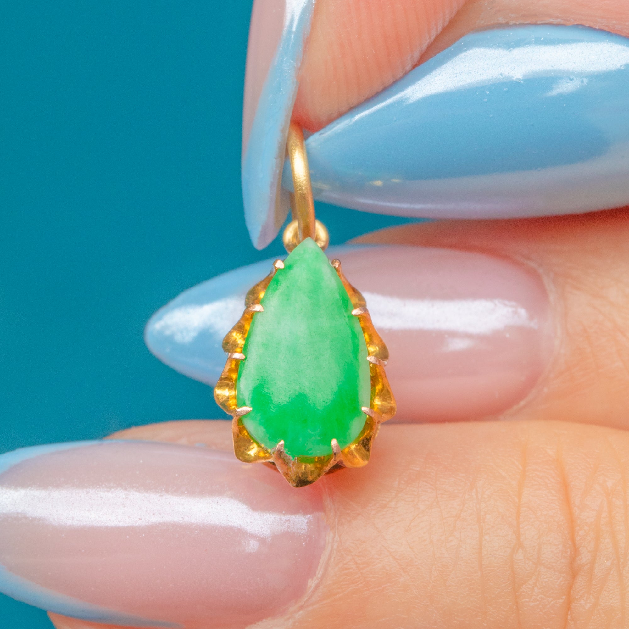 This Victorian 18ct Gold charm will bring a vibrant pop of colour to your attire! Centred by a glossy pear-shaped Jade cabochon, this antique charm projects a saturated green vibrancy from the stone, known for its spiritual healing qualities.