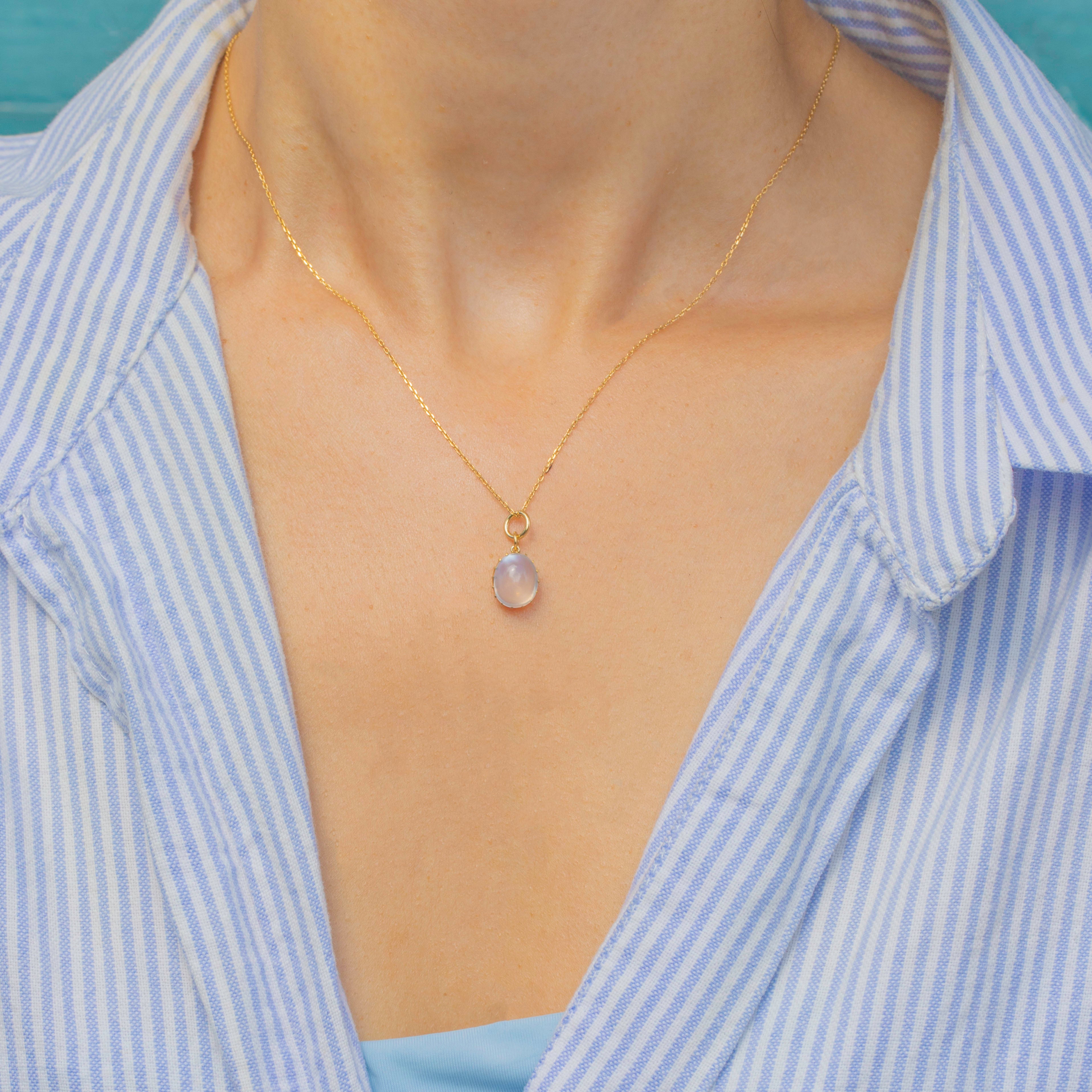 This Victorian pendant is crafted from 18ct Yellow Gold and boasts a 4.00ct Moonstone cabochon secured in elegant claw settings. The Moonstone displays a soft blue adularescence, which shines like a shimmering moon.
