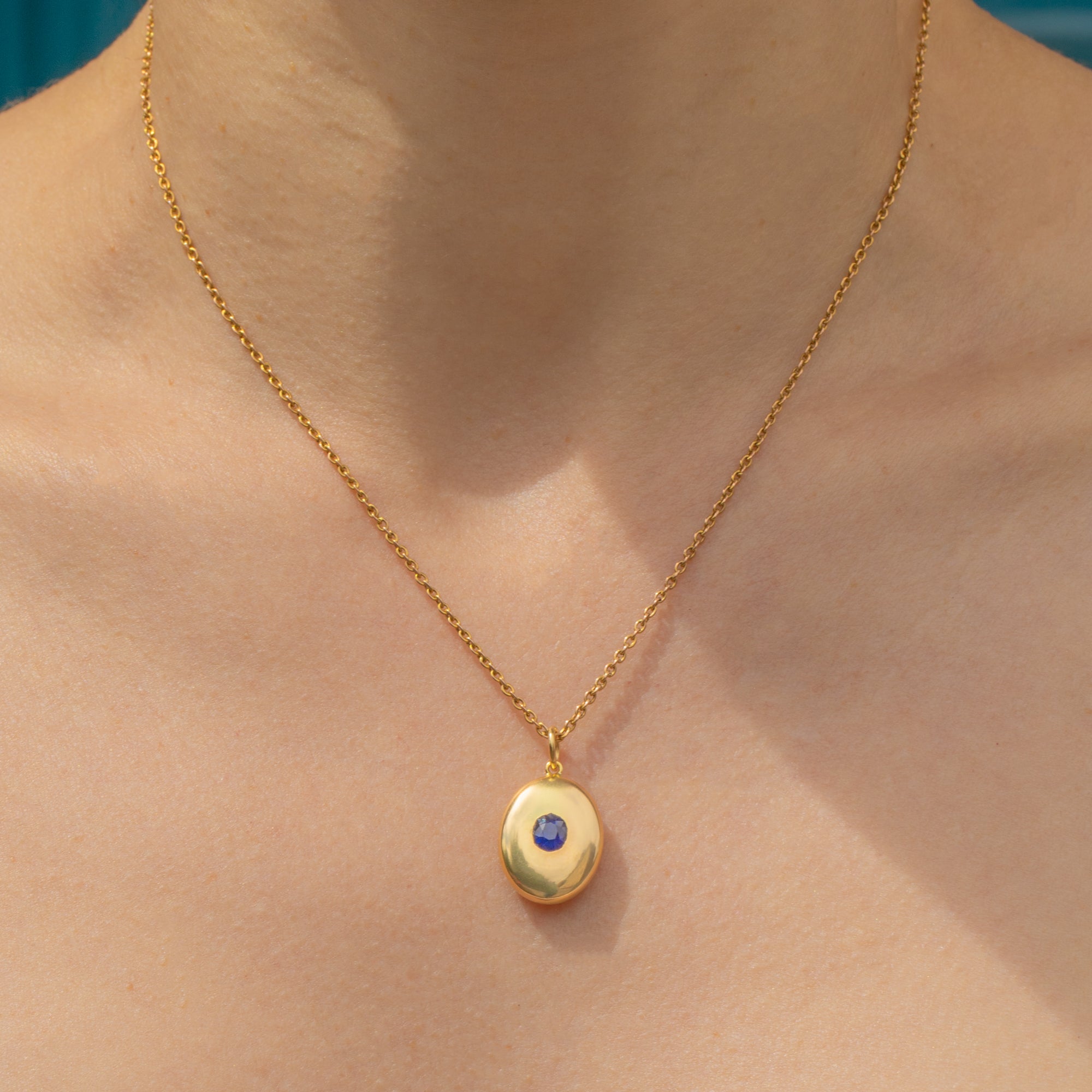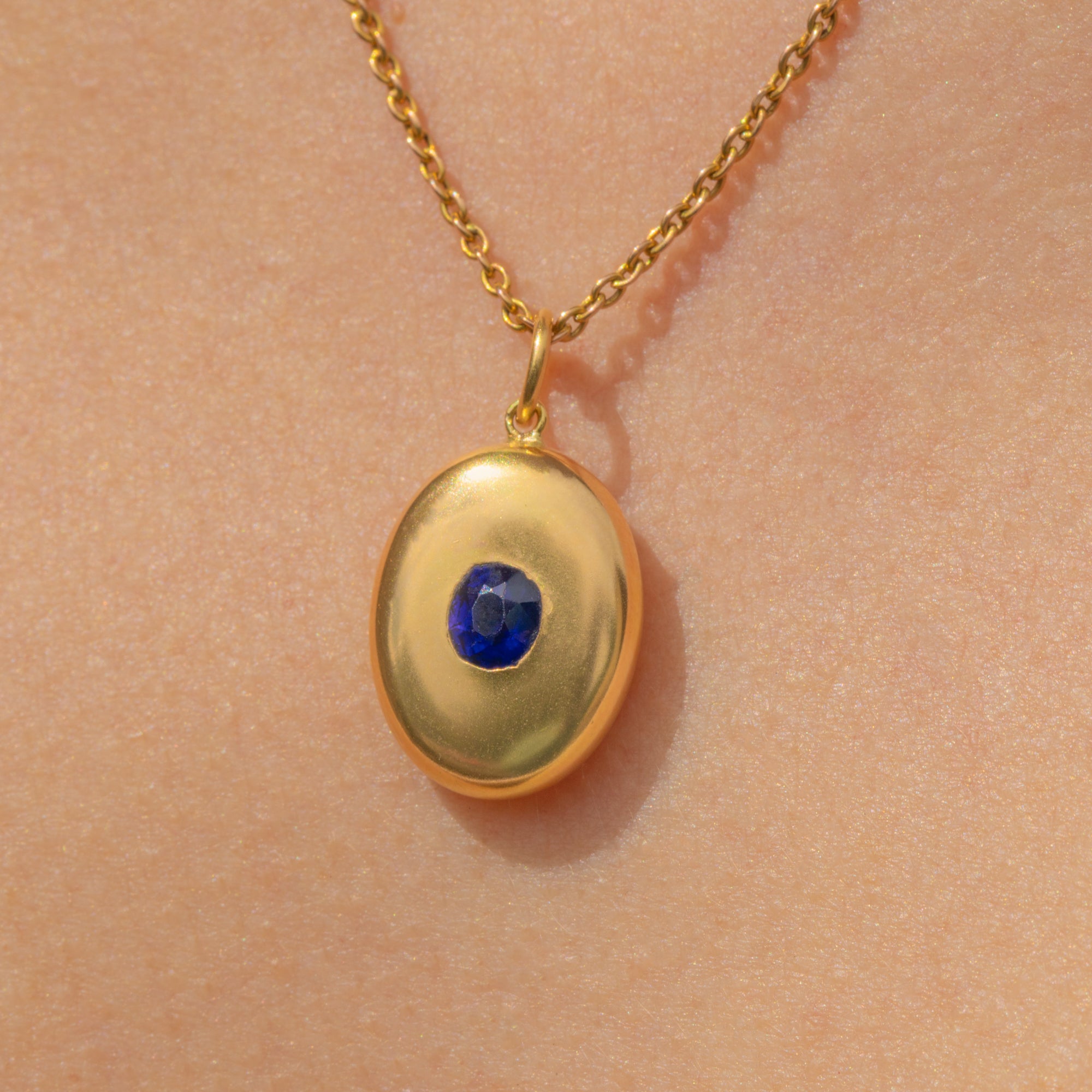 Her glistening Sapphire is encompassed by a halo of buttery 18ct Gold with a curvaceous and puffy form that sits comfortably upon your chest. Born in the 19th century, this Victorian Sapphire pendant possesses a timeless appeal, you are bound to be reaching for her time and time again.