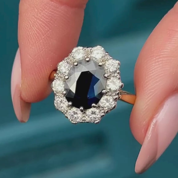 Antique 18ct Gold Natural Sapphire Diamond Cluster Ring, 2.17ct Sapphire