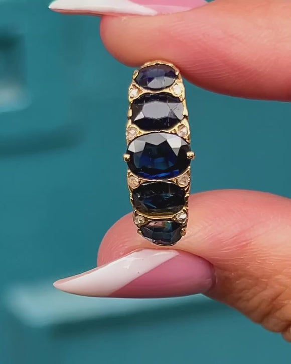 This Victorian five stone ring displays resplendent graduating natural Sapphires across its face, each radiating deep midnight blue hues from their crisp facets.