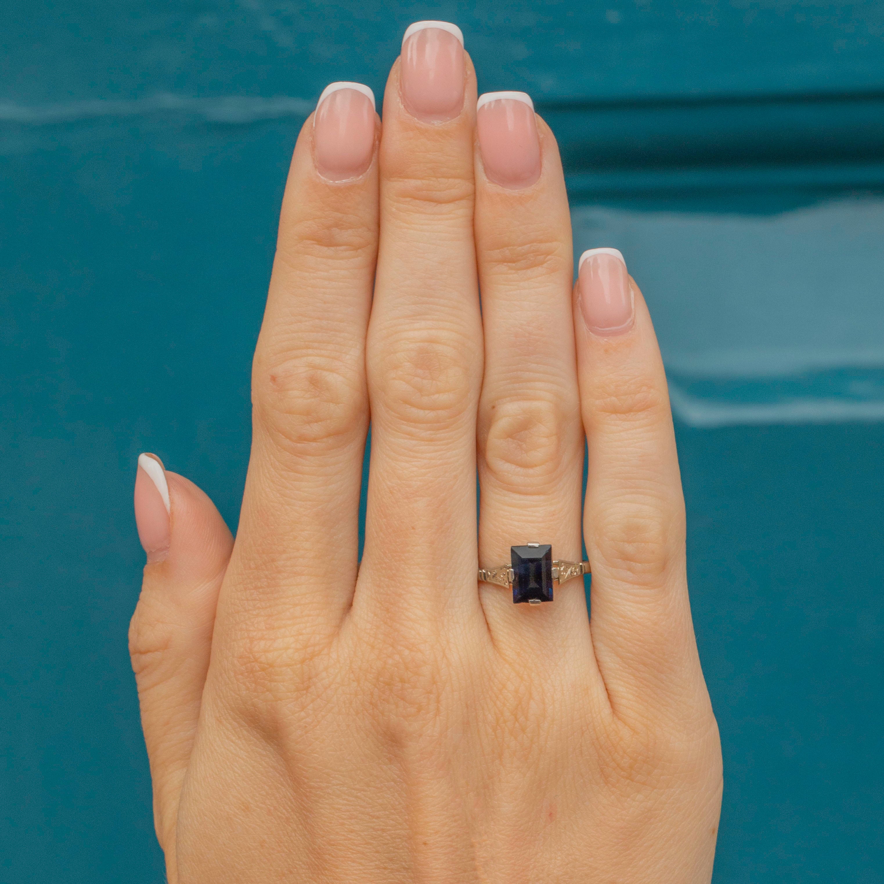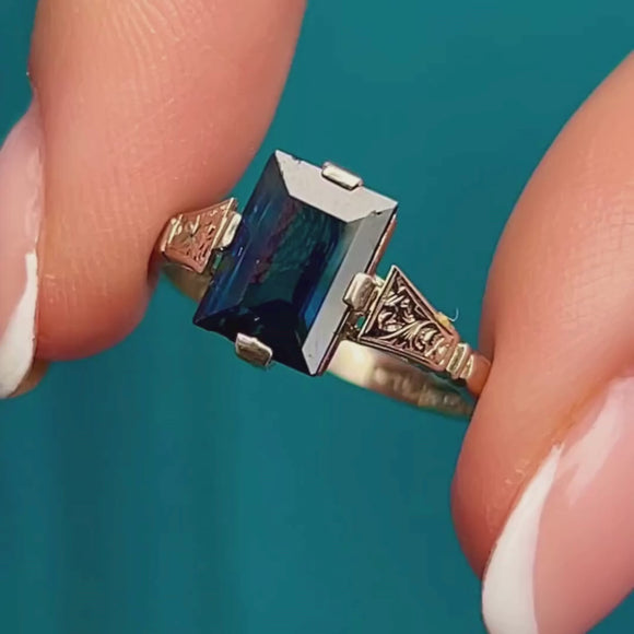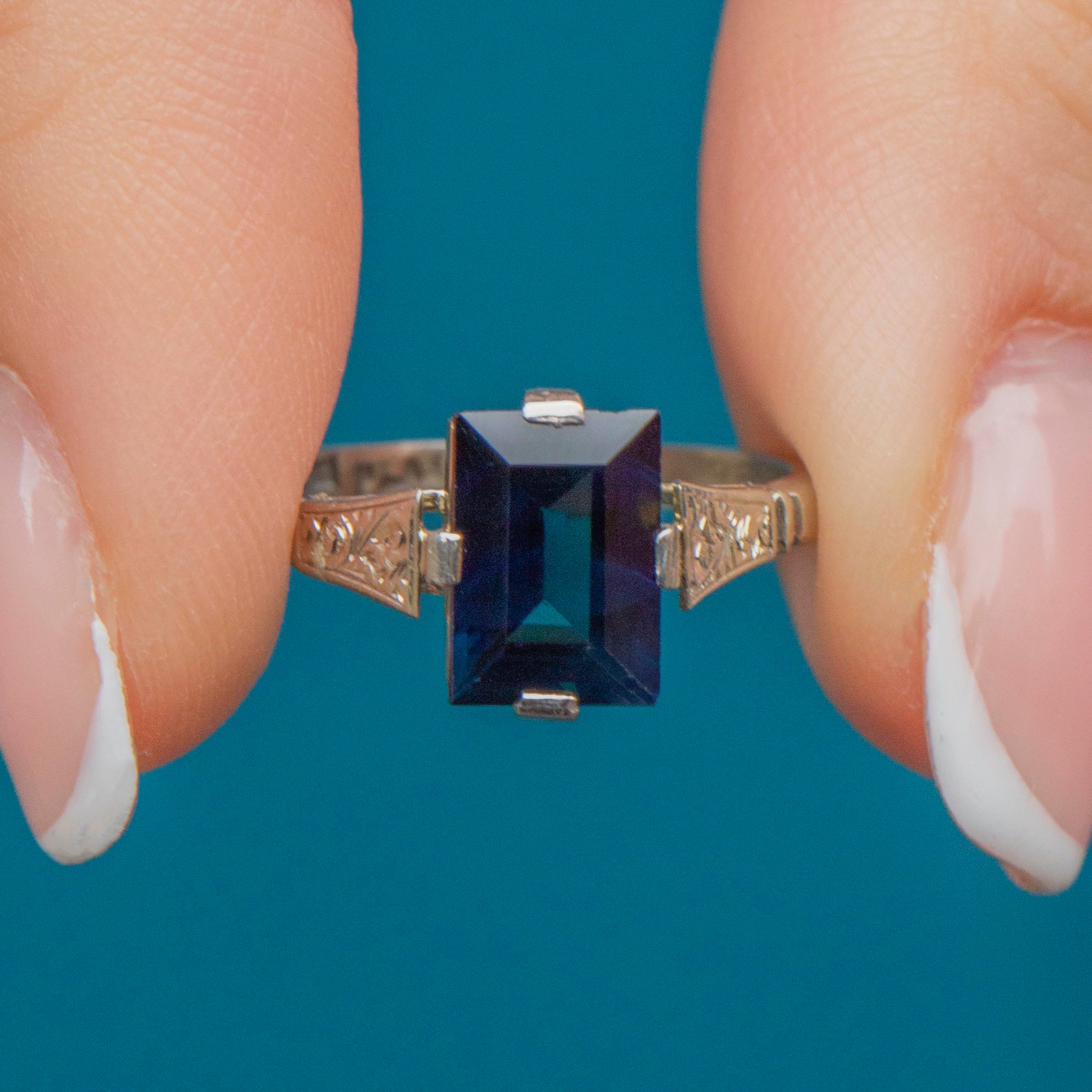 This stunning antique Art Deco 18ct Gold natural Sapphire ring would make a wonderful choice for a unique engagement ring! A large 1.12ct deep blue Sapphire sits proudly, displayed within gorgeously engraved shoulders. If you're looking for an Art Deco ring with the "wow" factor, look no further! Offered in immaculate condition, she's sure to receive many admiring glances wherever you go.