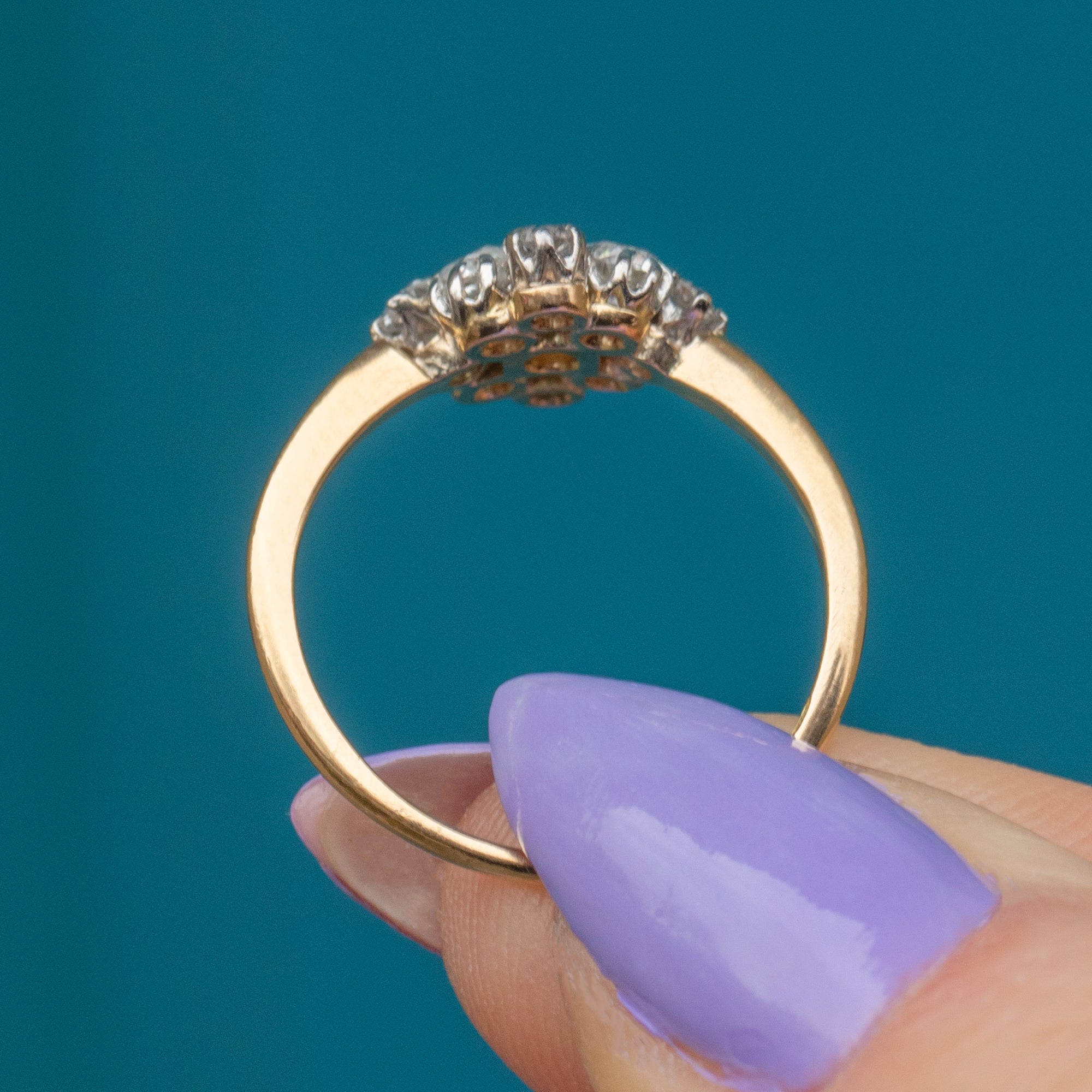 Her centrepiece boasts nine Diamonds and is complemented by a buttery solid 18ct Gold band, ensuring she sits daintily on your finger. This Victorian Diamond ring is perfect for everyday wear and would make a stunning choice for a unique engagement ring!