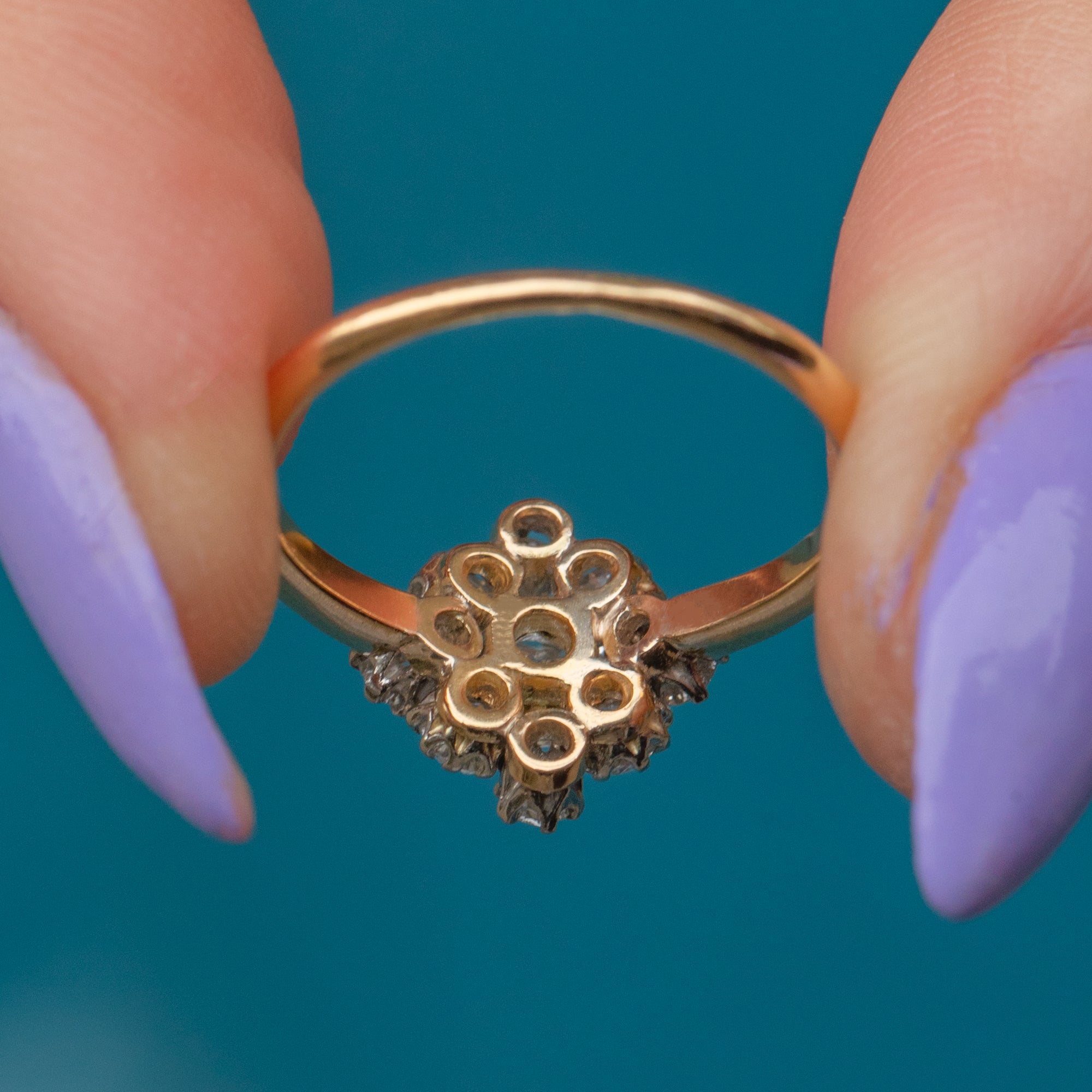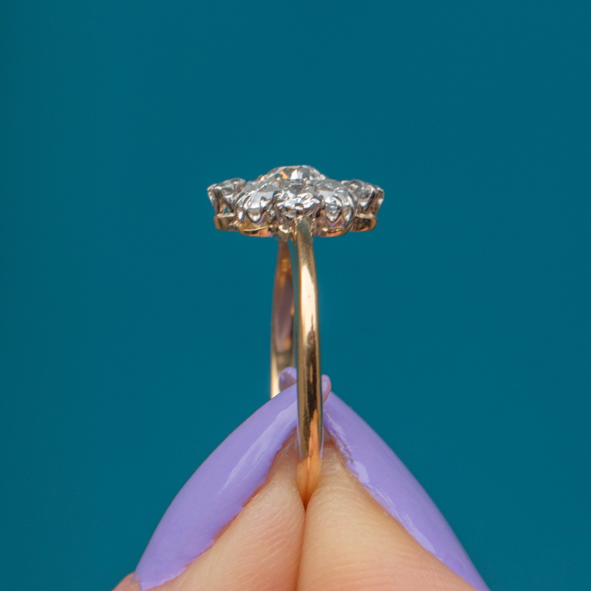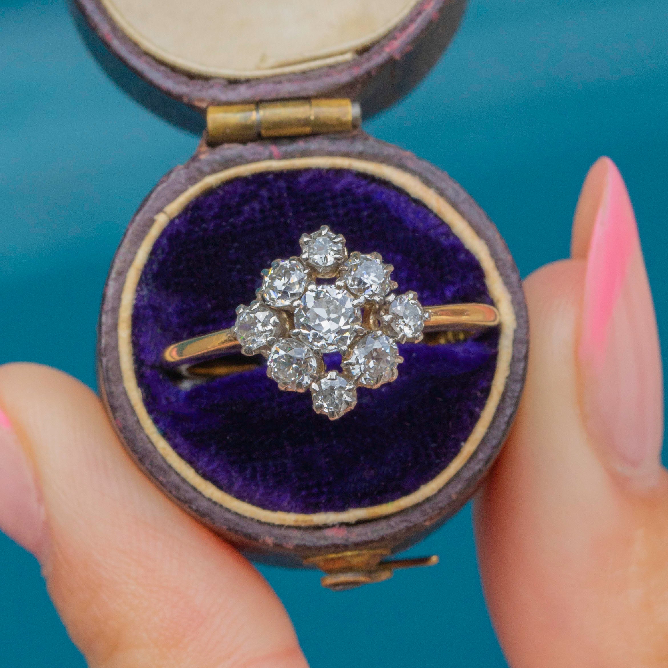 Add some luxurious sparkle to your hand with this charming 0.75ct antique 18ct Gold Old-European Diamond cluster ring! Arranged into a timeless diamond shape, the cluster twinkles elegantly in the light.