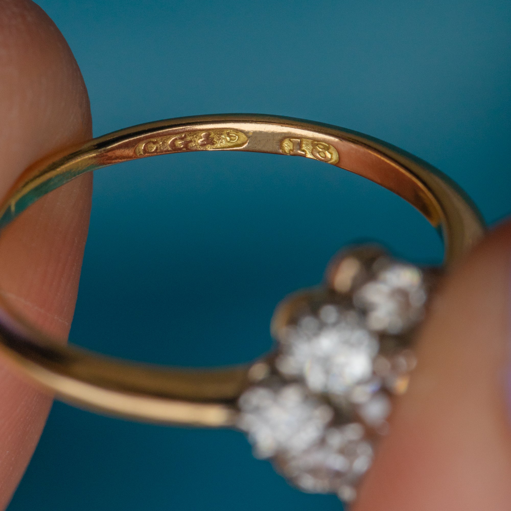 VERY GOOD-EXCELLENT: This antique 18ct Gold Old-European Diamond cluster ring is in wonderful condition! The band shows only minor signs of age-related wear, but the Gold is buttery, and the band has held its form well. The Diamonds are securely set in Platinum, without any fleabites or abrasions. You can wear her with the utmost confidence!