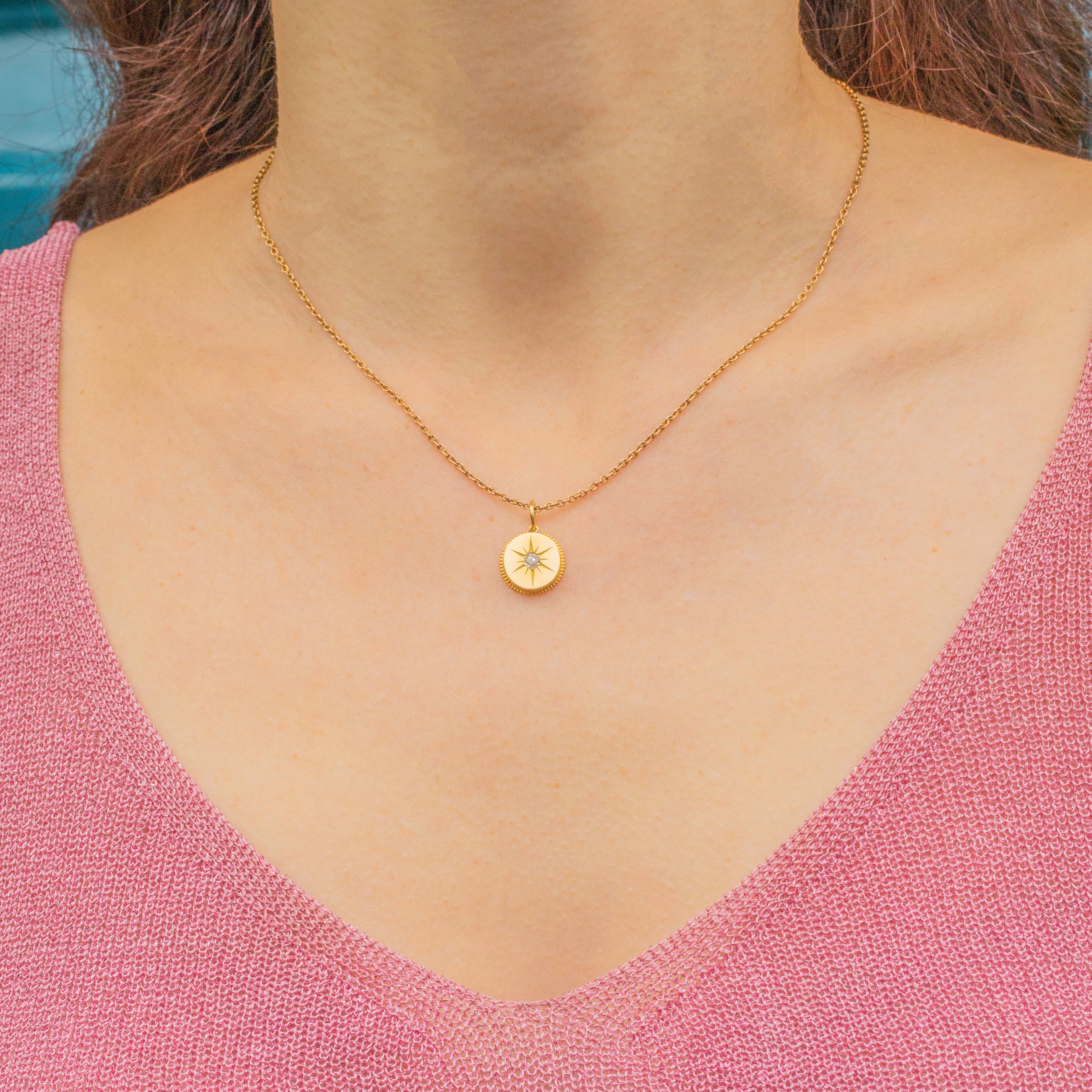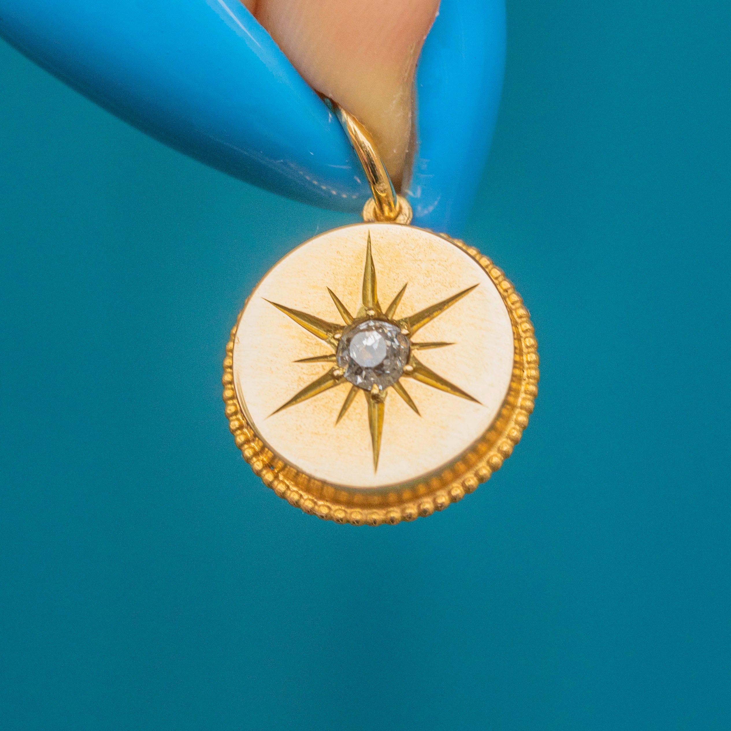 EXCELLENT. We are pleased to present this antique 18ct Gold Diamond disk charm in excellent condition. Her old-mine cut Diamond catches the light brilliantly and sits securely within her flush setting. The buttery 18ct Gold is in great condition, with an intricate star engraving and very minor signs of wear commensurate with age. She is a must-have!