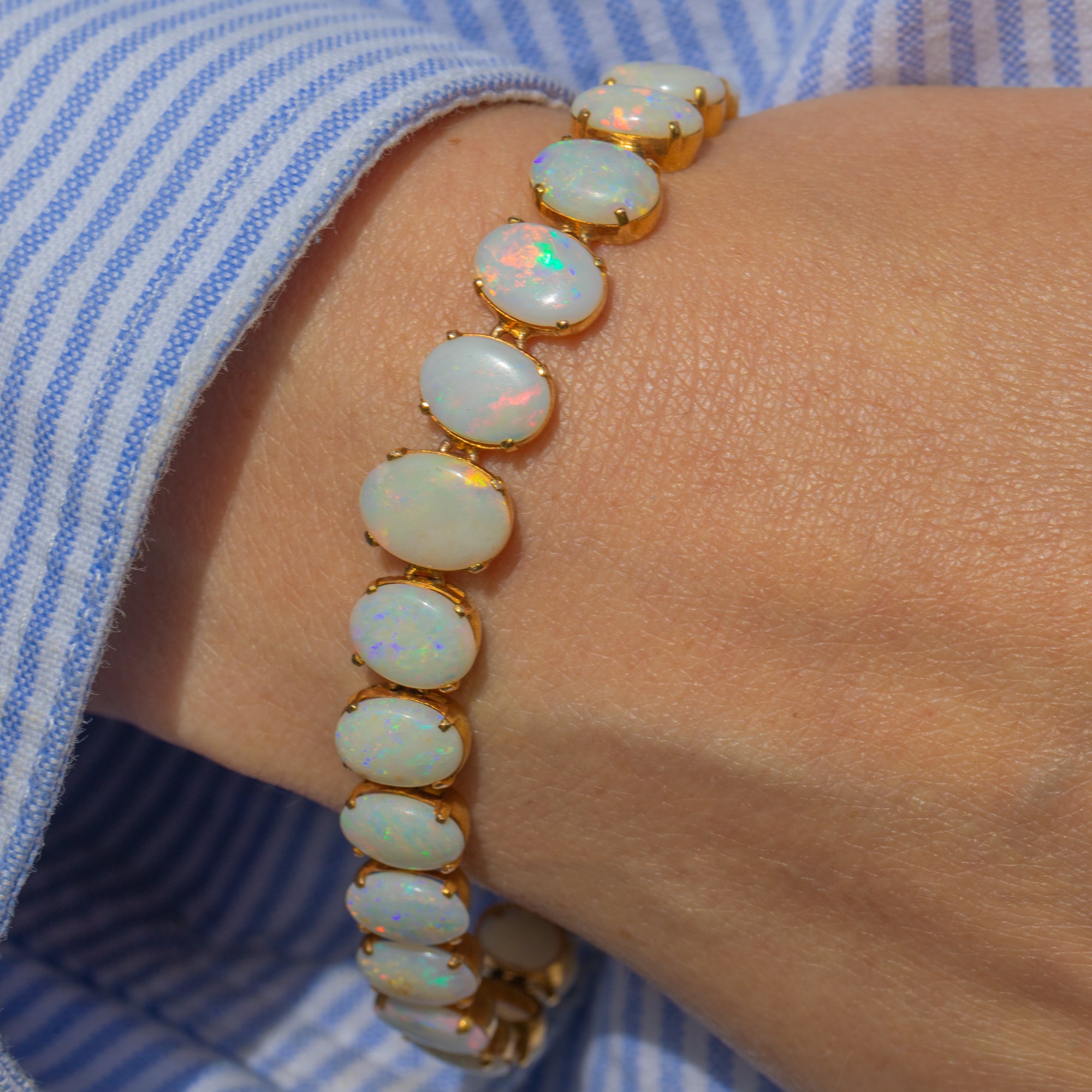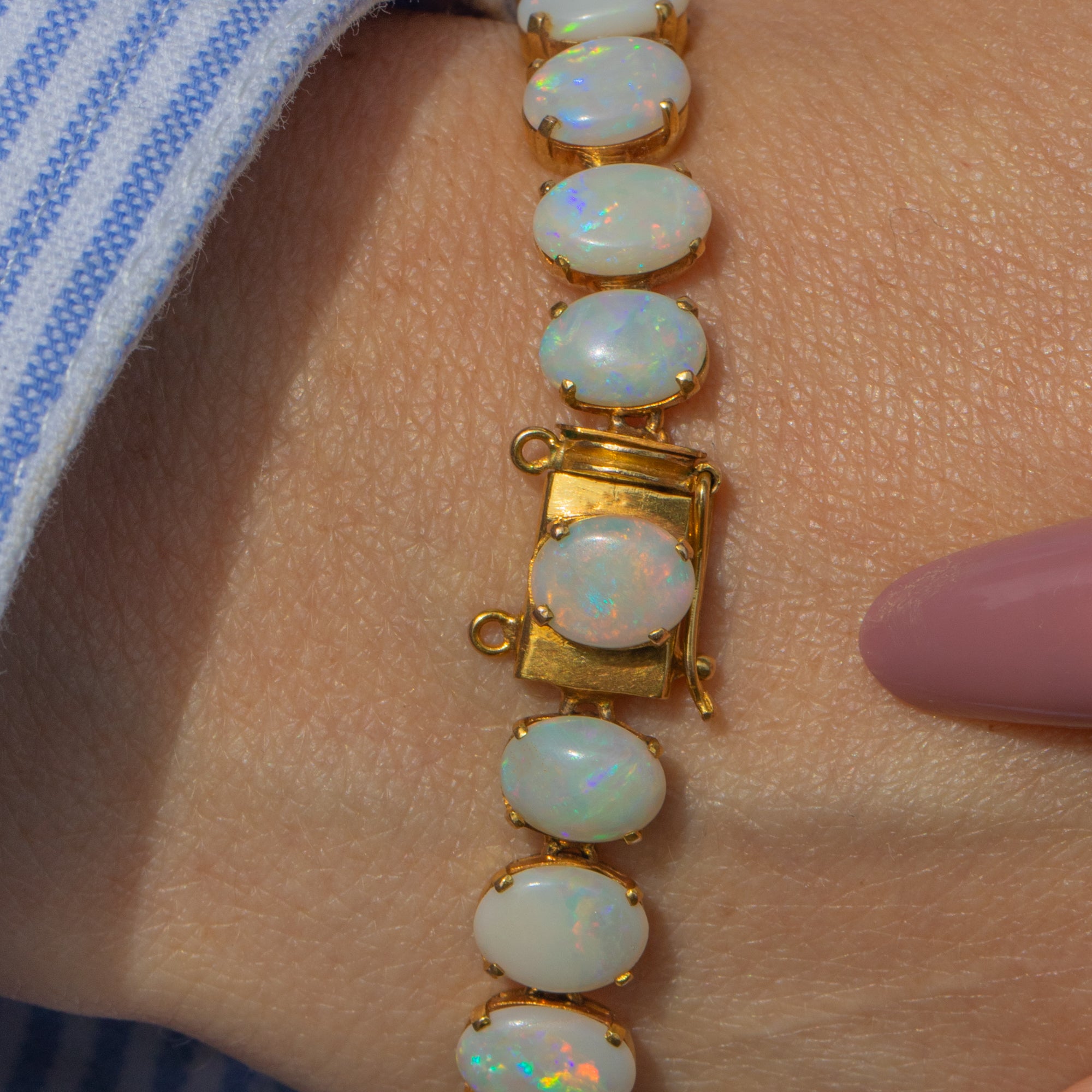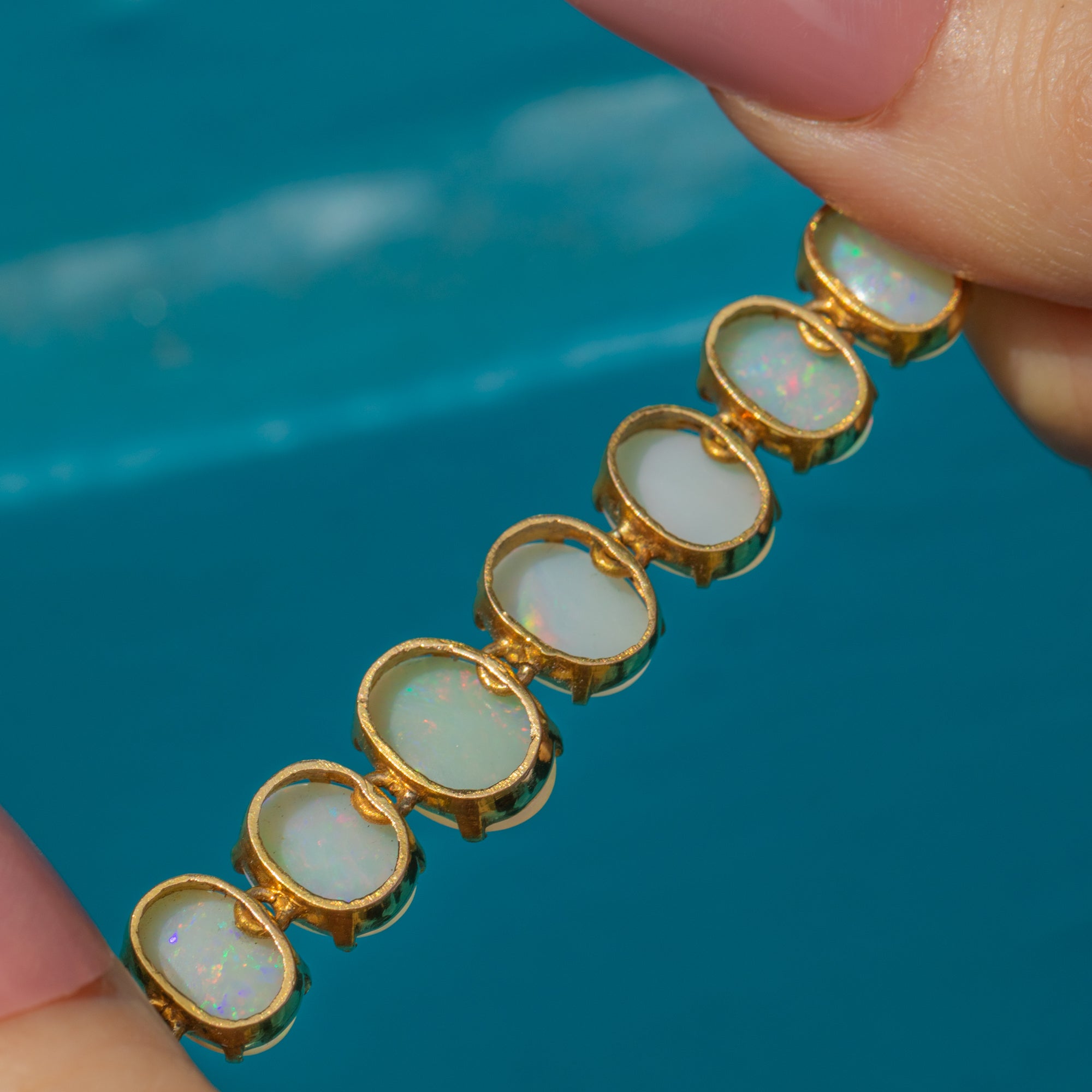 Bring timeless elegance to your repertoire with this antique 18ct Gold Opal bracelet! Inlaid with 23 Opal cabochons, with a firework display of iridescent flashes dancing from one smooth-cut Opal to the next, they caress the entire circumference of your wrist.