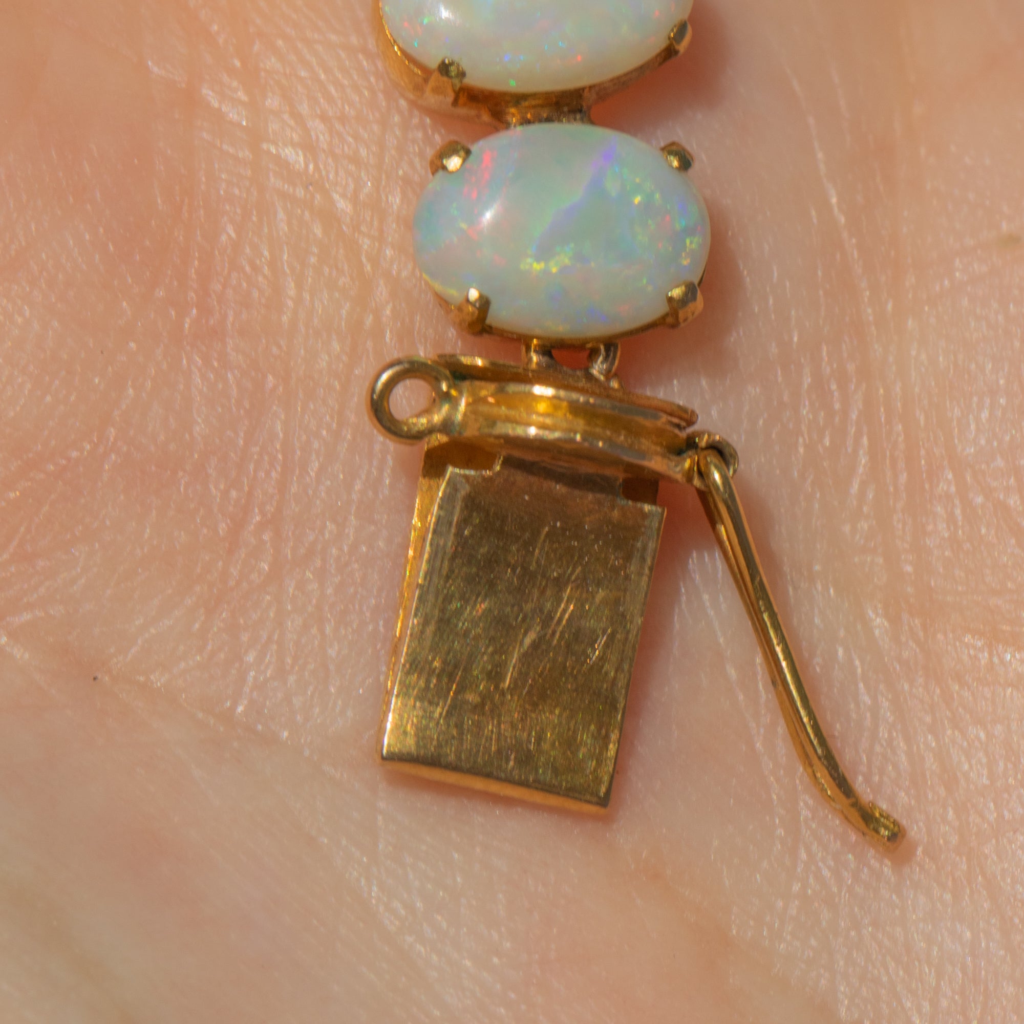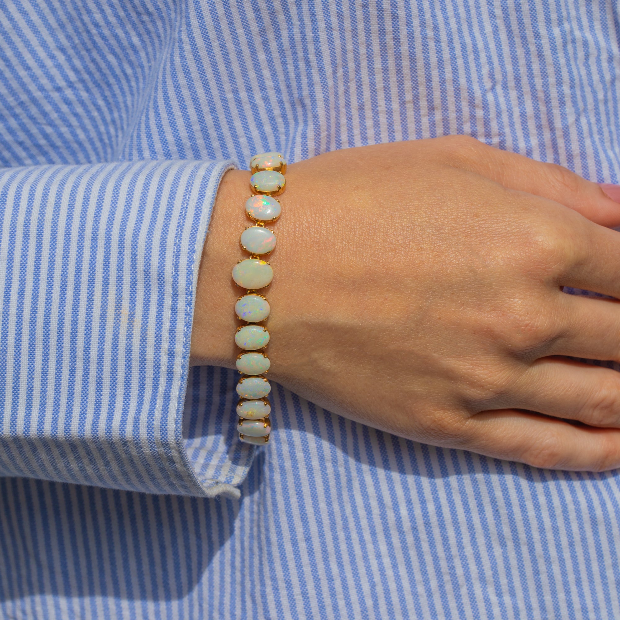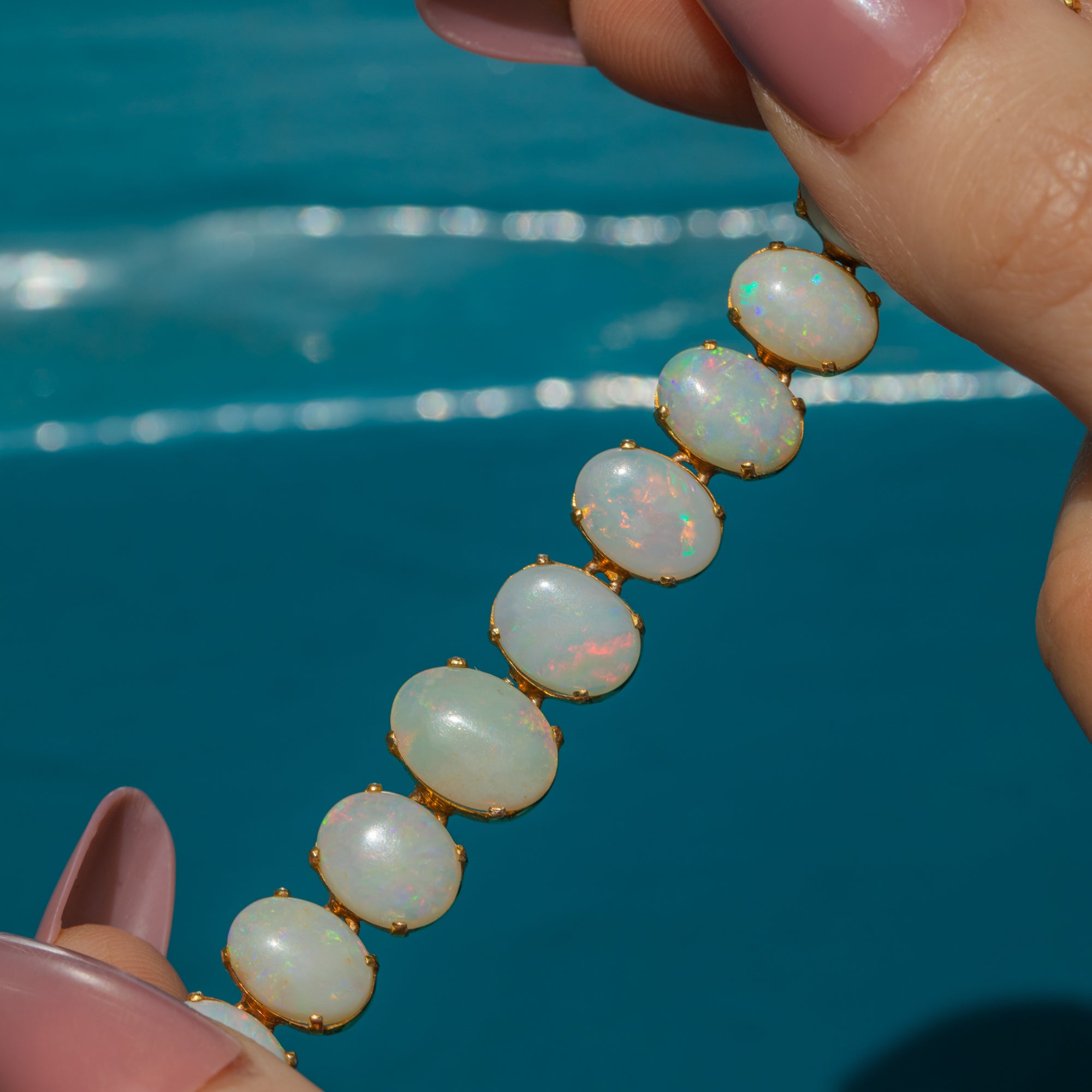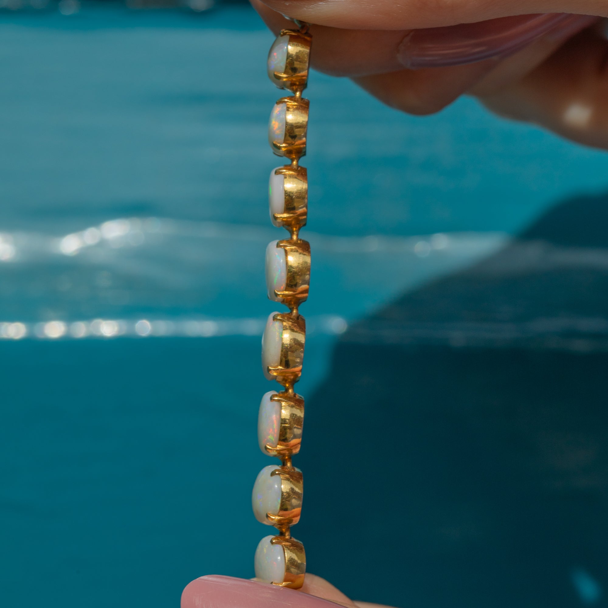 Bring timeless elegance to your repertoire with this antique 18ct Gold Opal bracelet! Inlaid with 23 Opal cabochons, with a firework display of iridescent flashes dancing from one smooth-cut Opal to the next, they caress the entire circumference of your wrist.