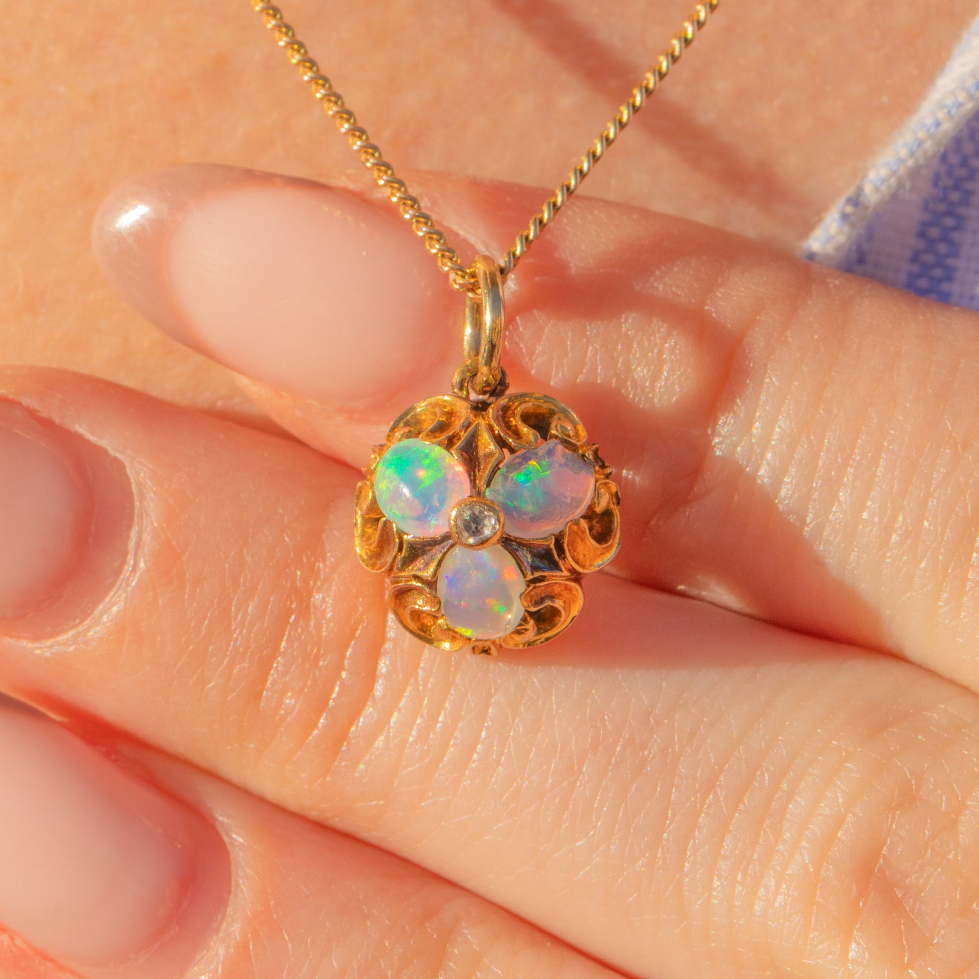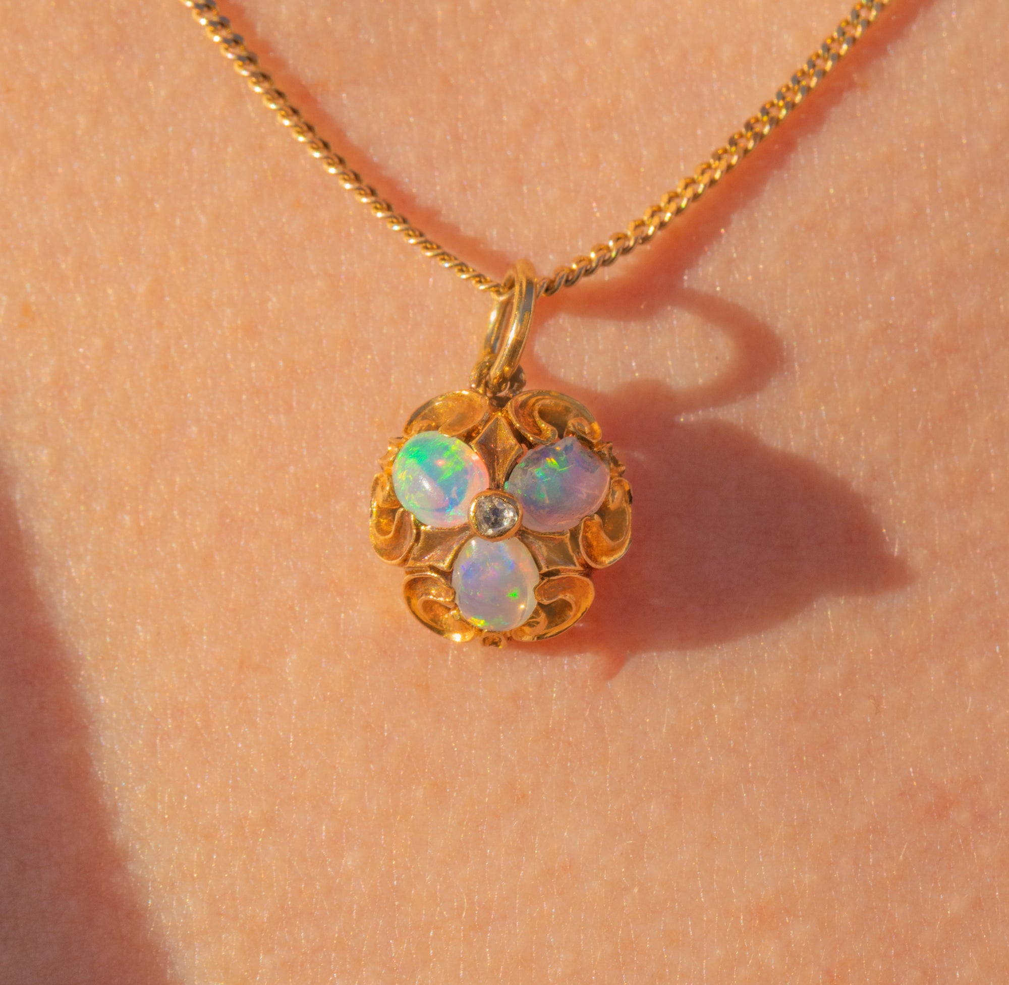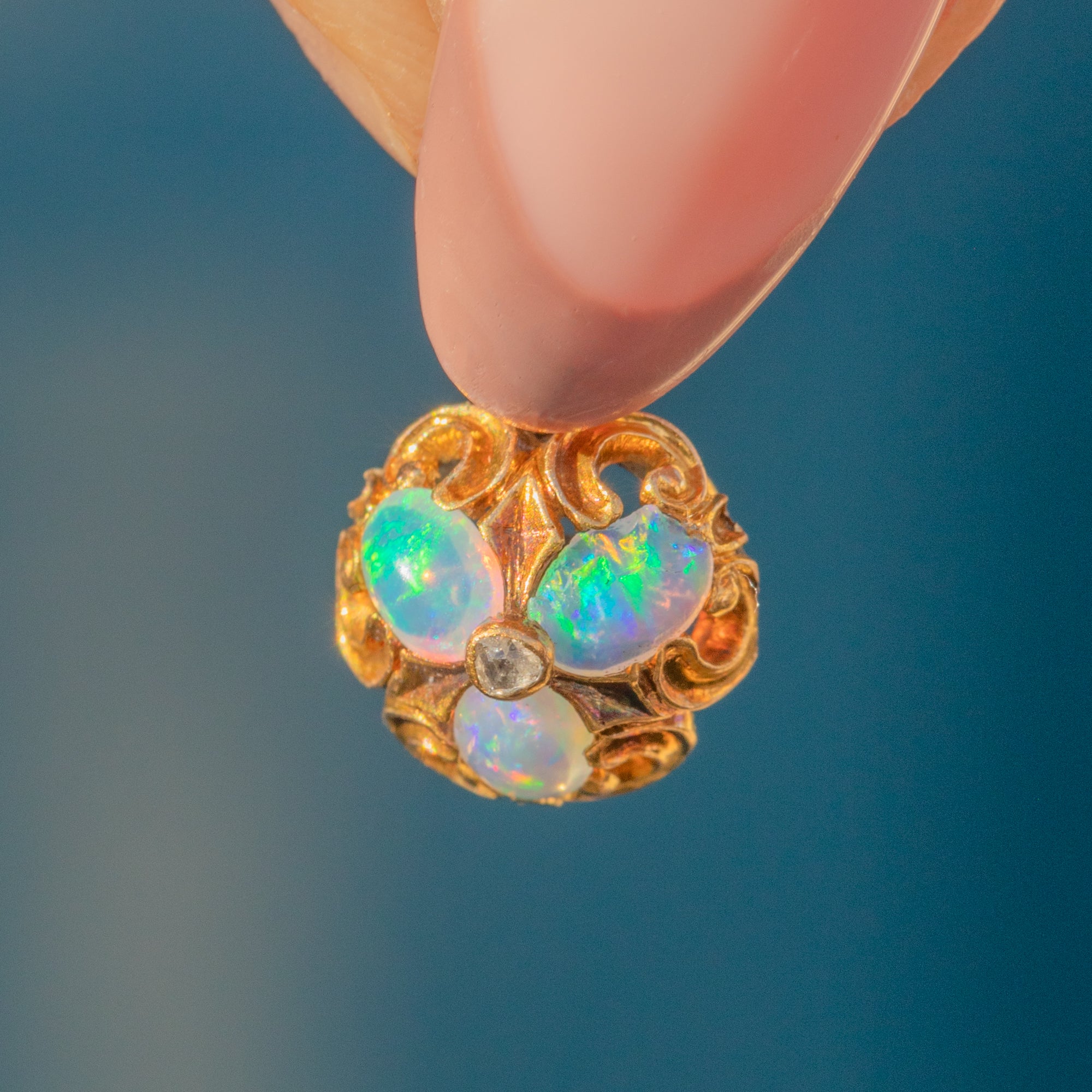 This antique 18ct Gold Opal Diamond cluster charm is a delectable little treasure from the Victorian era! Crafted from saturated 18ct Gold, this Victorian pendant boasts sweeping acanthus scrollwork framing the vibrant gemstone cluster, creating a treat for the eyes.