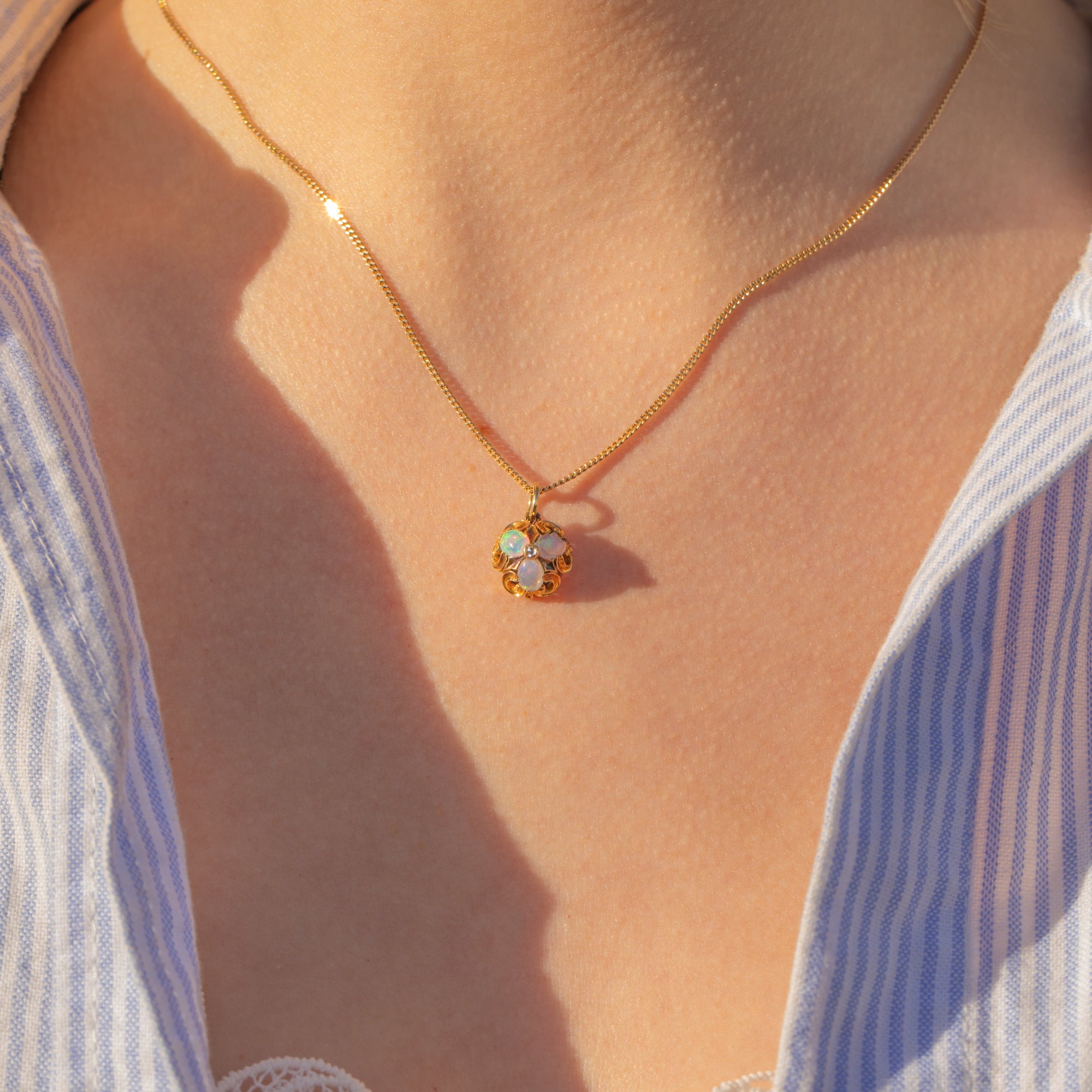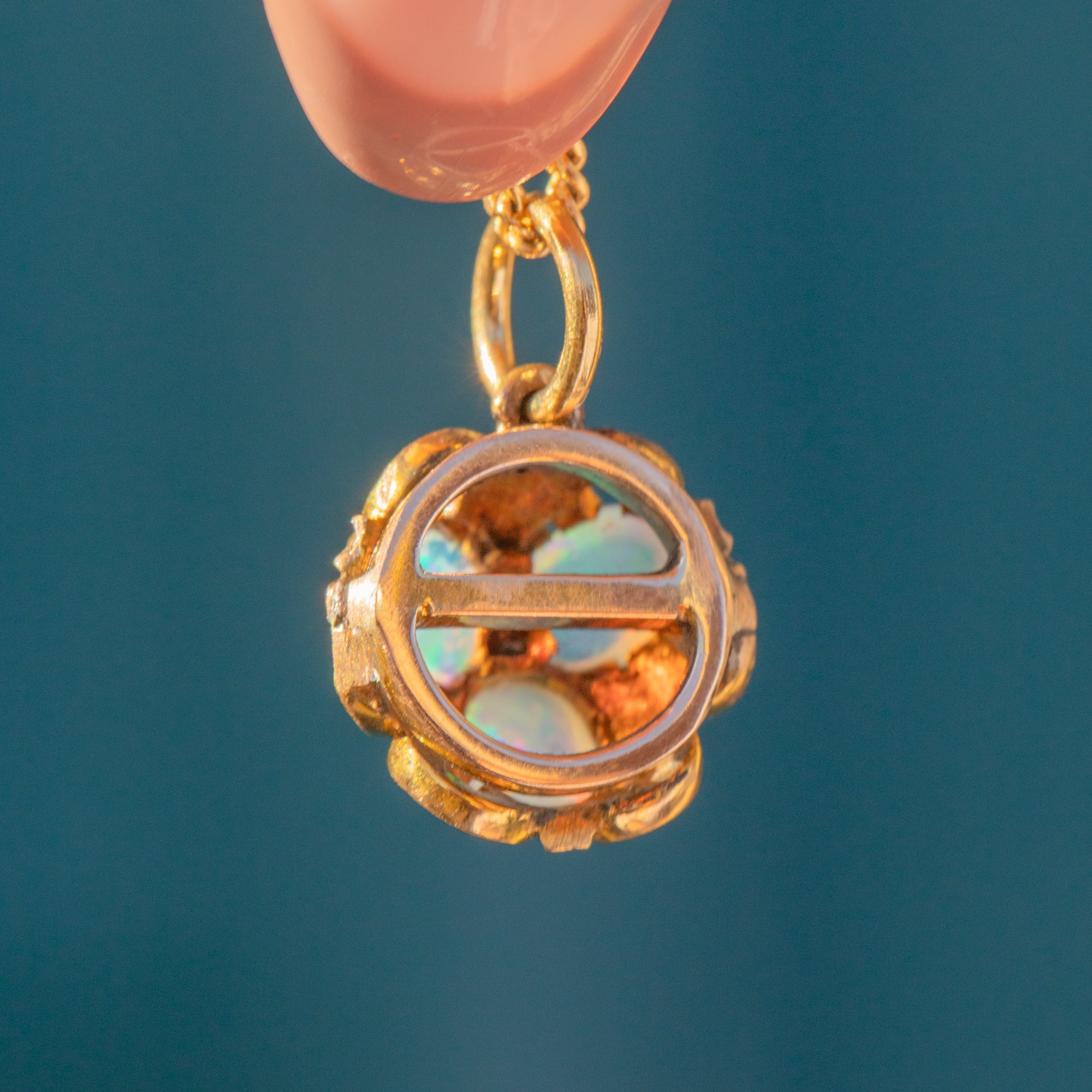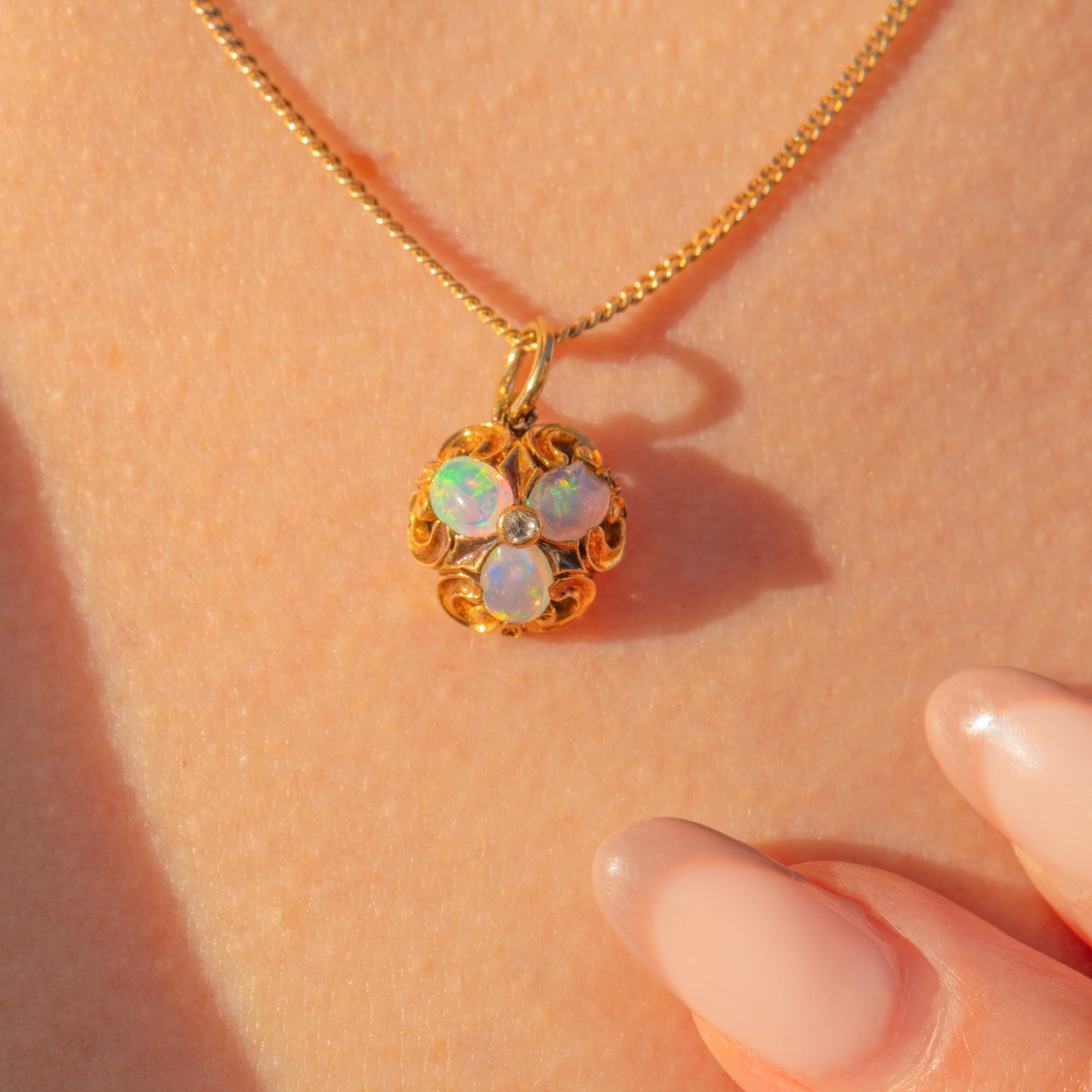 This antique 18ct Gold Opal Diamond cluster charm is a delectable little treasure from the Victorian era! Crafted from saturated 18ct Gold, this Victorian pendant boasts sweeping acanthus scrollwork framing the vibrant gemstone cluster, creating a treat for the eyes.