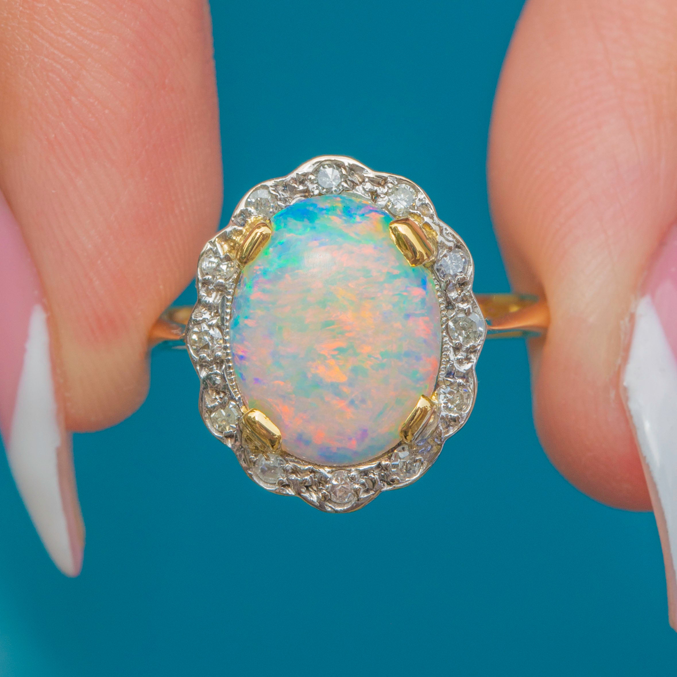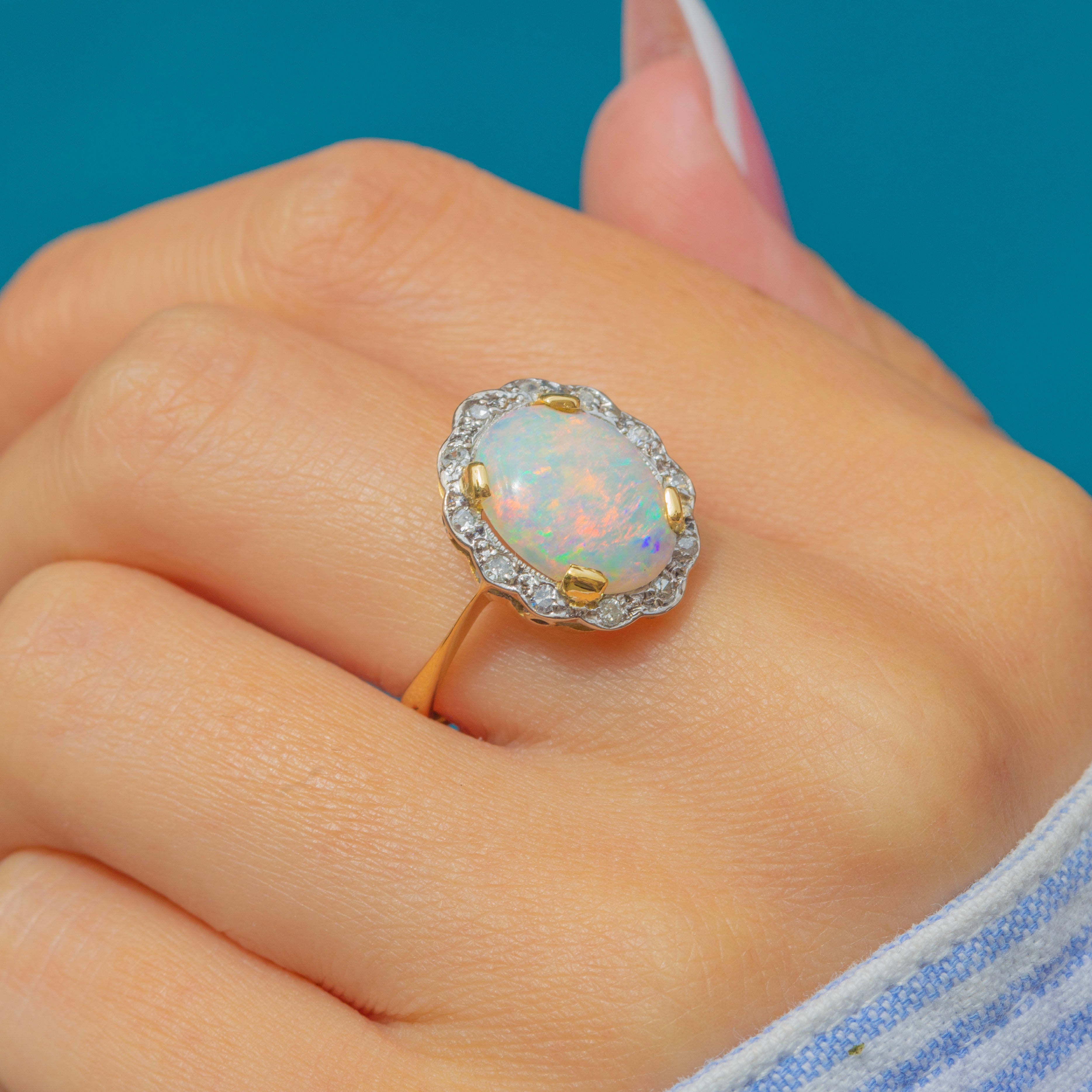 This elegant Edwardian cluster ring centres on a luminous oval 1.10 Opal with lively pastel flashes. The Opal is framed by a softly scalloped halo of Diamonds set in bright 18ct White Gold, with bold 18ct Yellow Gold claws adding warmth and contrast to the design.