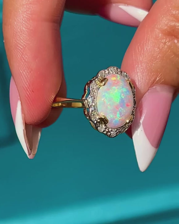 EXCELLENT: The oval Opal displays vibrant pastel flashes with no visible cracks or surface damage. The surrounding Diamonds are bright and intact, securely set in White Gold. The 18ct Gold claws and band show minimal wear and a well-preserved finish consistent with careful use. The ring’s structure is sound, and all settings are secure.