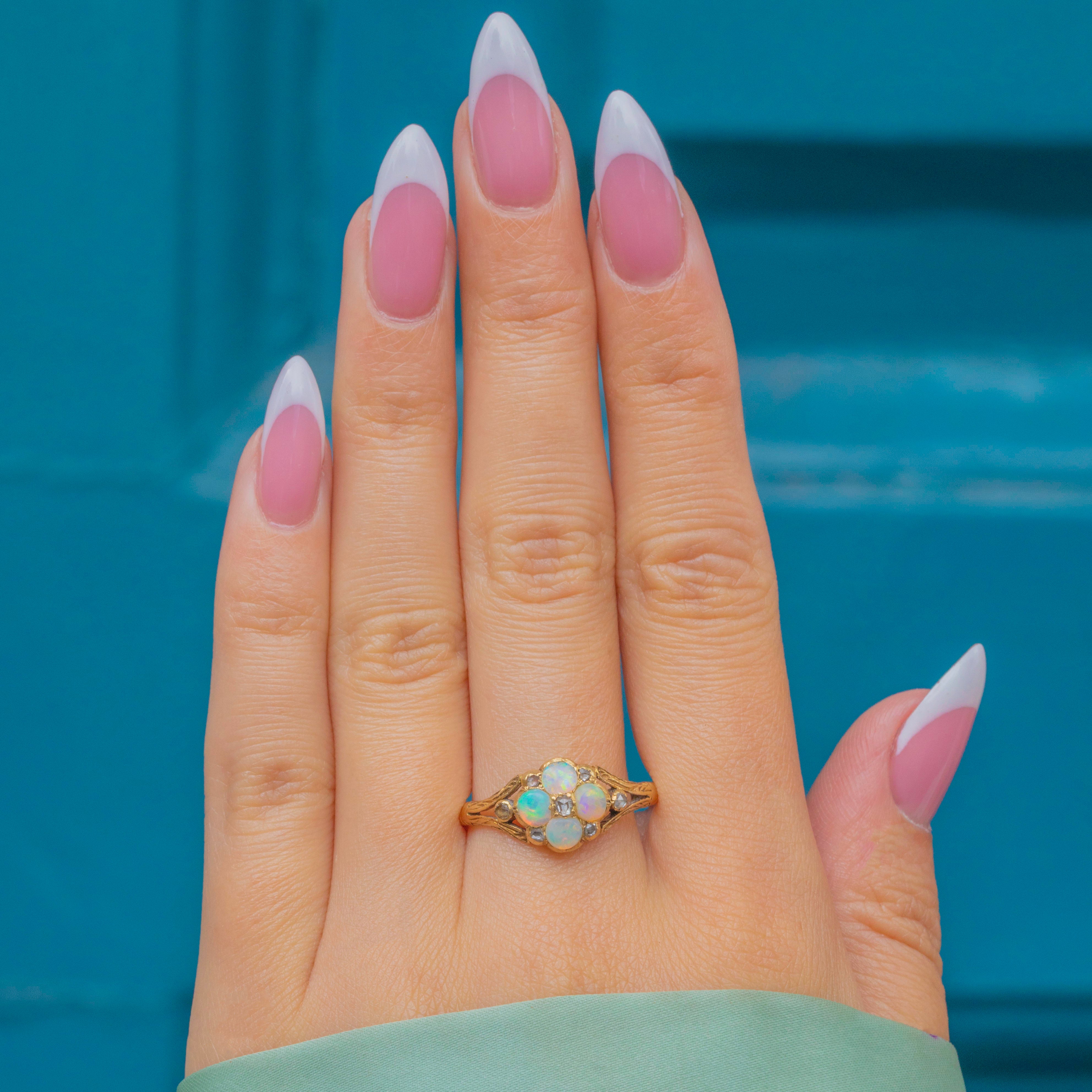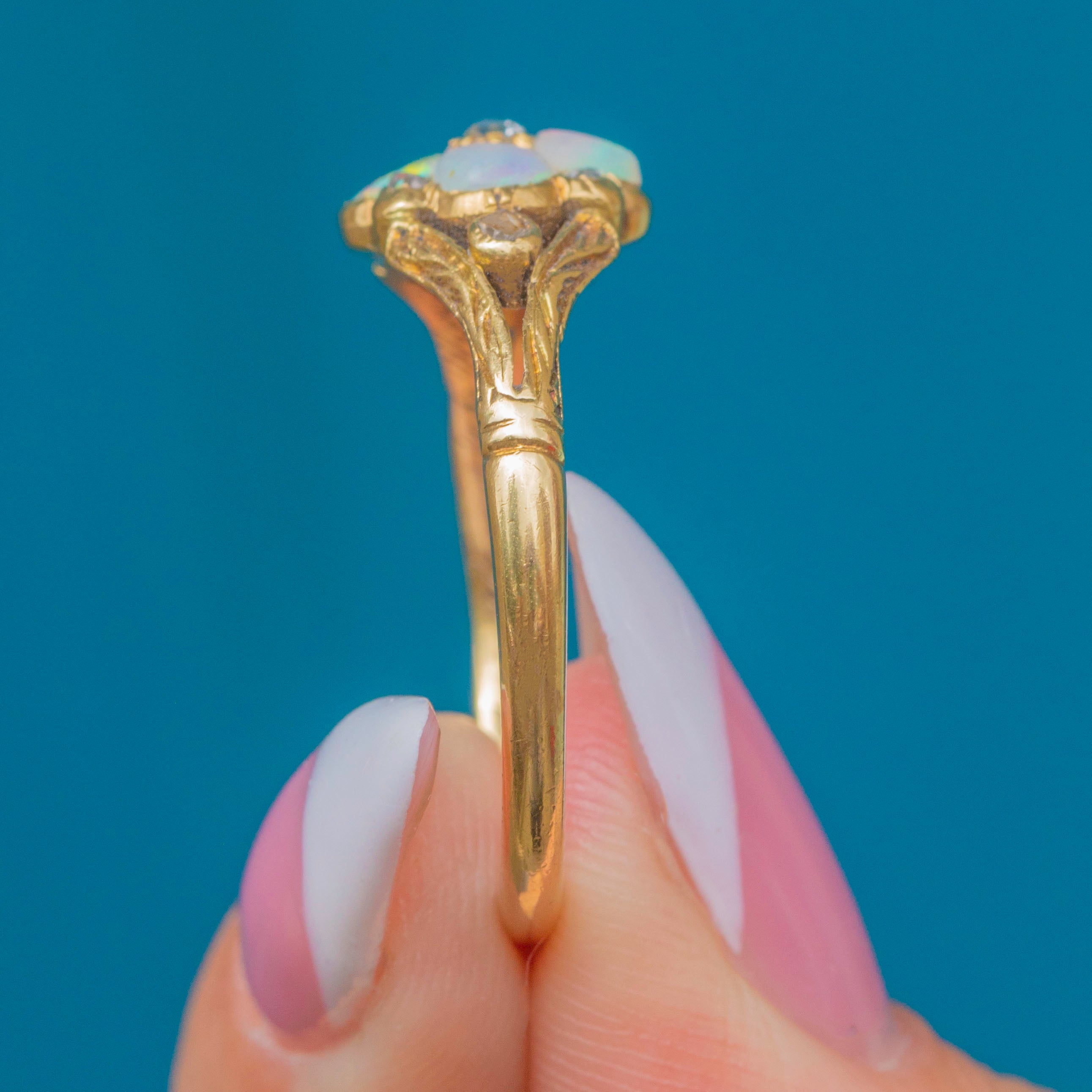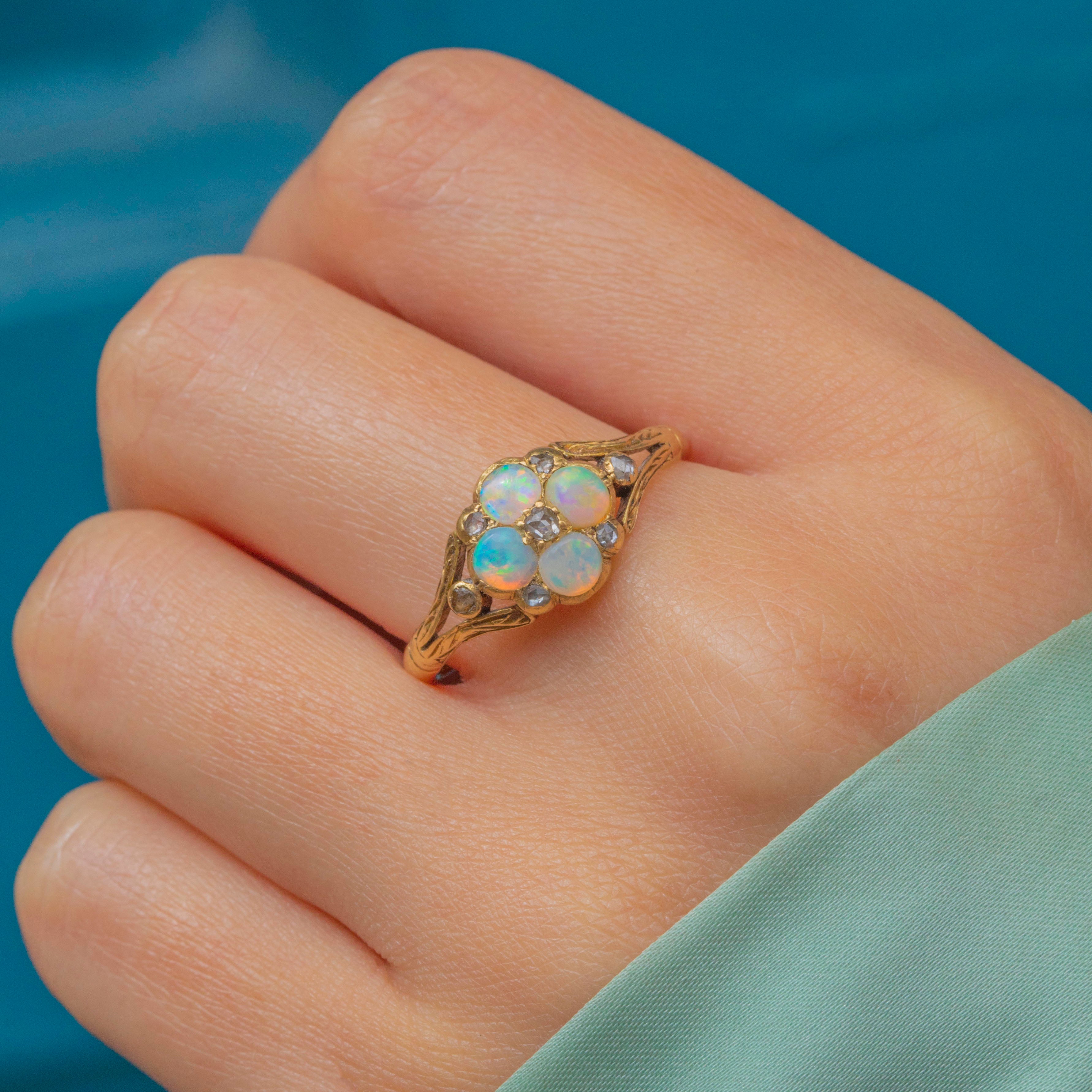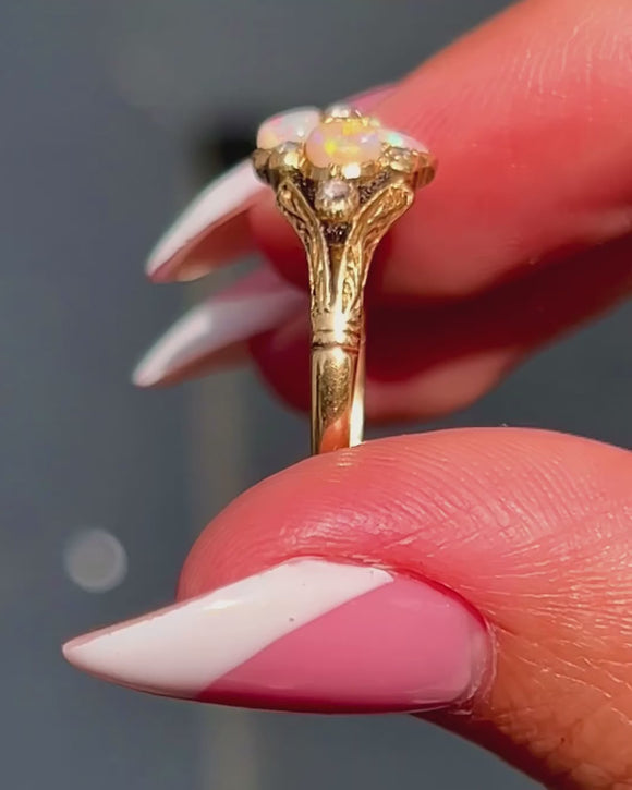 This adorable Victorian cluster ring has been formed into a delicate floral motif, comprised of four iridescent Opals adorned by seven scintillating rose-cut Diamonds.