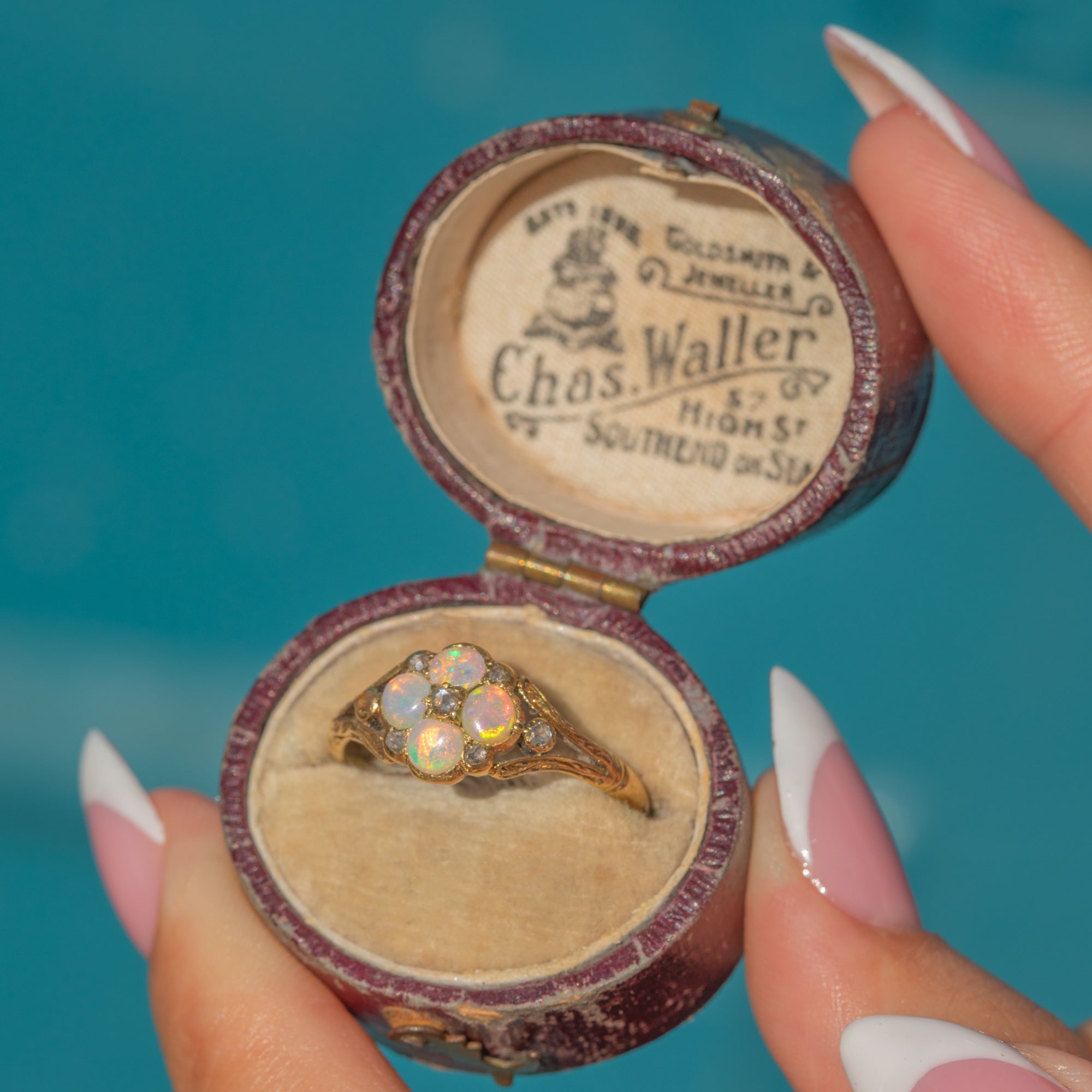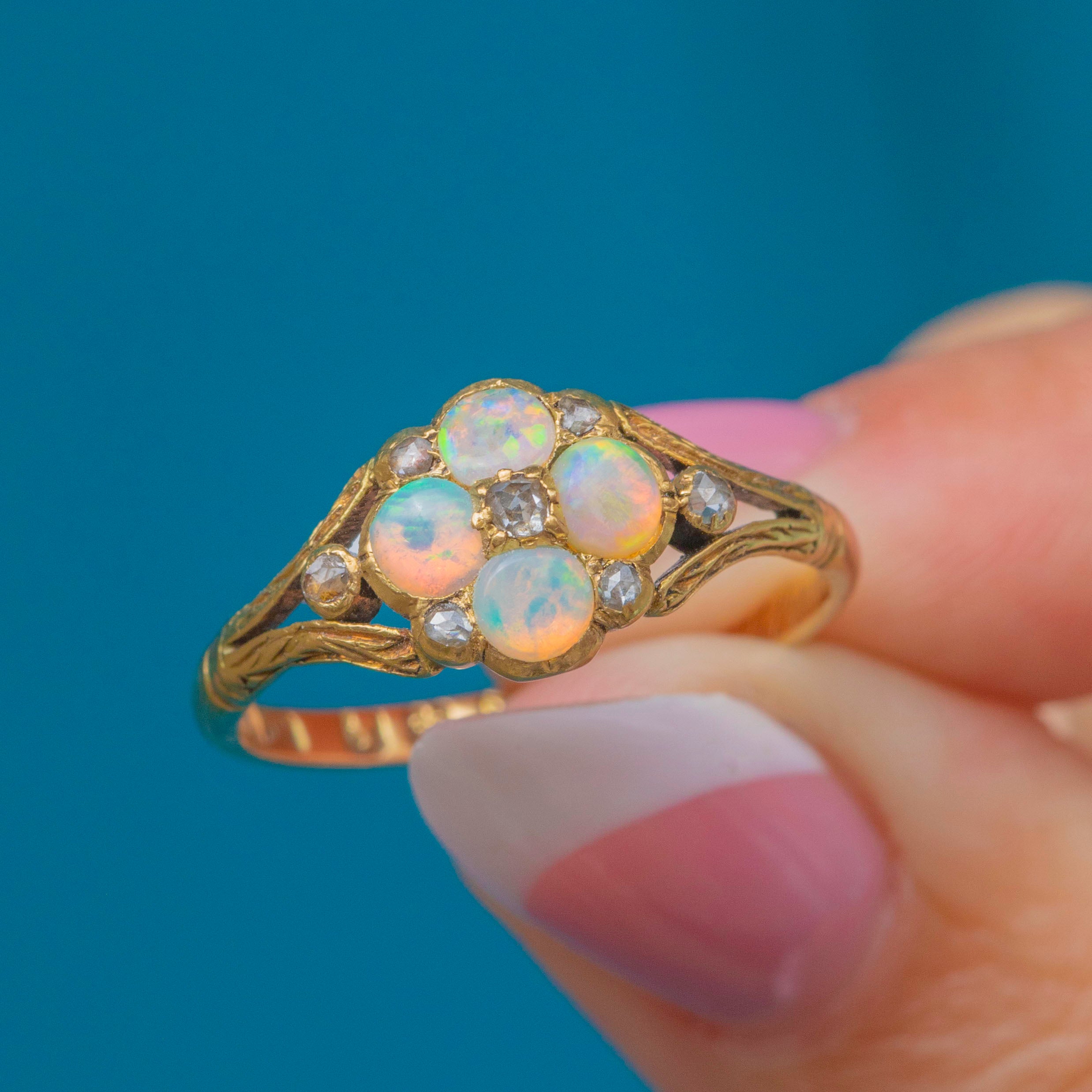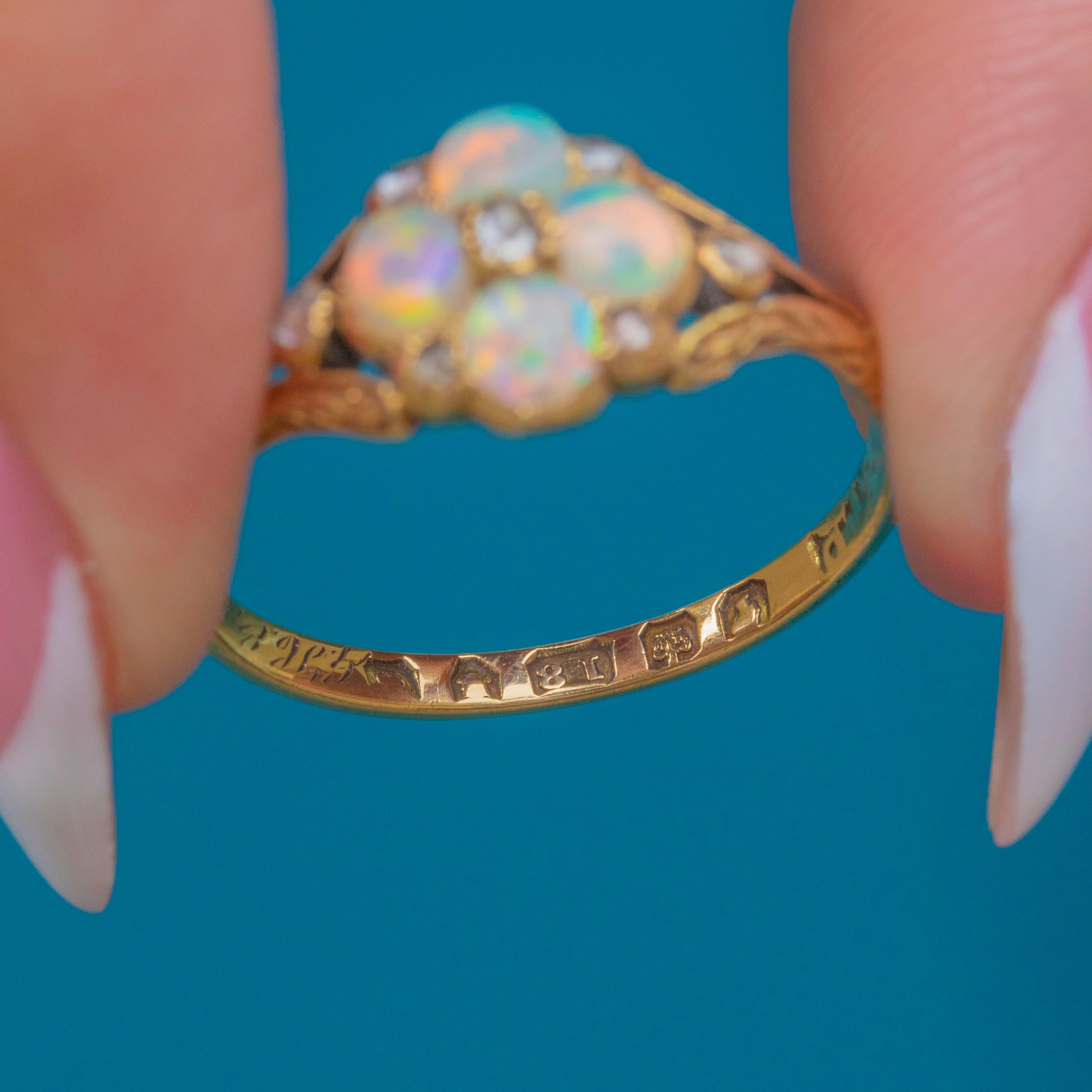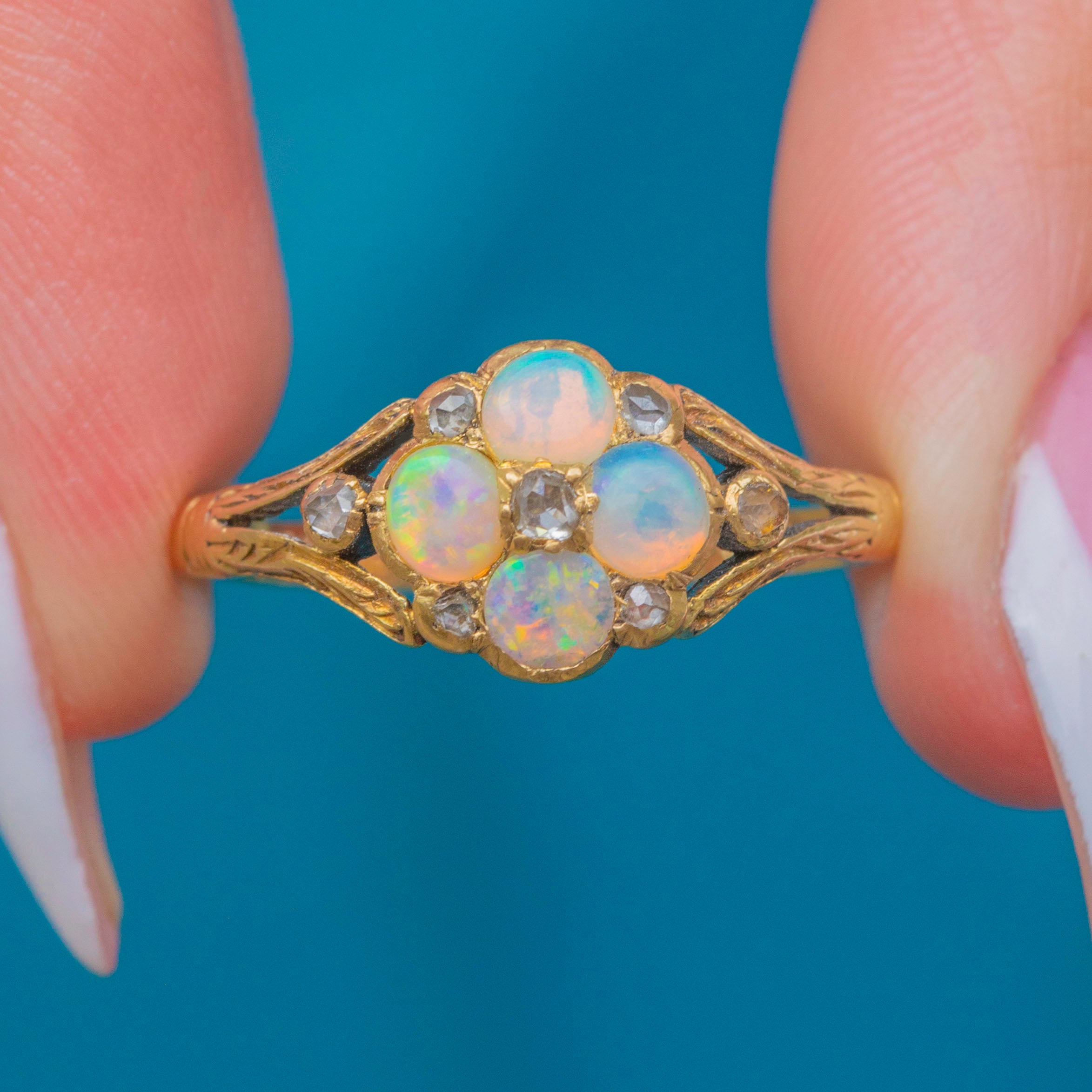 This adorable Victorian cluster ring has been formed into a delicate floral motif, comprised of four iridescent Opals adorned by seven scintillating rose-cut Diamonds.