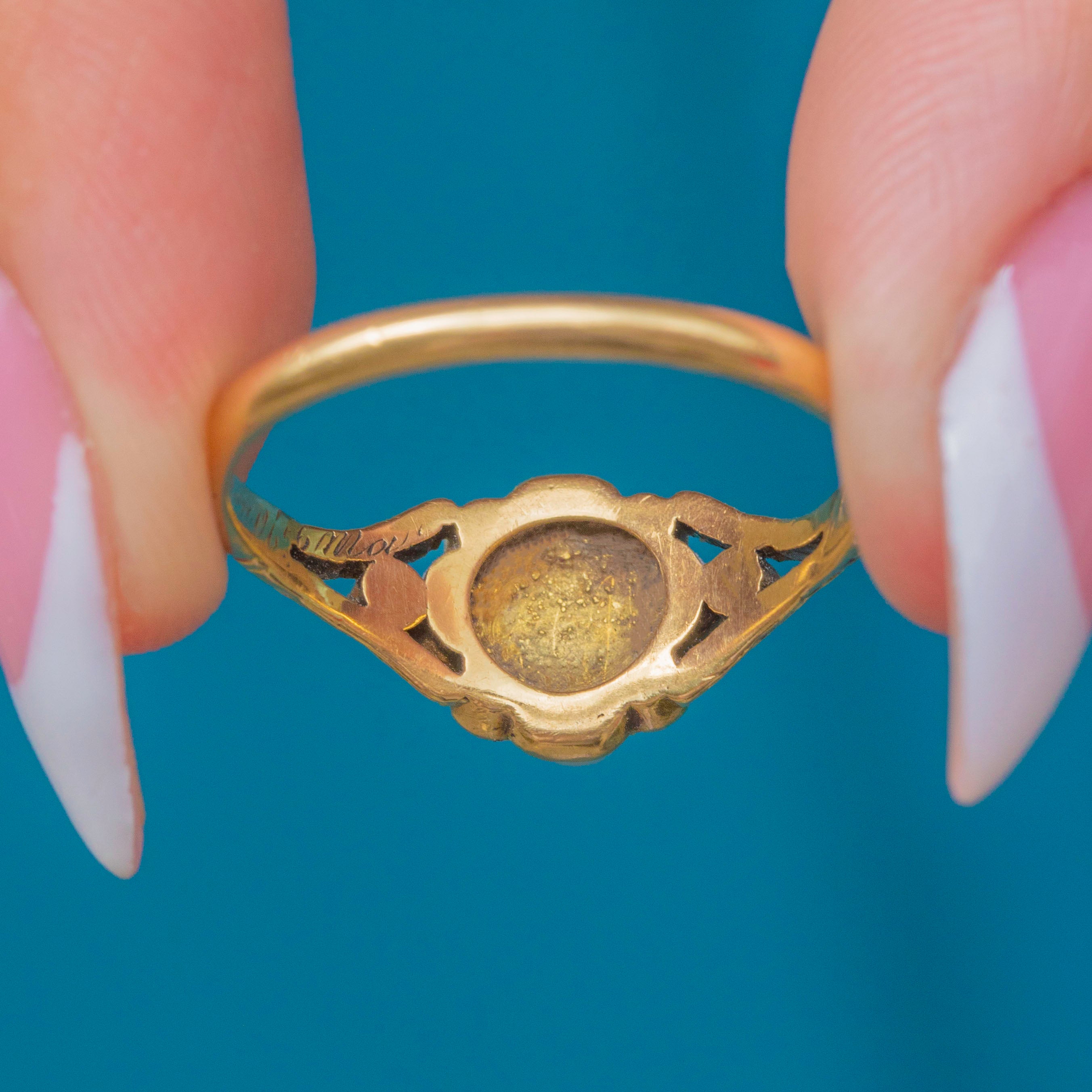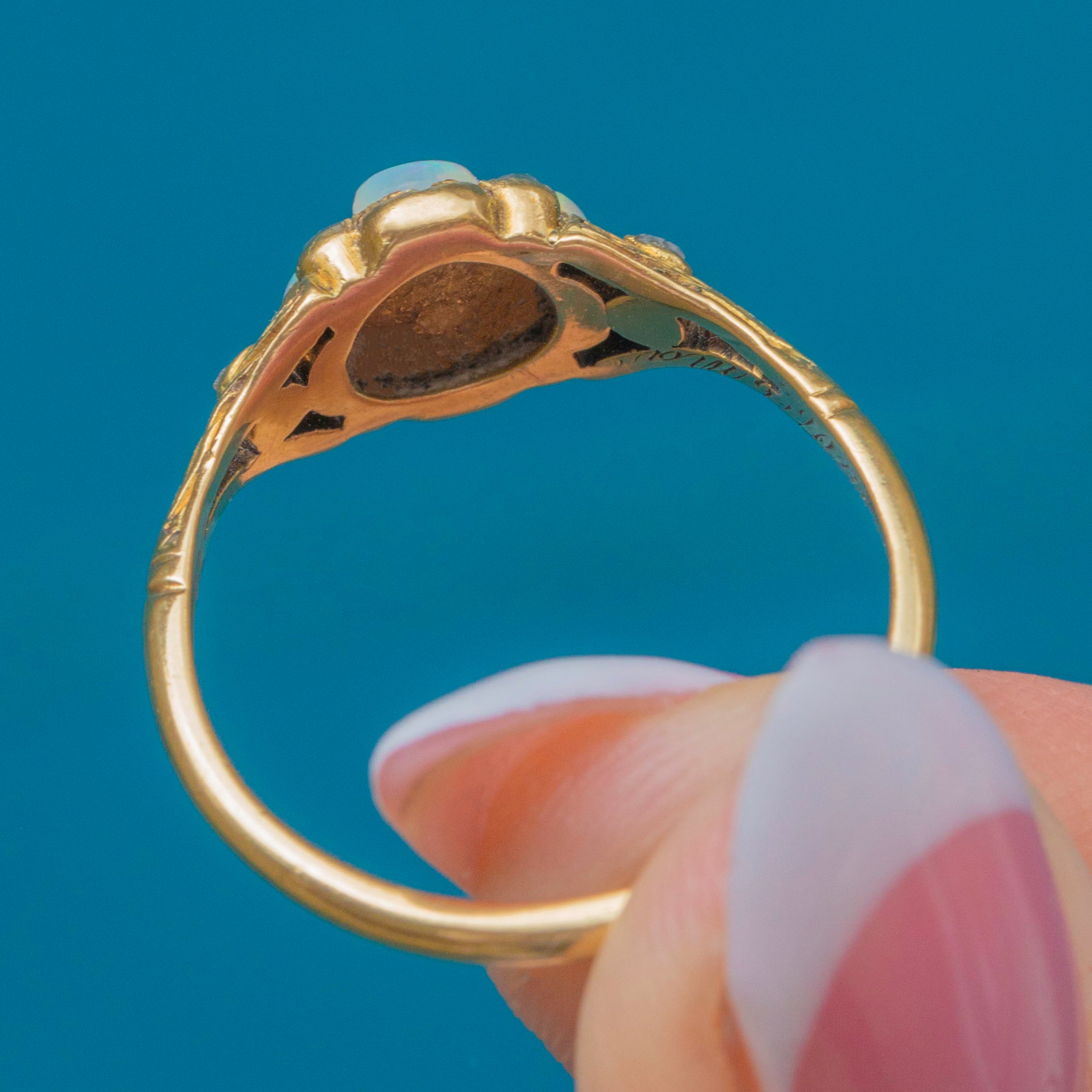 Each gemstone is set in buttery 18ct Gold, with the intricately engraved shoulders providing an enchanting texture. Complete with an inscribed inner band, this antique ring radiates quintessential Victorian charm.