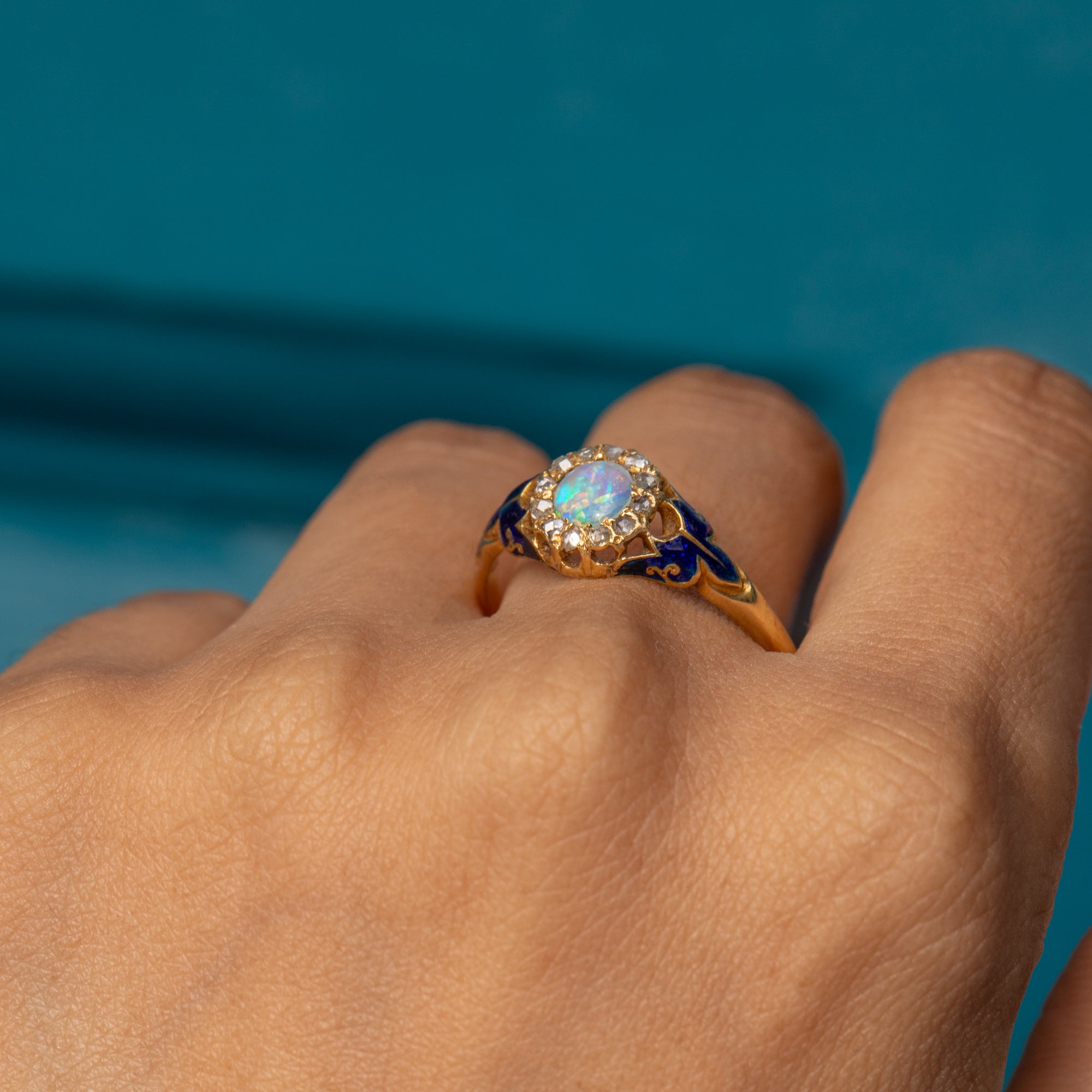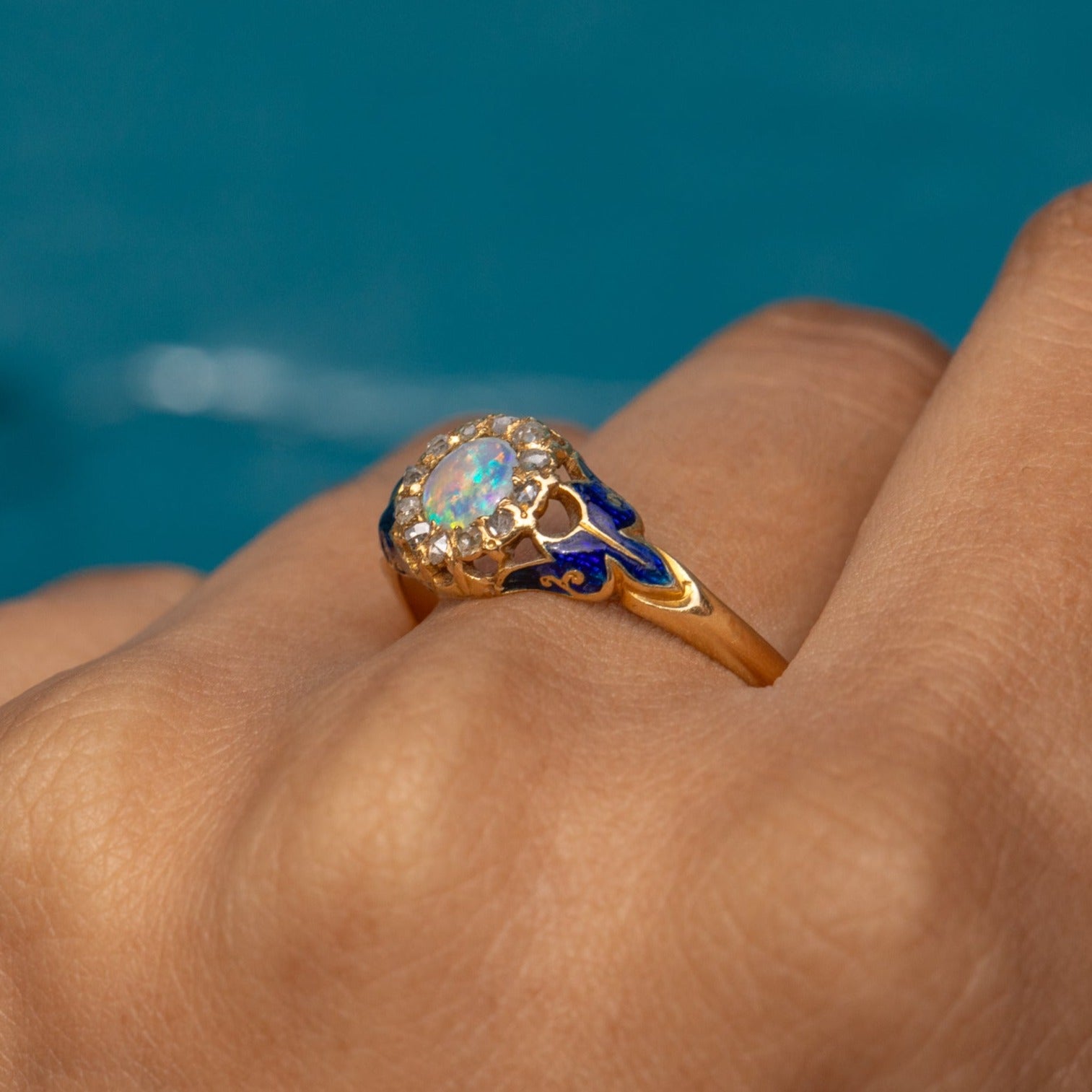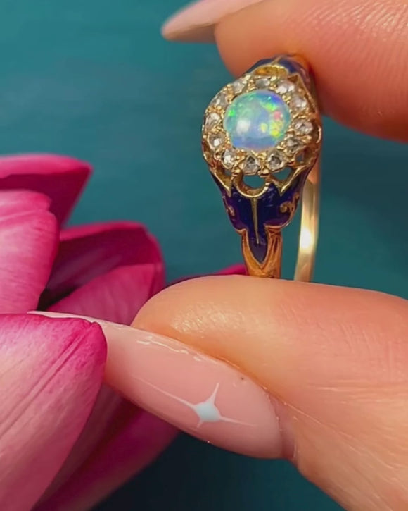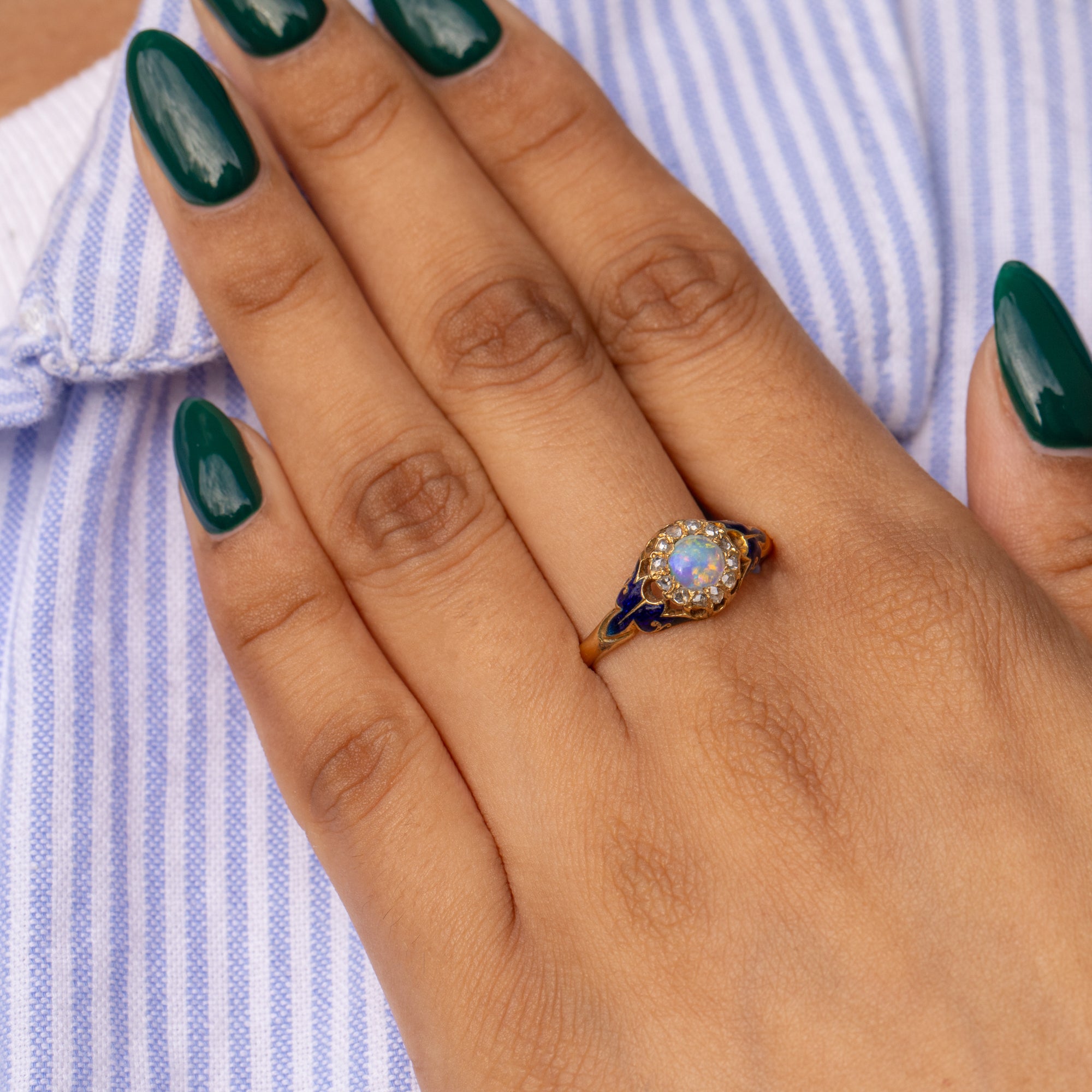 Bague antique en or 18 carats avec opale et diamant, épaules émaillées bleues vers 1860