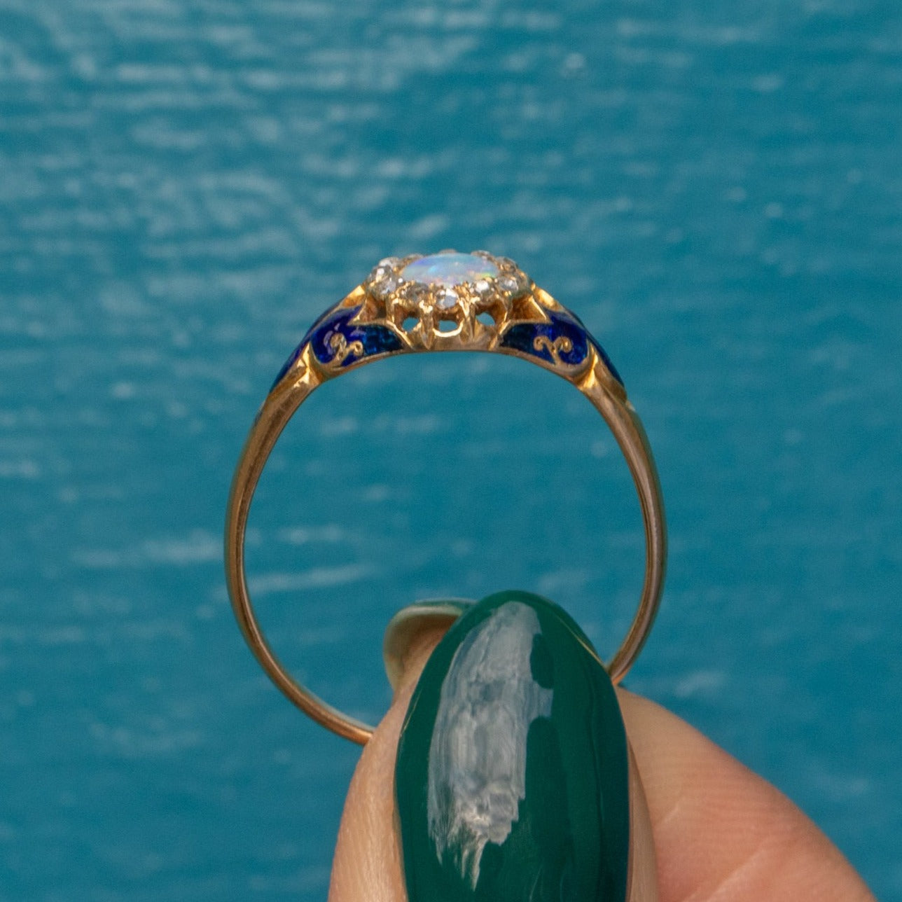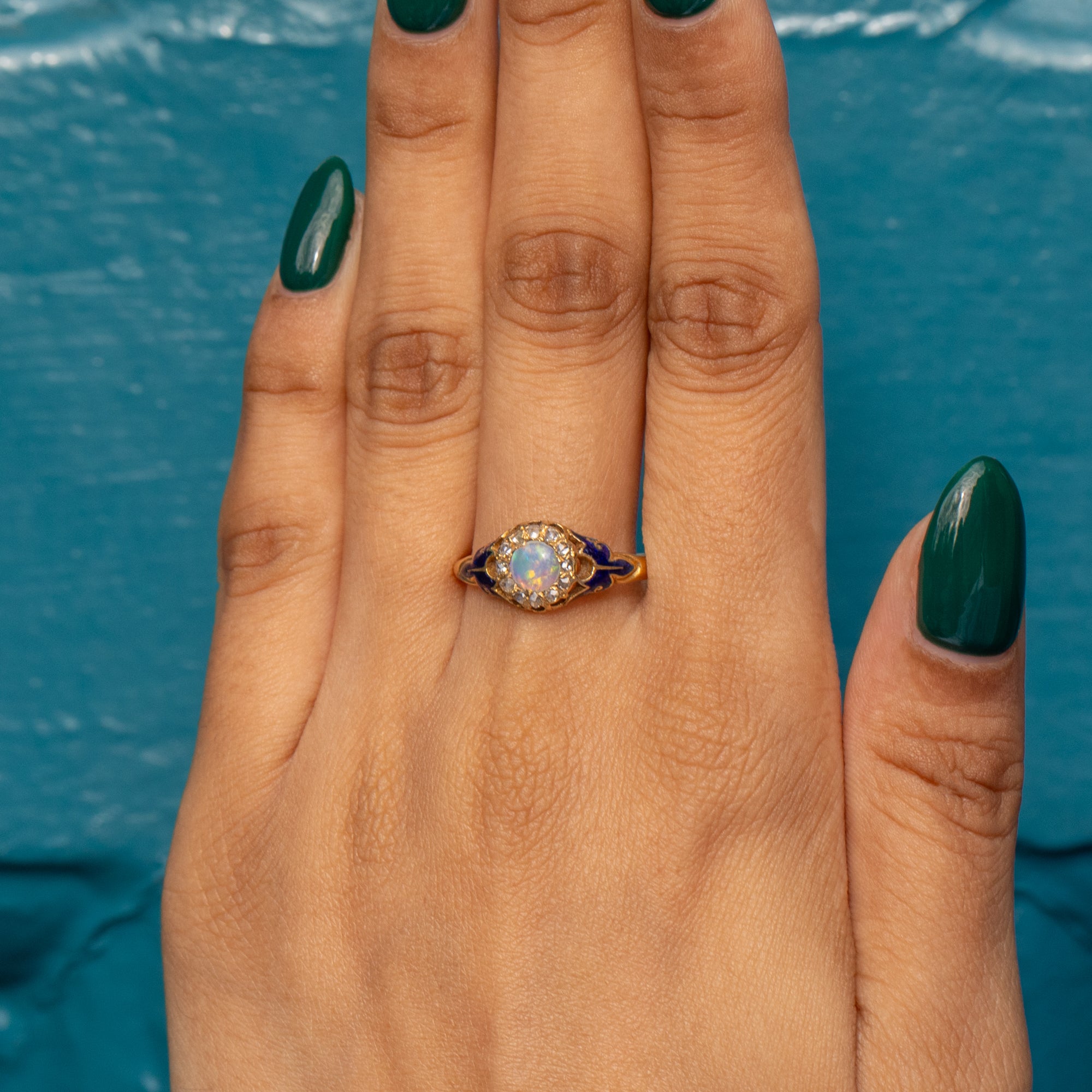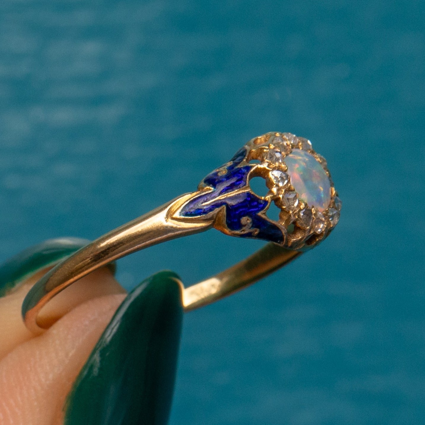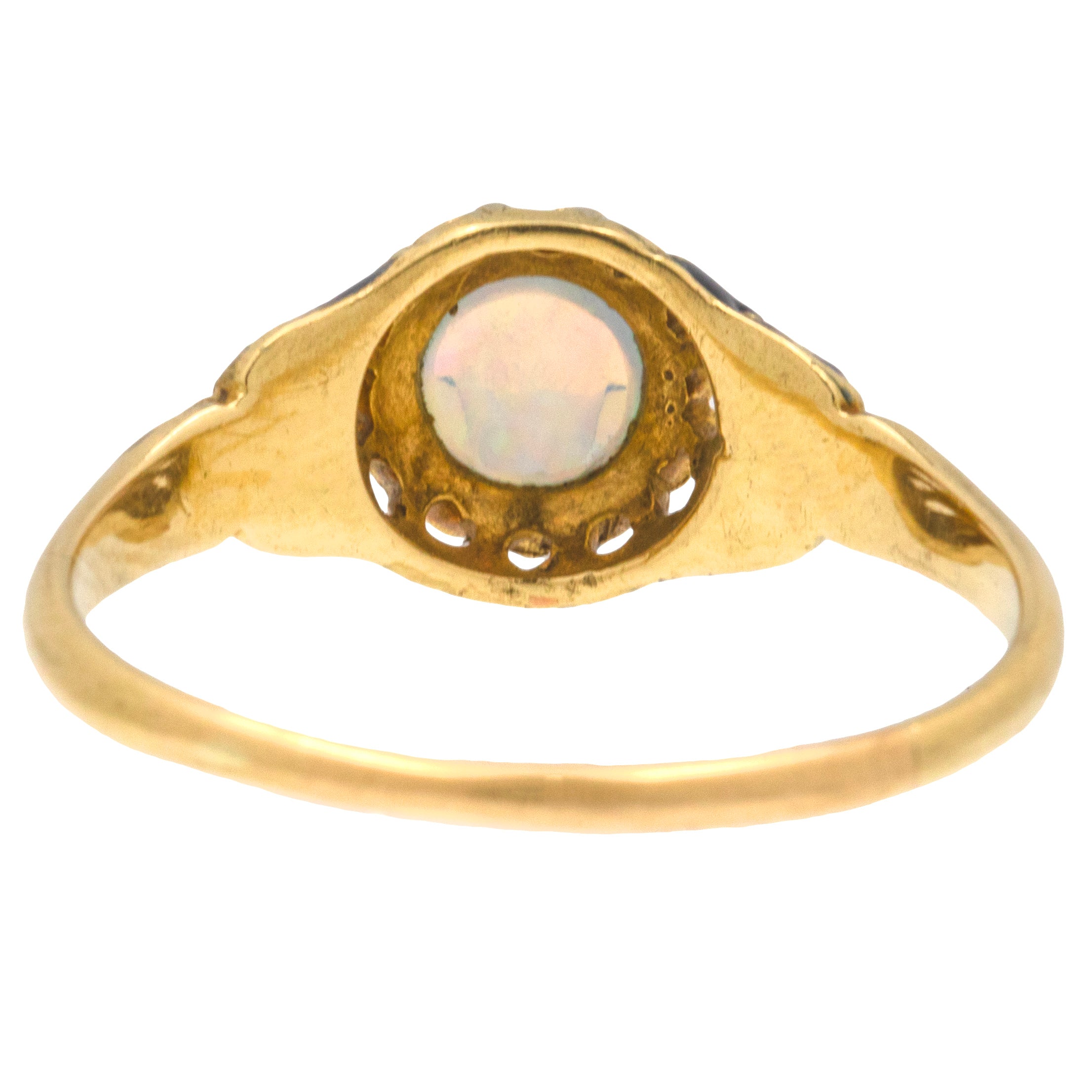 Bague antique en or 18 carats avec opale et diamant, épaules émaillées bleues vers 1860