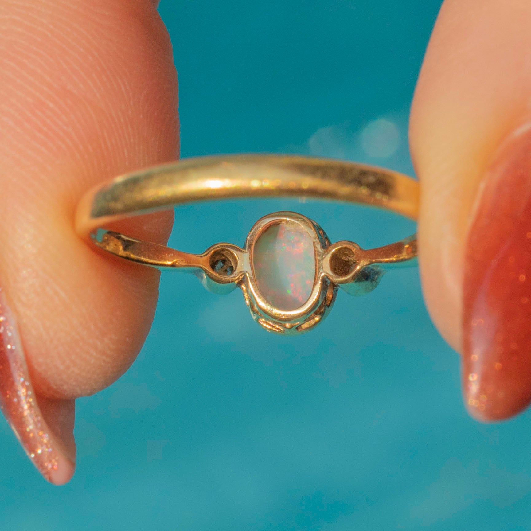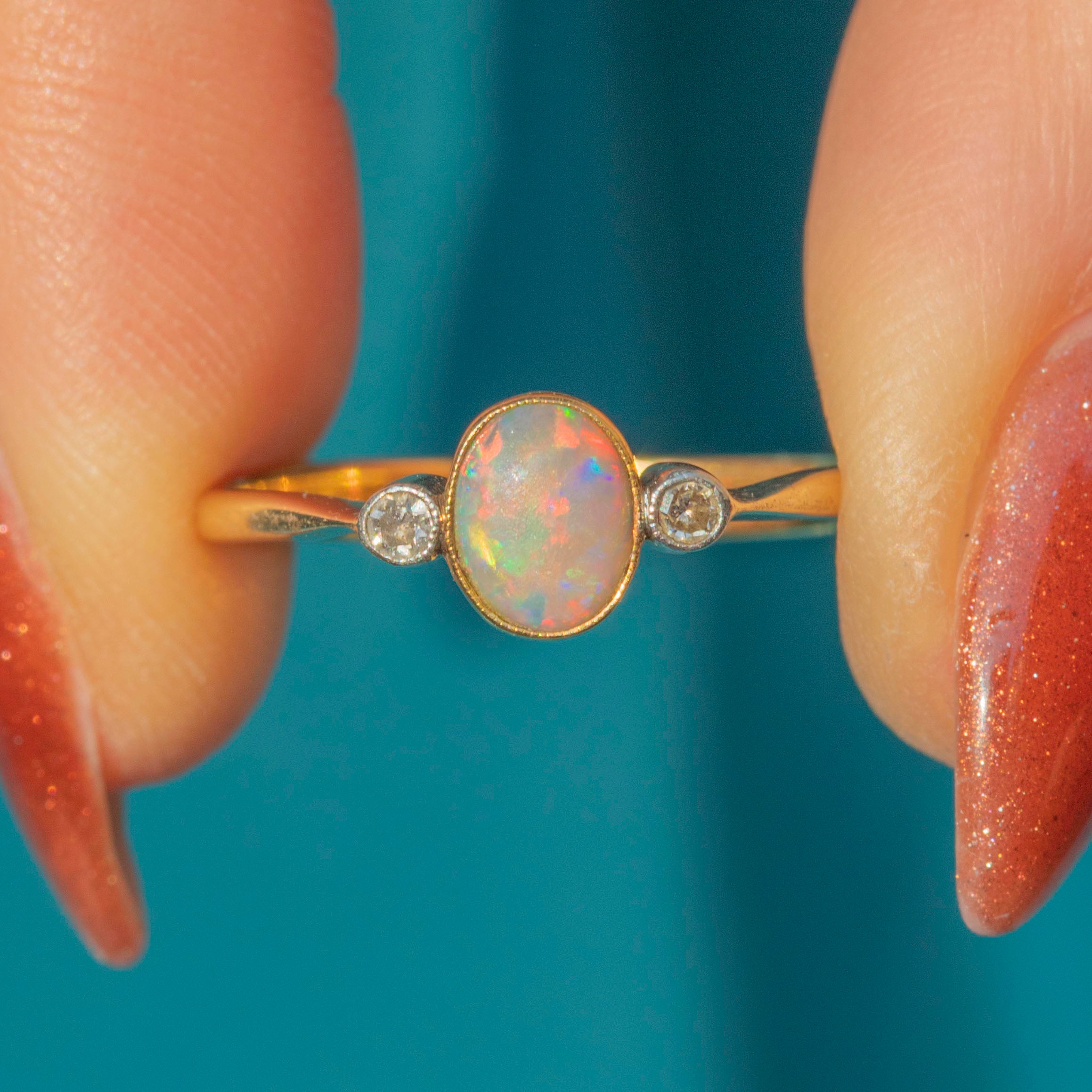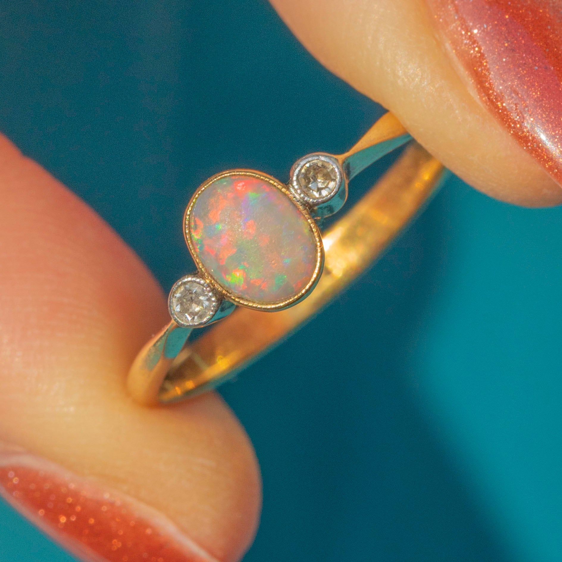 This exquisite antique 18ct Gold Opal Diamond three stone ring is gorgeous! Delicate and elegant this Edwardian ring boasts a stunning Opal, radiating coral and green hues as she catches the light. She is flanked by two petite Diamonds, their twinkle effortlessly complimenting the iridescence of the Opal.