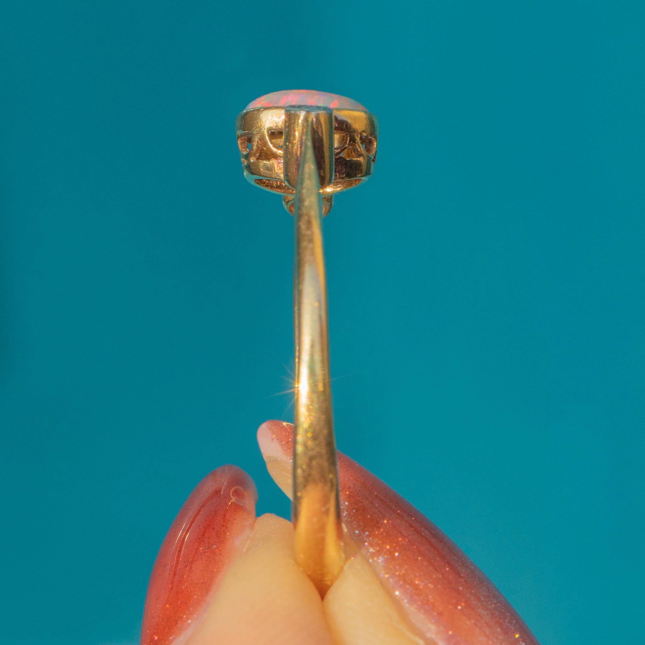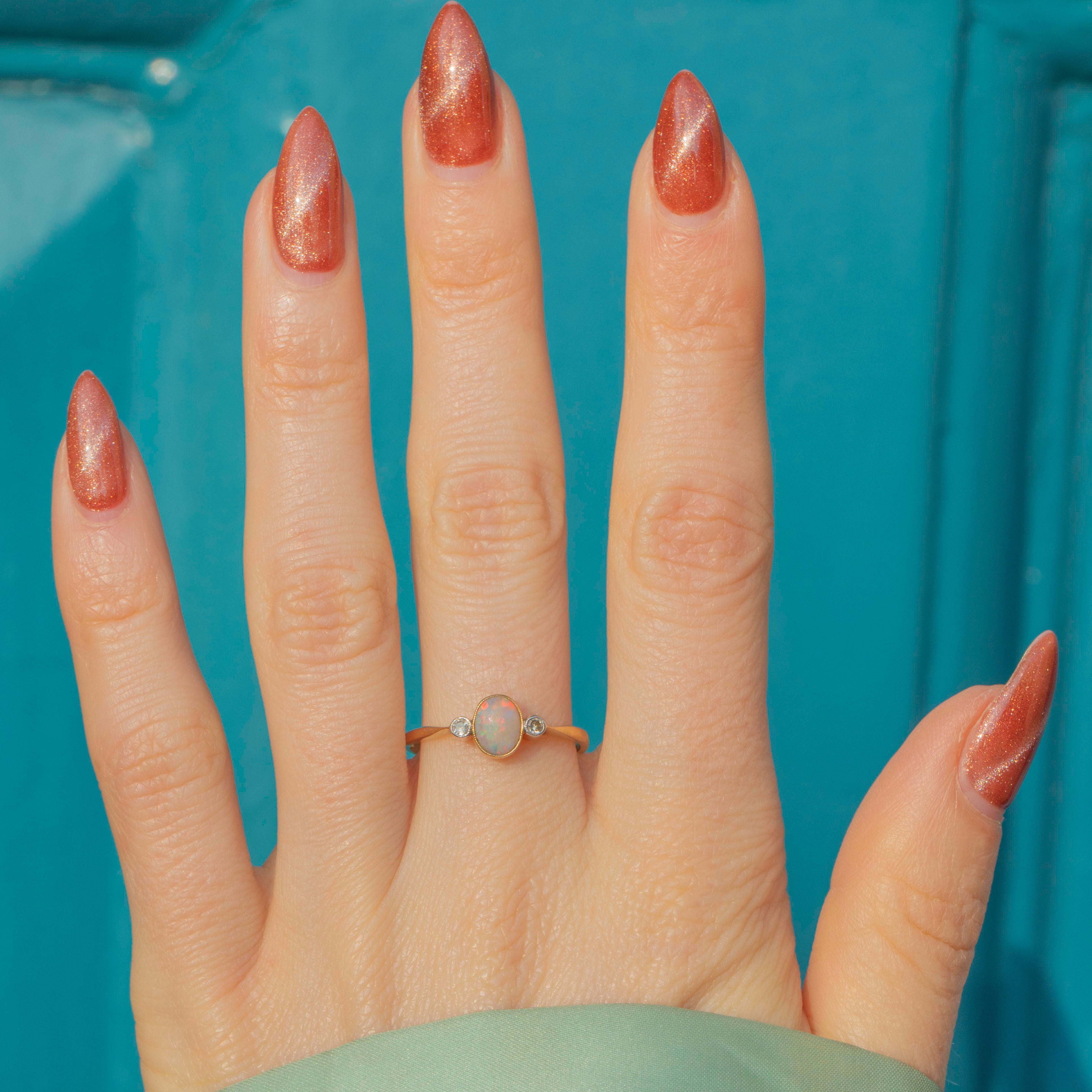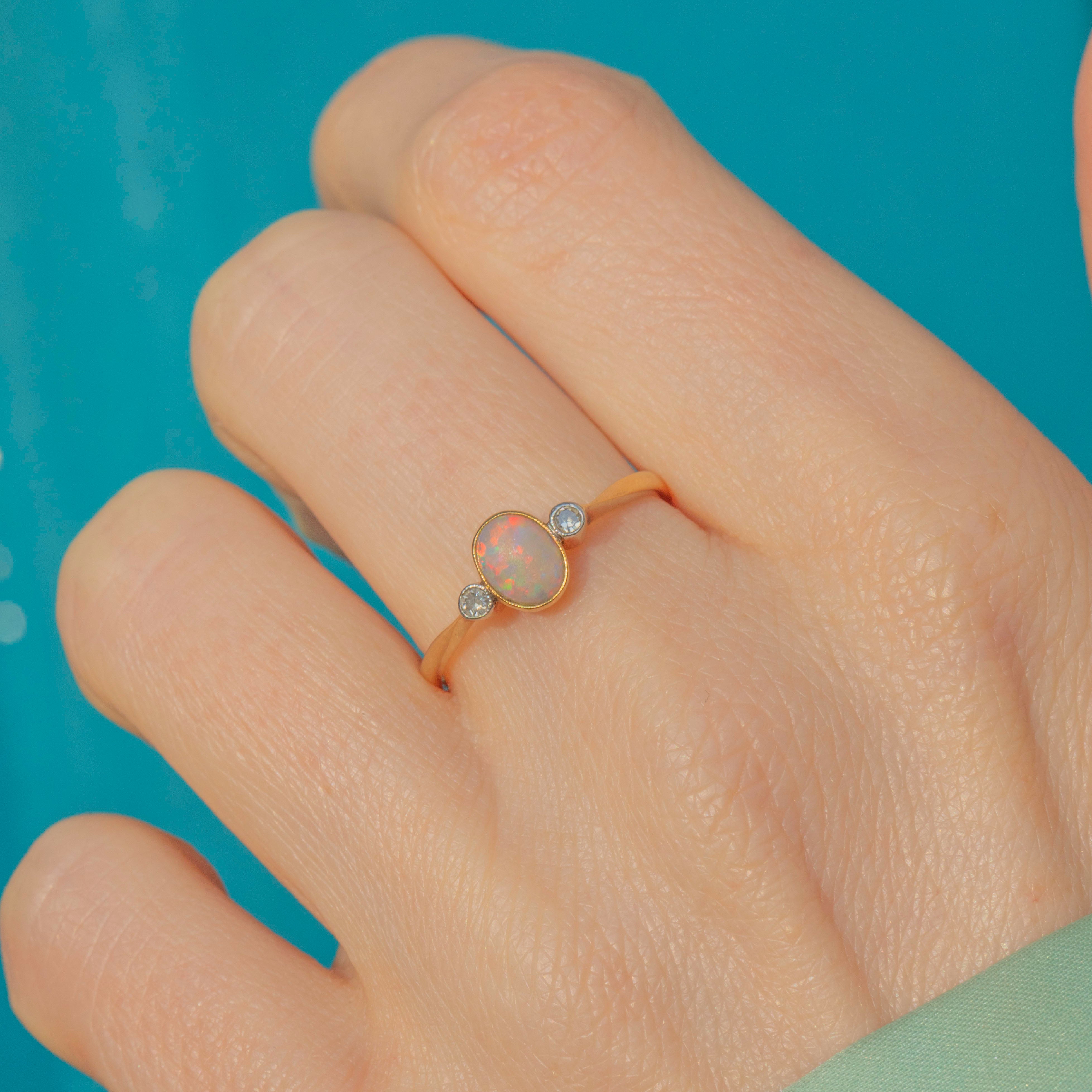 This exquisite antique 18ct Gold Opal Diamond three stone ring is gorgeous! Delicate and elegant this Edwardian ring boasts a stunning Opal, radiating coral and green hues as she catches the light. She is flanked by two petite Diamonds, their twinkle effortlessly complimenting the iridescence of the Opal.
