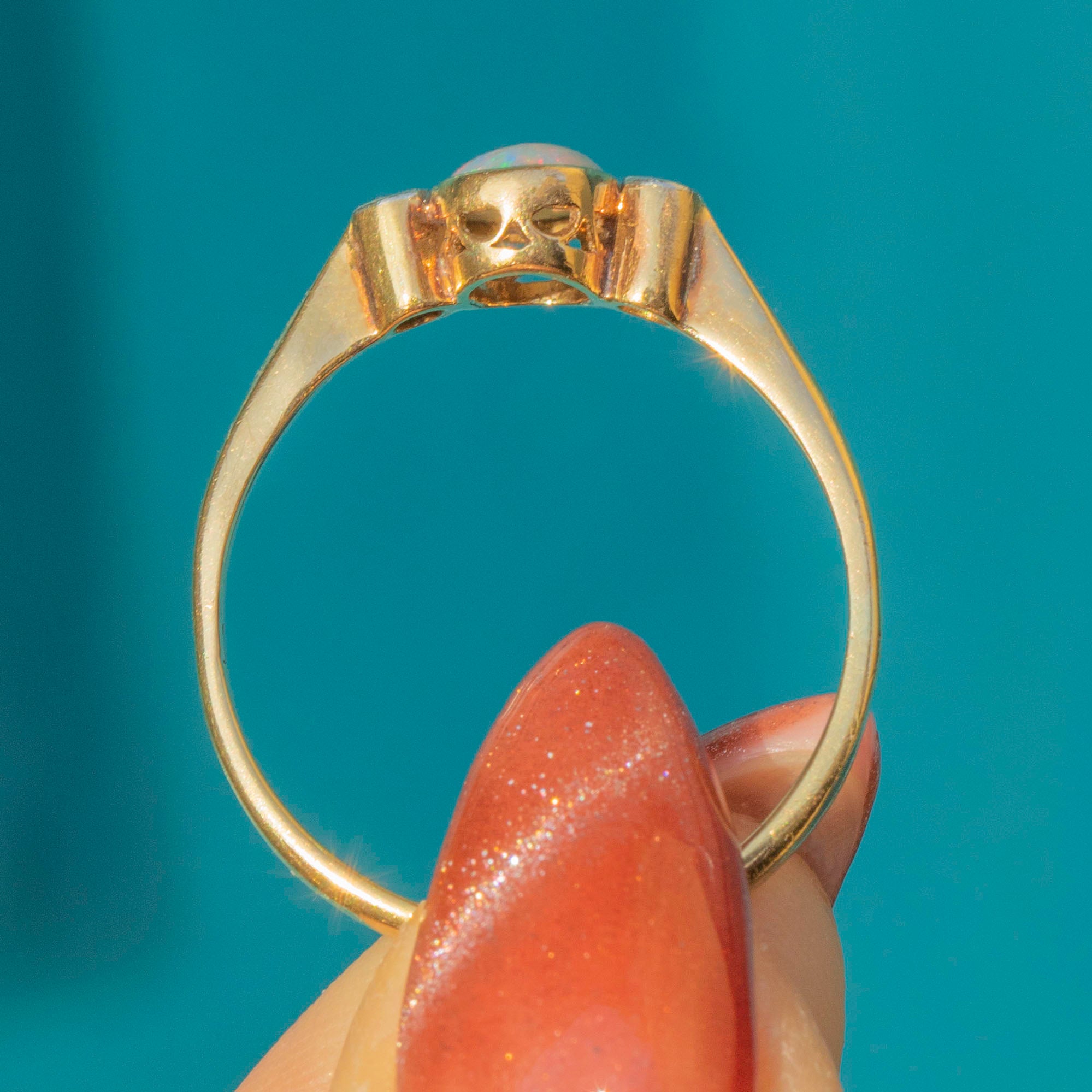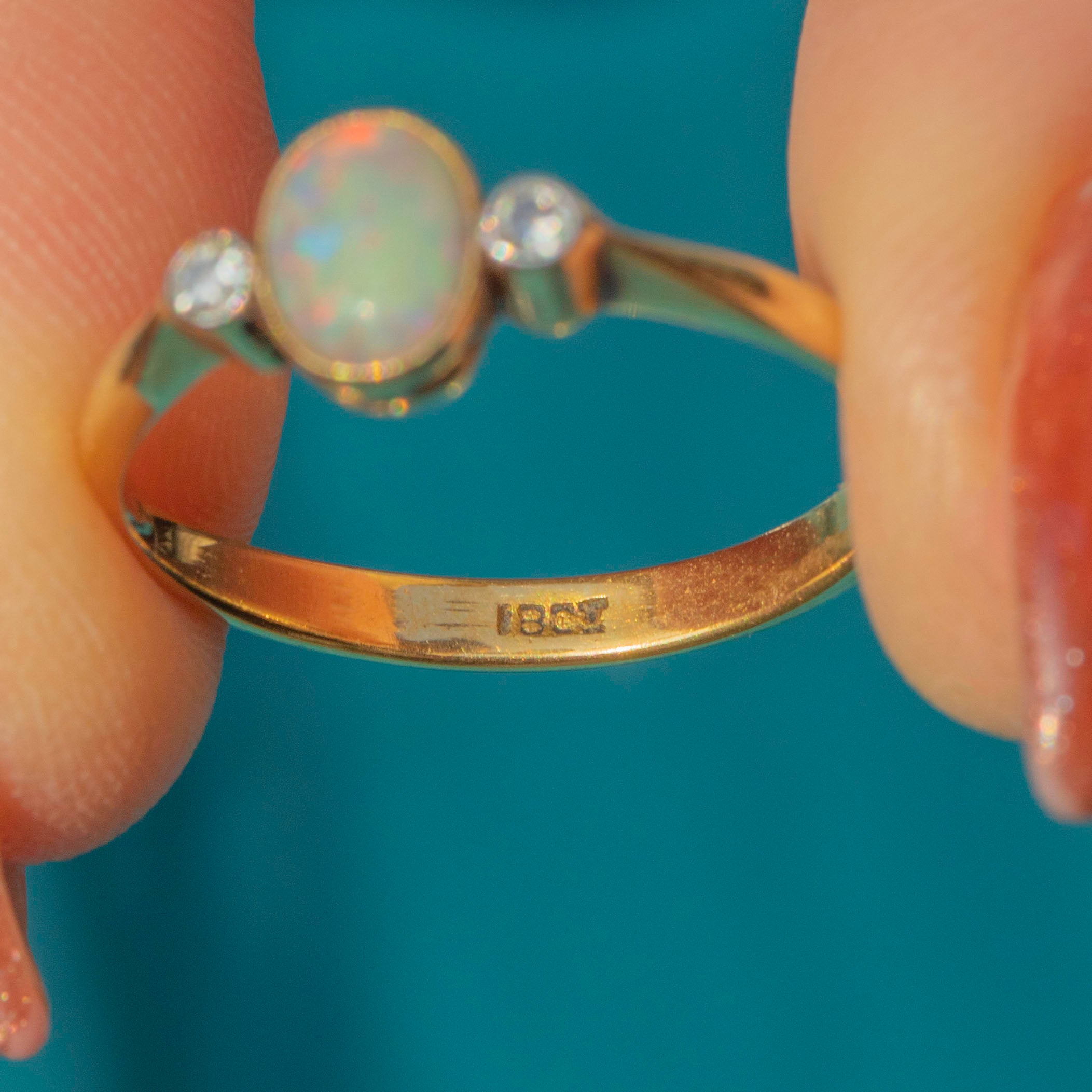 VERY GOOD: This exquisite antique 18ct Gold Opal Diamond three stone ring is in very good condition. There is some surface wear to the Opal and discolouration to the settings, however this is commensurate with age. Each gemstone is set securely within their bezels and with a secure band, you can wear her with confidence.