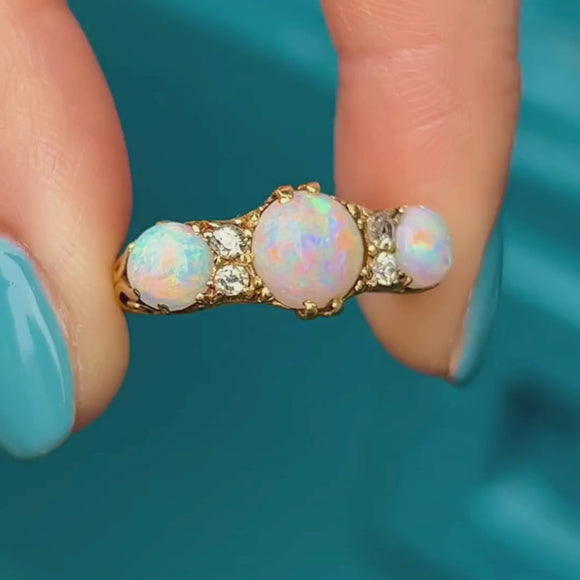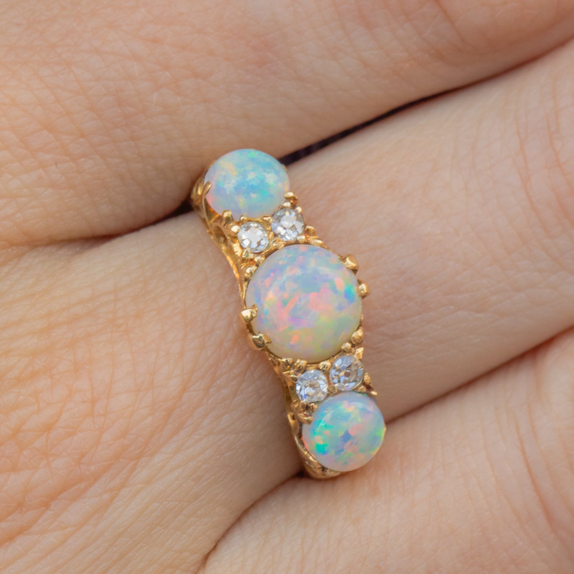 EXCELLENT. This antique 18ct Gold Opal Diamond three stone ring is in very good condition. The 18ct Gold is buttery and the shank is solid and sturdy, having retained its rounded shape well over the years. Her Opals have magnificent hues and are smoothly cut, free from chips or scuffs. Each Diamond spacer adds a subtle twinkle and is free from fleabites. A treasure from 1897, this splendid Victorian ring will add undeniable decadence to your ring stack!