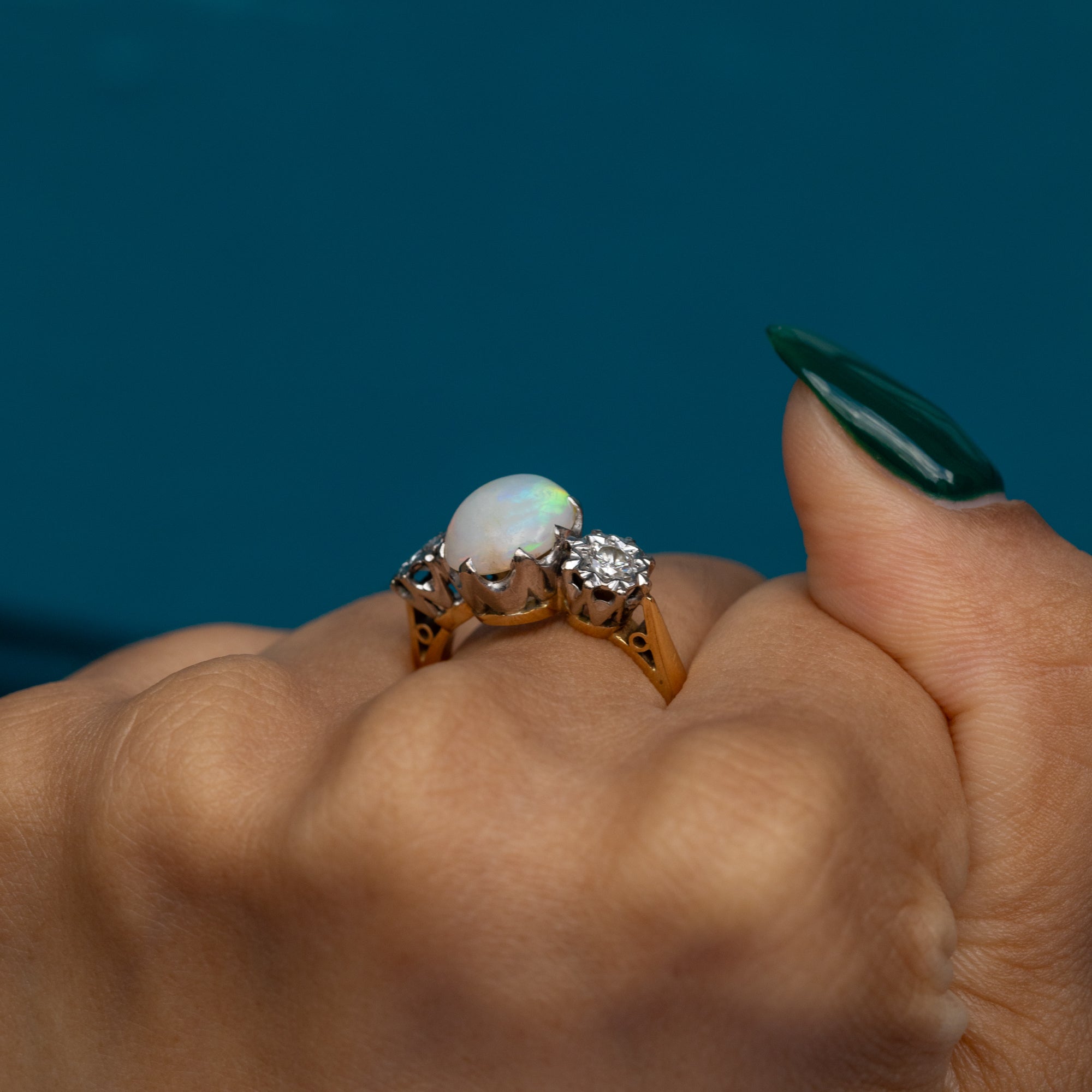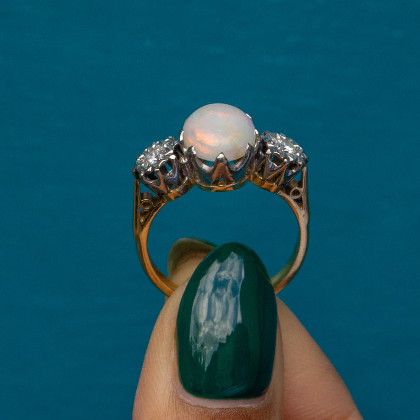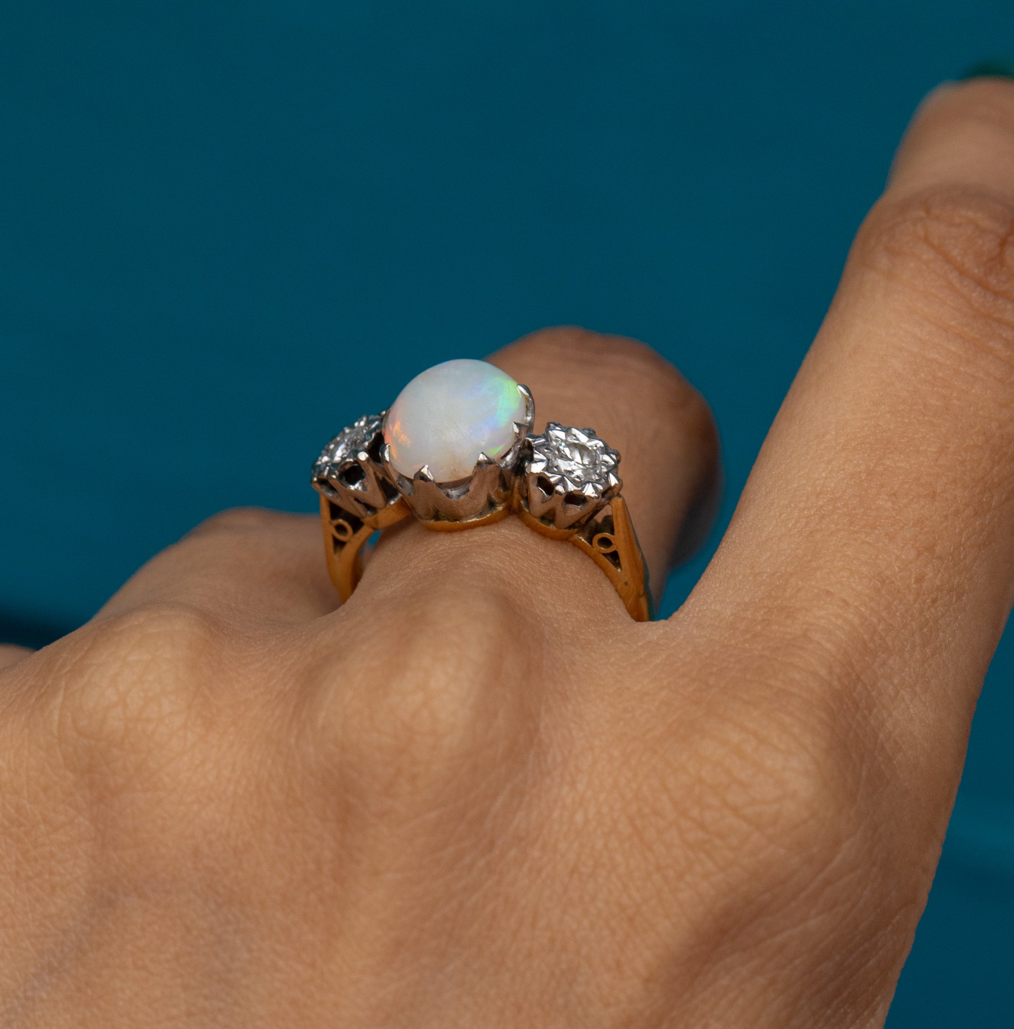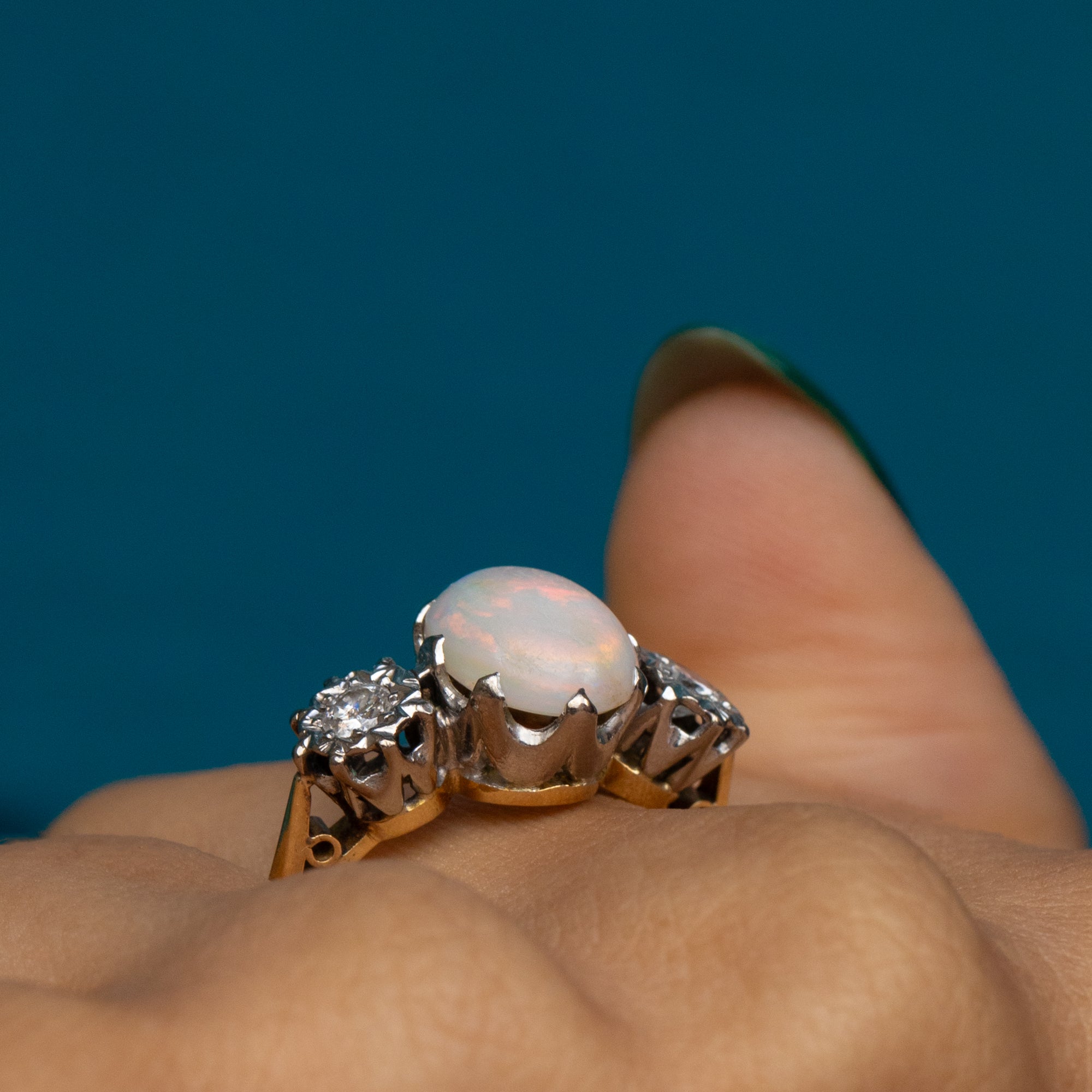 Bague trilogie antique en or 18 carats avec opale et diamant, opale de 1,80 ct