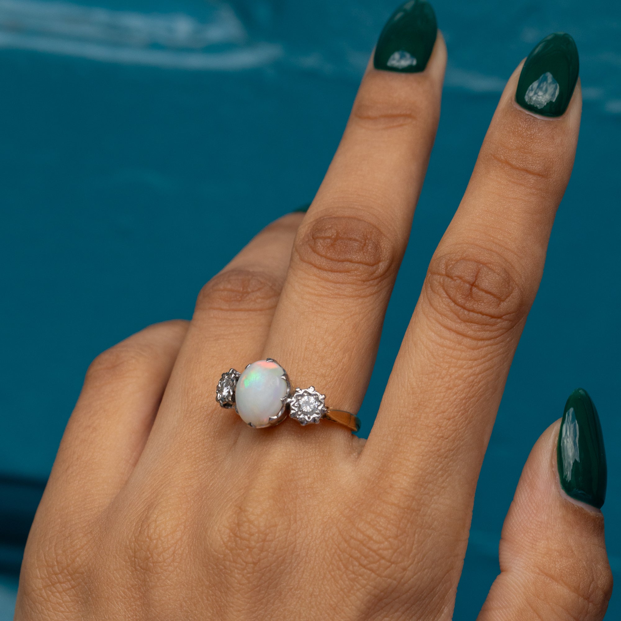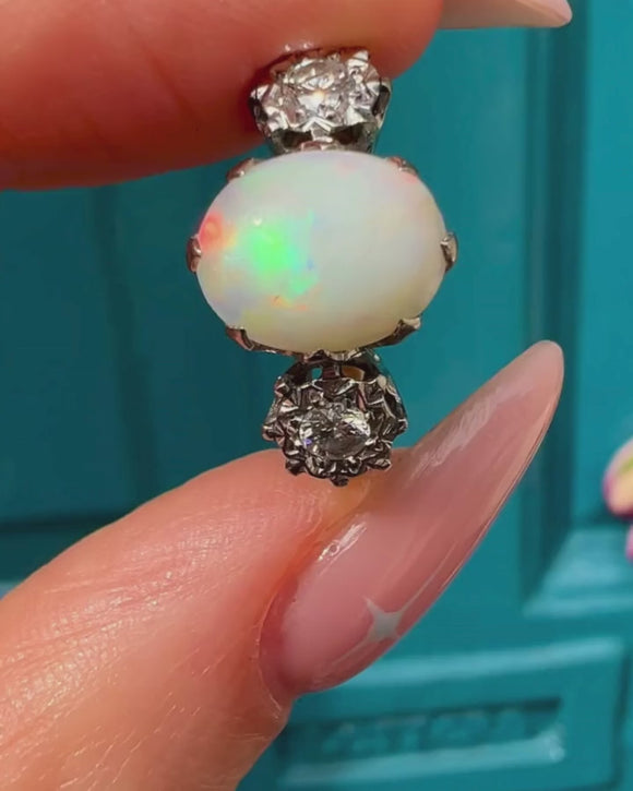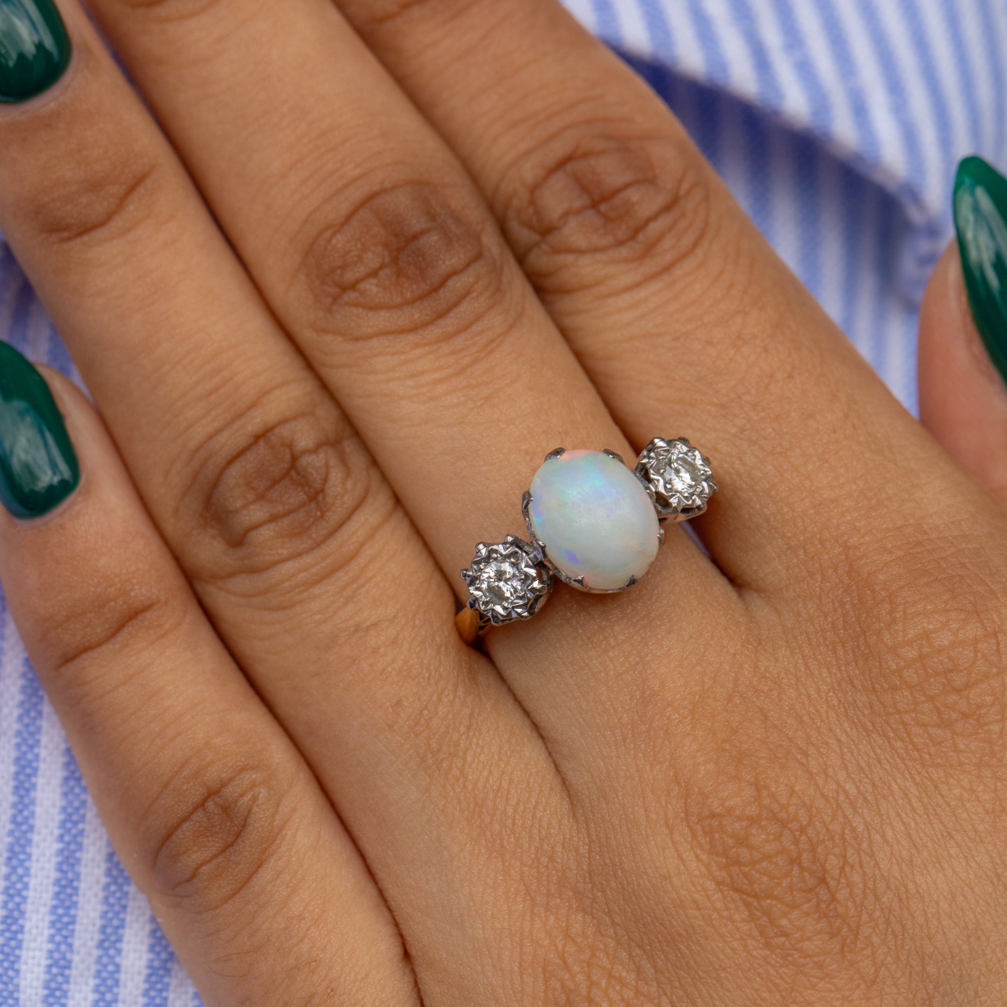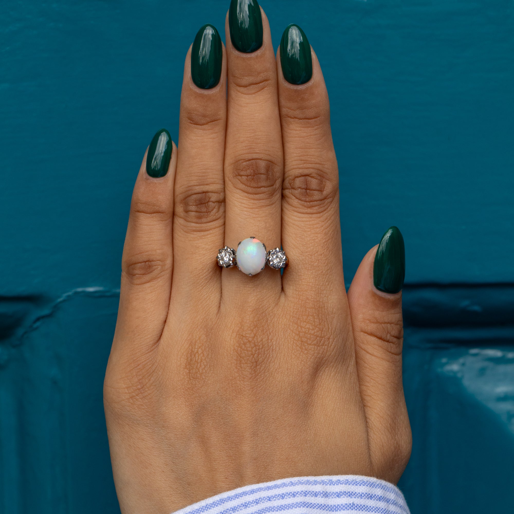 Bague trilogie antique en or 18 carats avec opale et diamant, opale de 1,80 ct