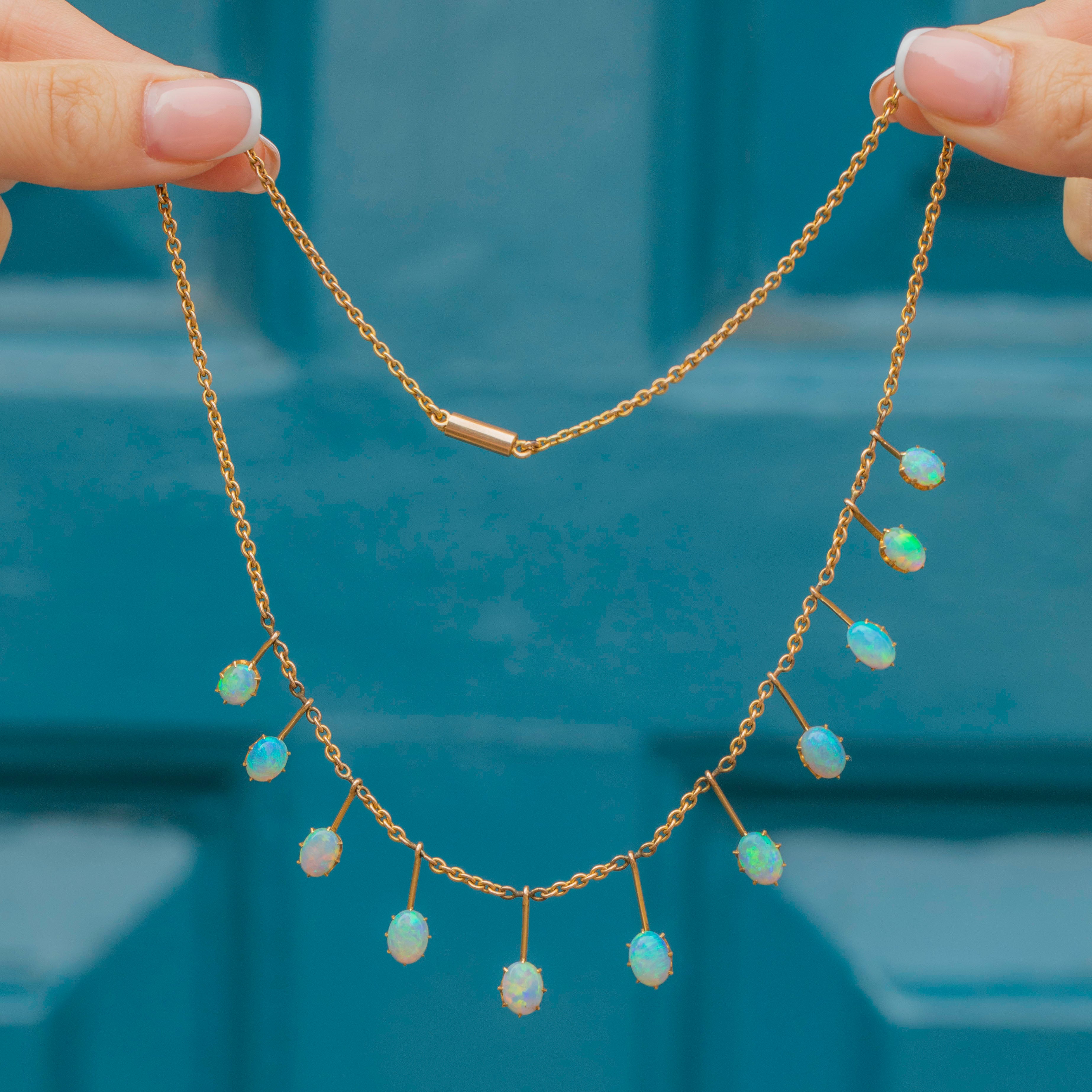 EXCELLENT. We are pleased to present this splendid Victorian 18ct Gold Opal fringe drop necklace in excellent condition! This gorgeous piece is complete with 11 Opal gemstones, all set securely and smoothly domed. The 18ct Gold chain is buttery and rich, with a fully functioning barrel clasp allowing you to wear this piece with absolute confidence! Given the age of this piece, she's lasted incredibly well over the years and will bring you joy for many years to come.