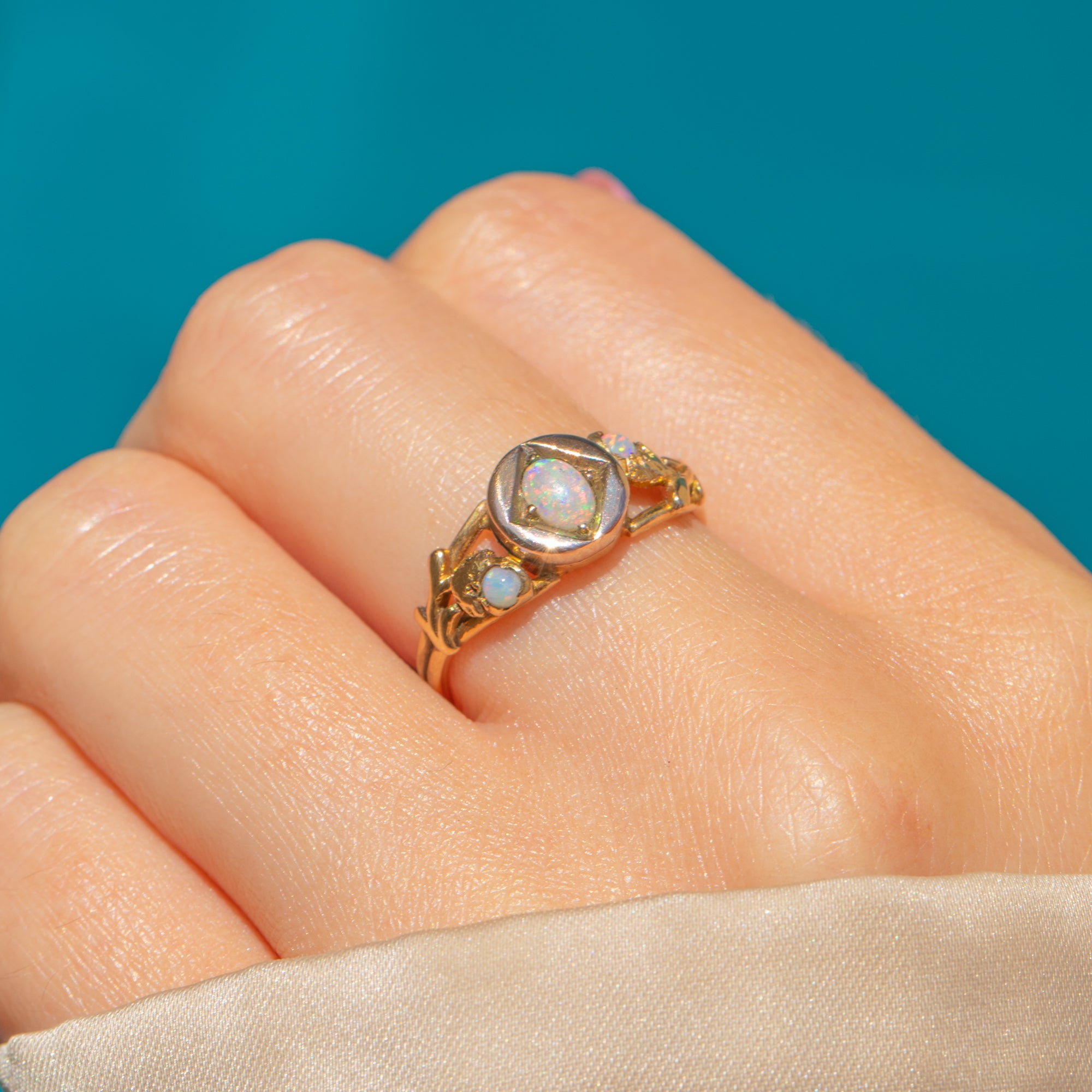 VERY GOOD: This antique 18ct Gold Opal ring is in very good condition. Each Opal has a lovely pastel hue and is secure within its setting. Her Gold is glossy, though there are some notable signs of discolouration to the settings, particularly inside the ring, though this cannot be seen when wearing. A lovely piece, this Victorian three stone ring is a must have!