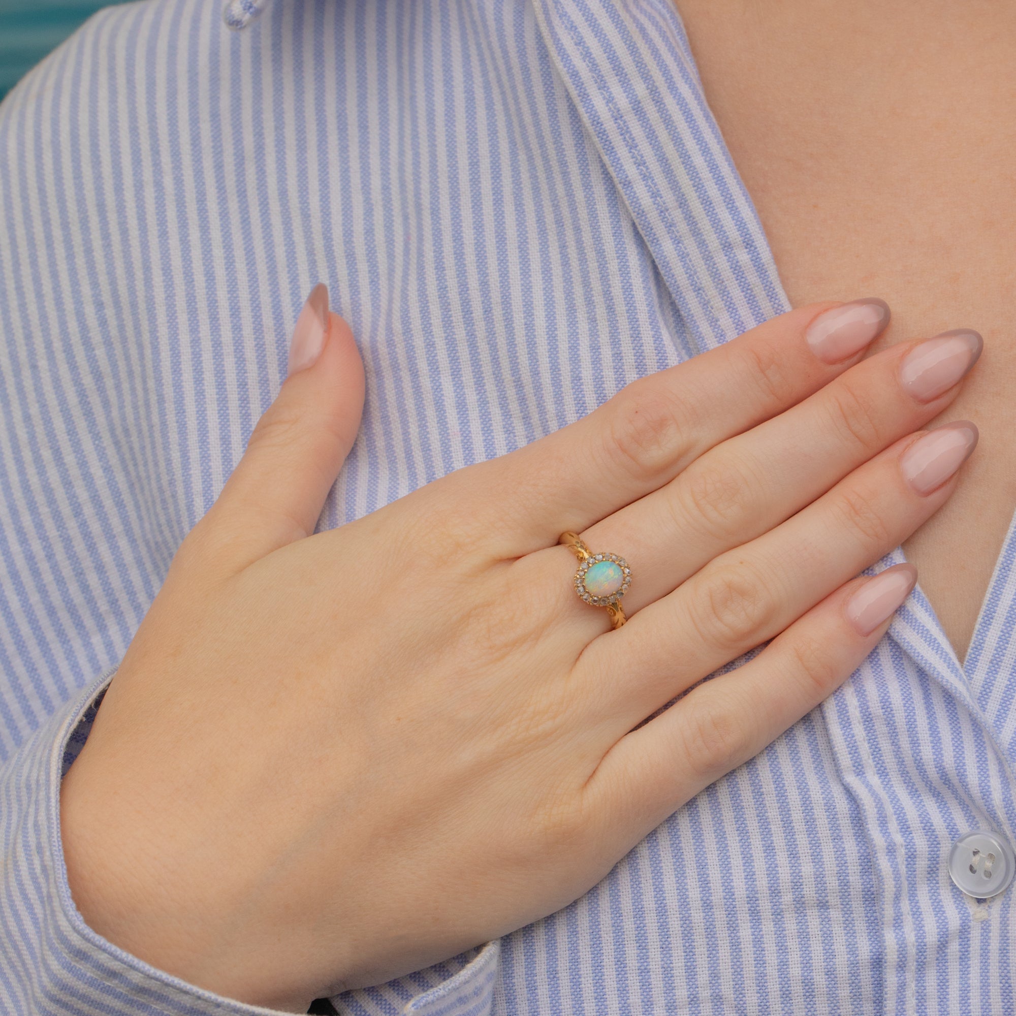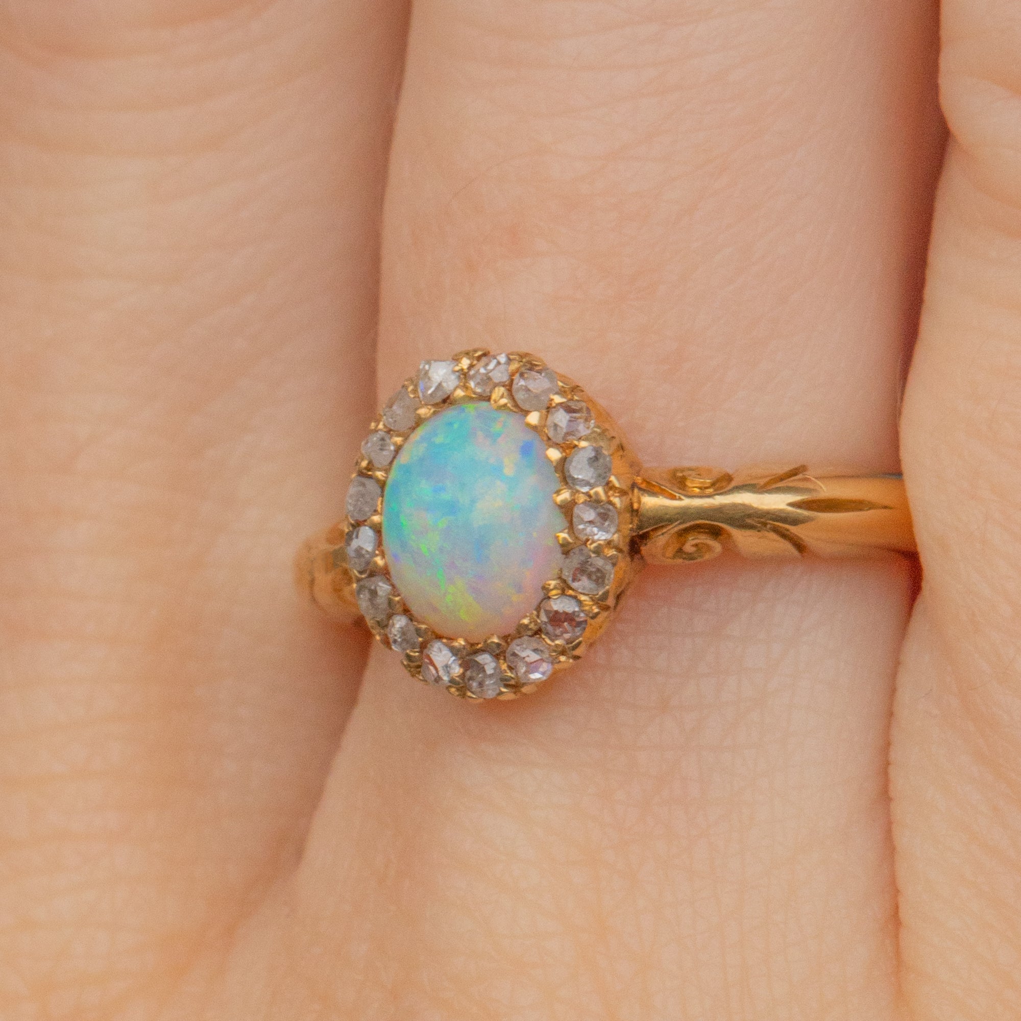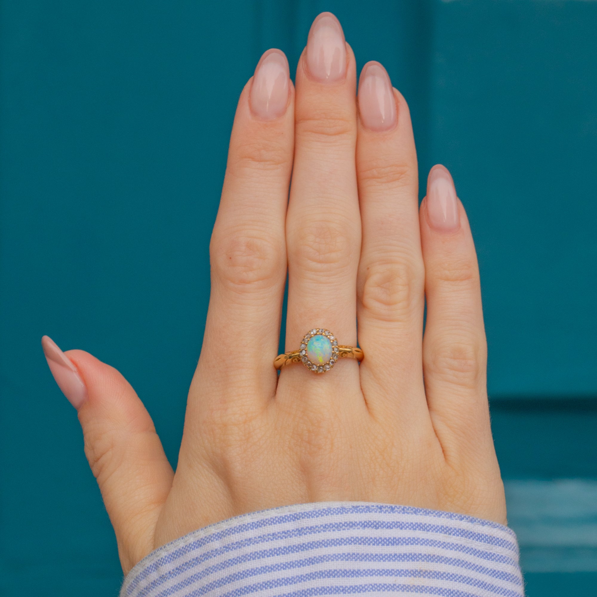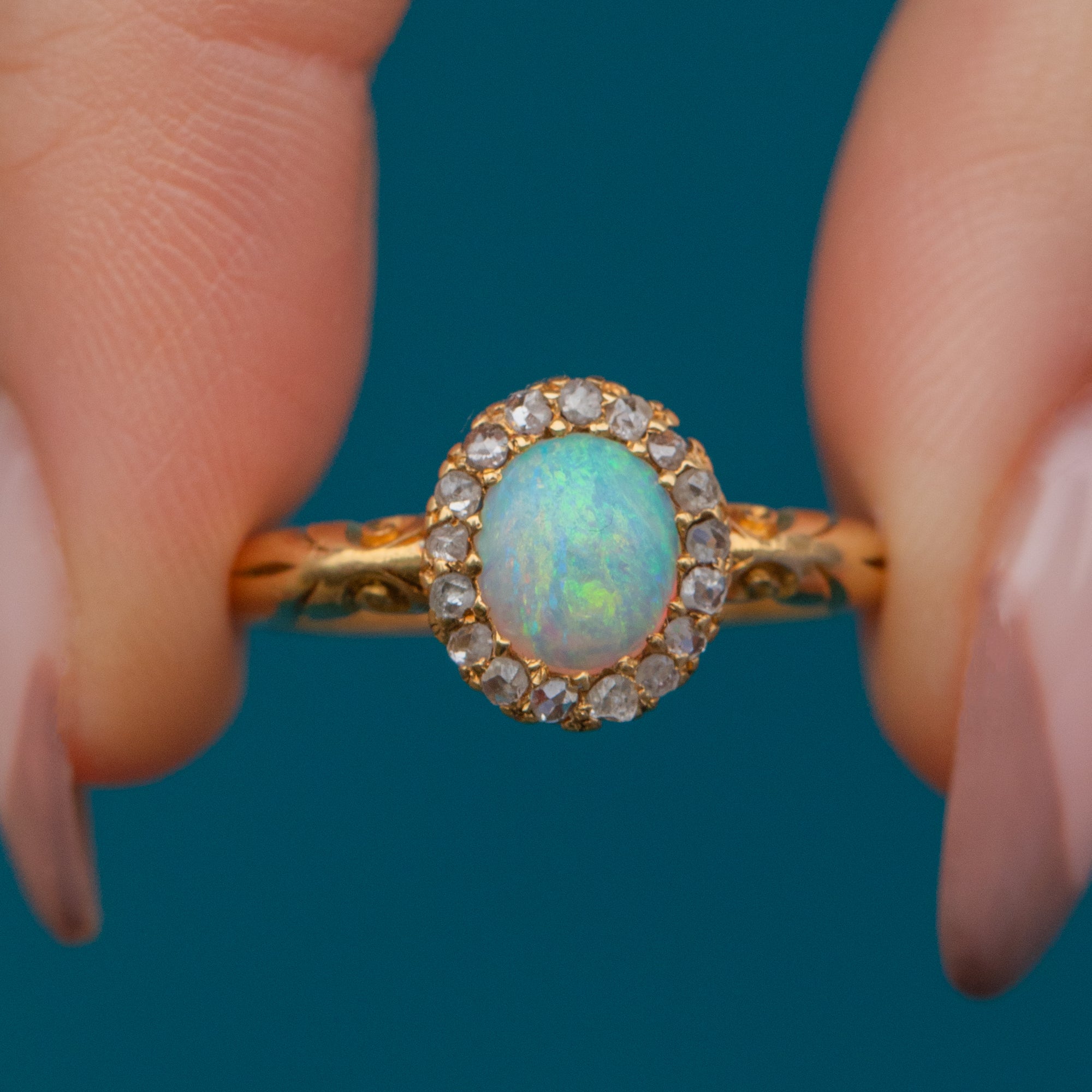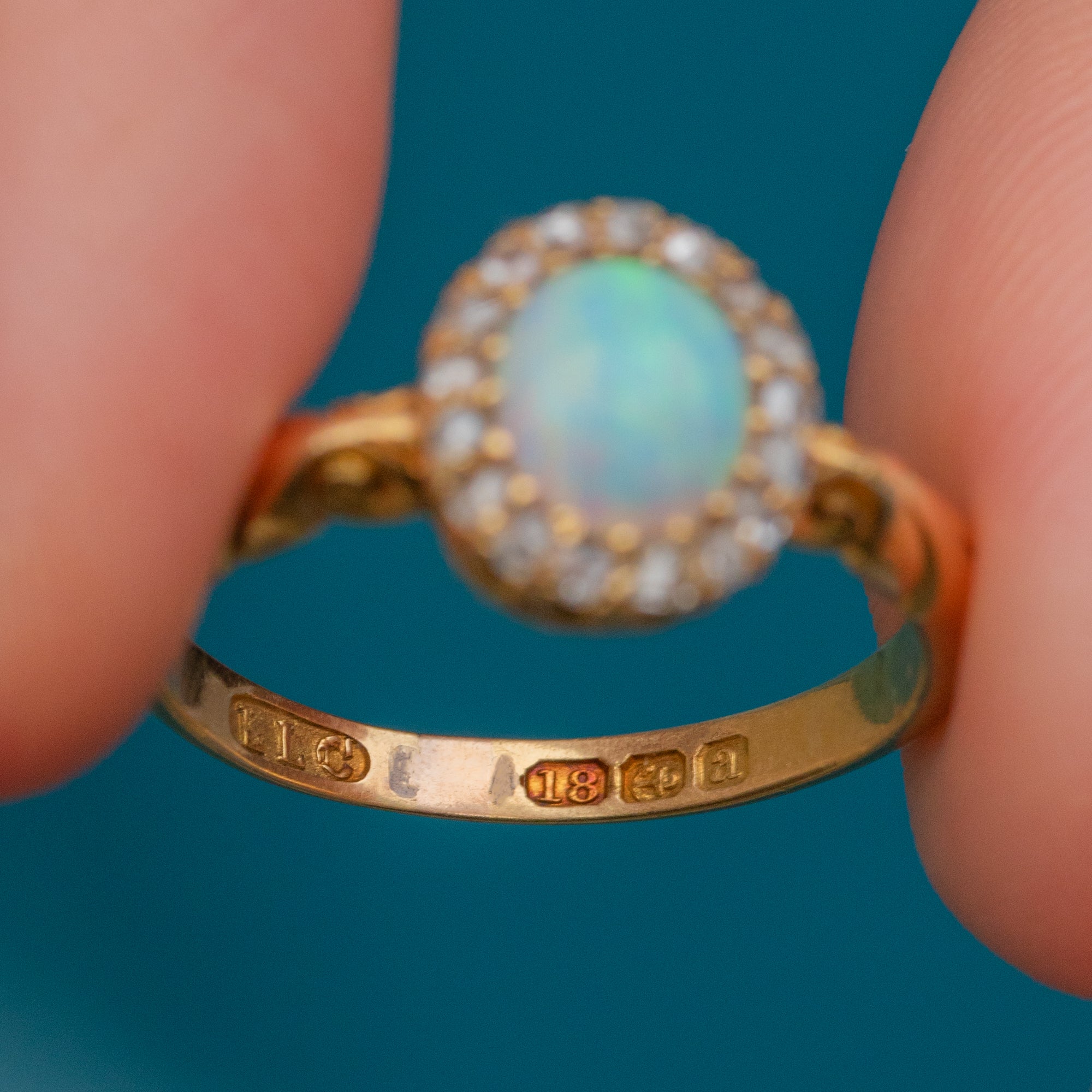 VERY GOOD. This antique 18ct Gold Opal rose-cut Diamond cluster ring is in very good condition. The Opal is smoothly domed and free from chips or scuffs and the Diamonds are all present and offer a subtle sparkling accent. There is a resize mark on the back of the band which is a slightly different shade of Gold and slight porosity visible, but this isn't visible while the ring is worn and doesn't impact the integrity of the piece. The Gold is otherwise saturated and the engraved details have remained crisp, and each gemstone is held securely within its setting. With a full set of hallmarks still legible inside the band, this Edwardian Opal Diamond ring will make a charming addition to your collection!