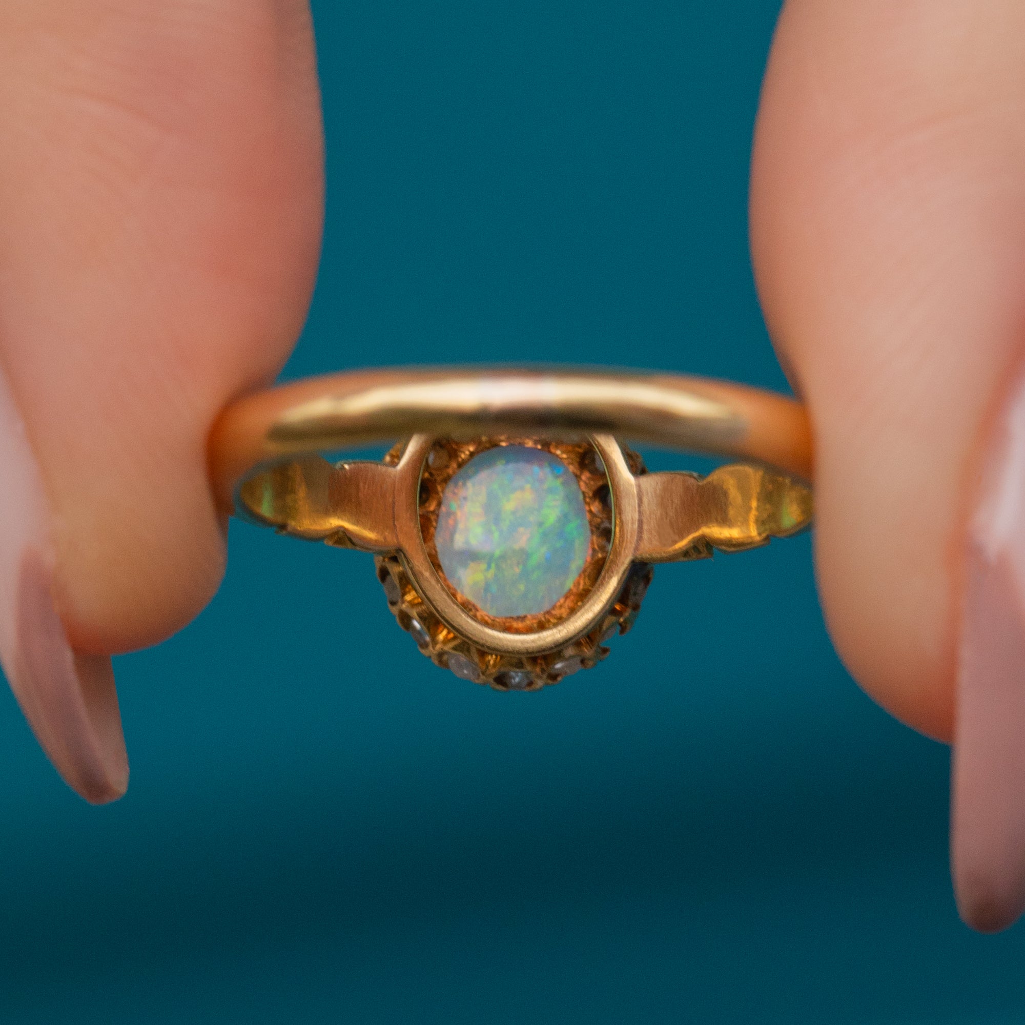Antique 18ct Gold Opal Rose-Cut Diamond Cluster Ring c.1900