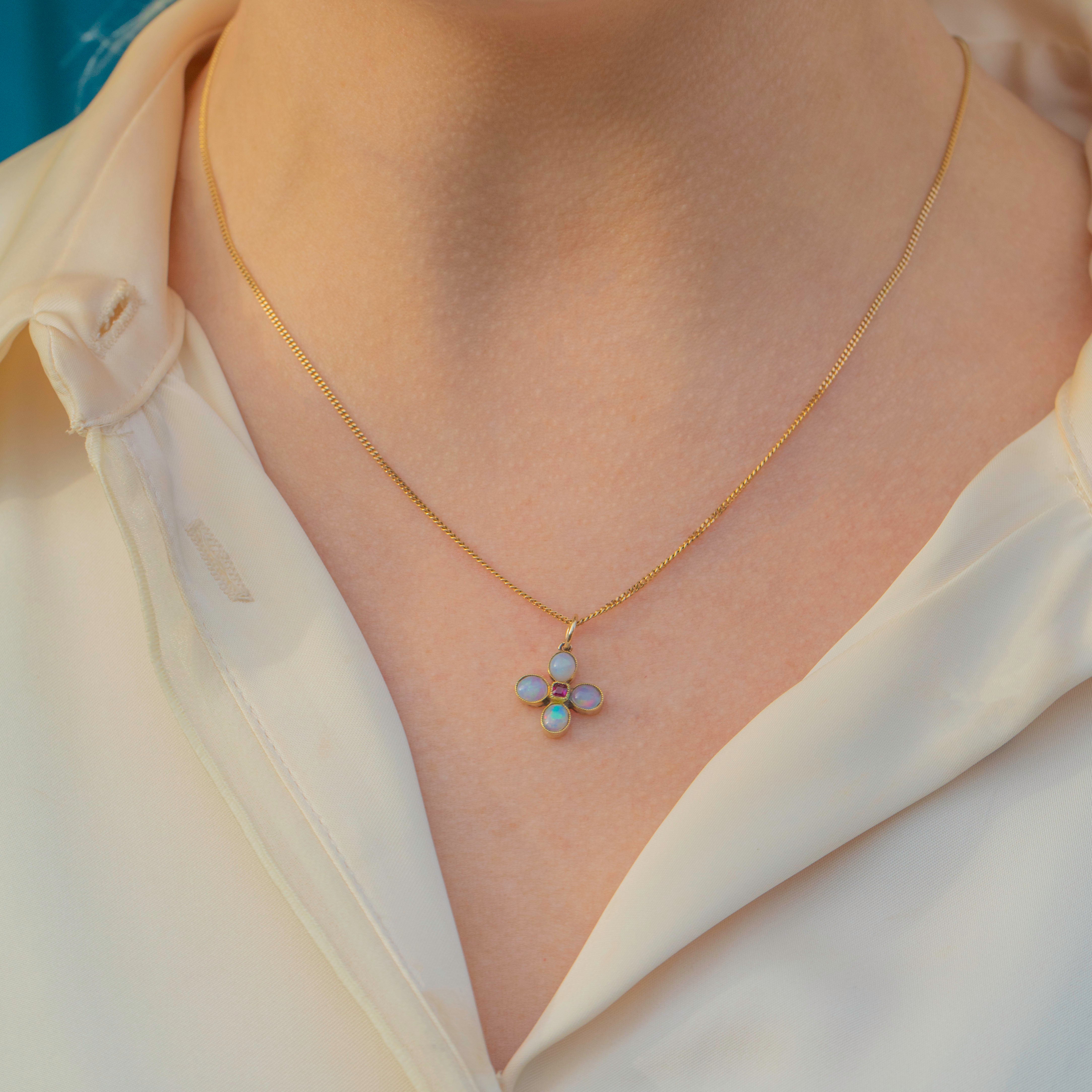 Crafted from buttery 18ct Gold, this Victorian charm features four plump Opals arranged in a charming petal design, surrounding a central radiant Ruby. Each stone catches the light wonderfully, with the iridescence of the Opals effortlessly complimented by the vibrant warmth of the Ruby.