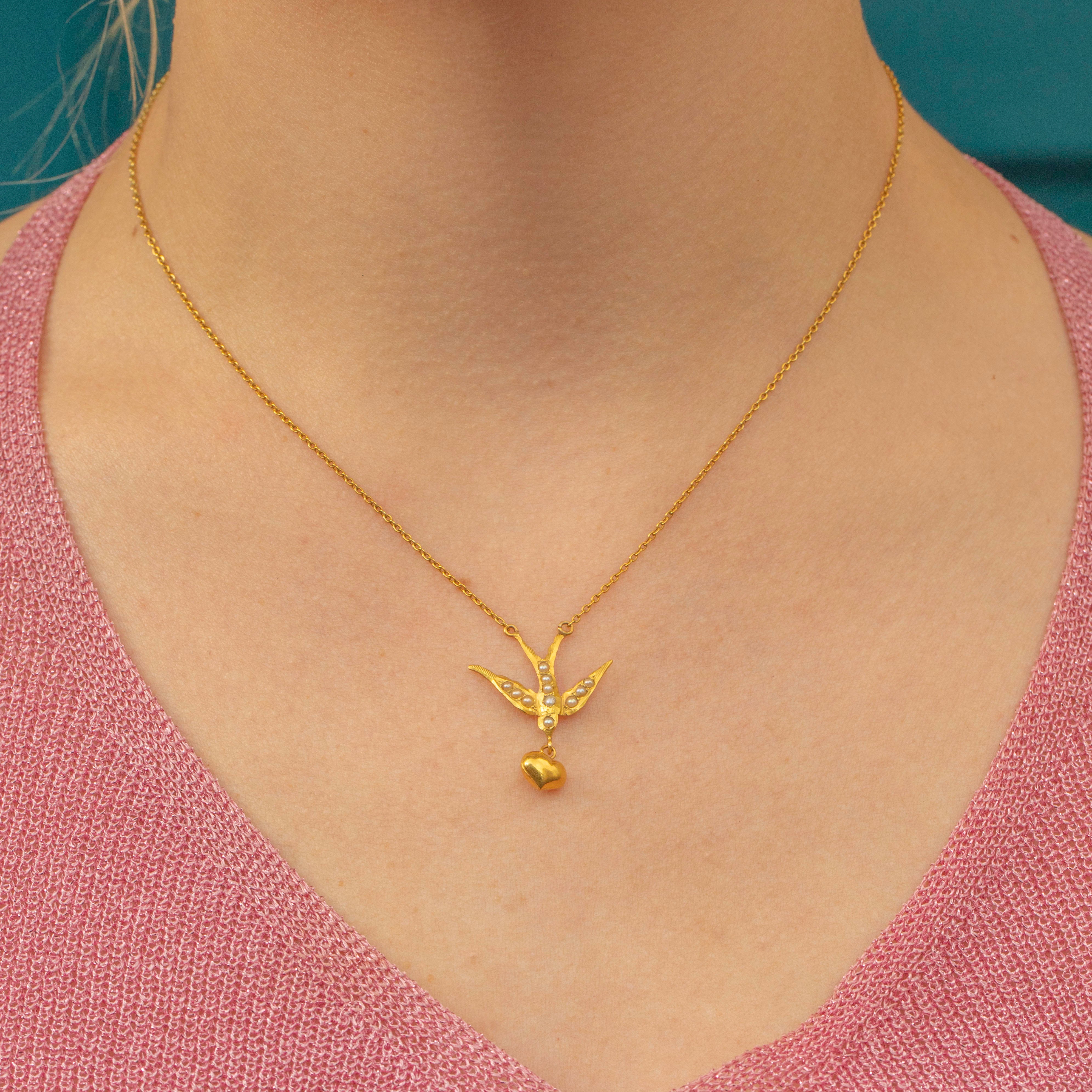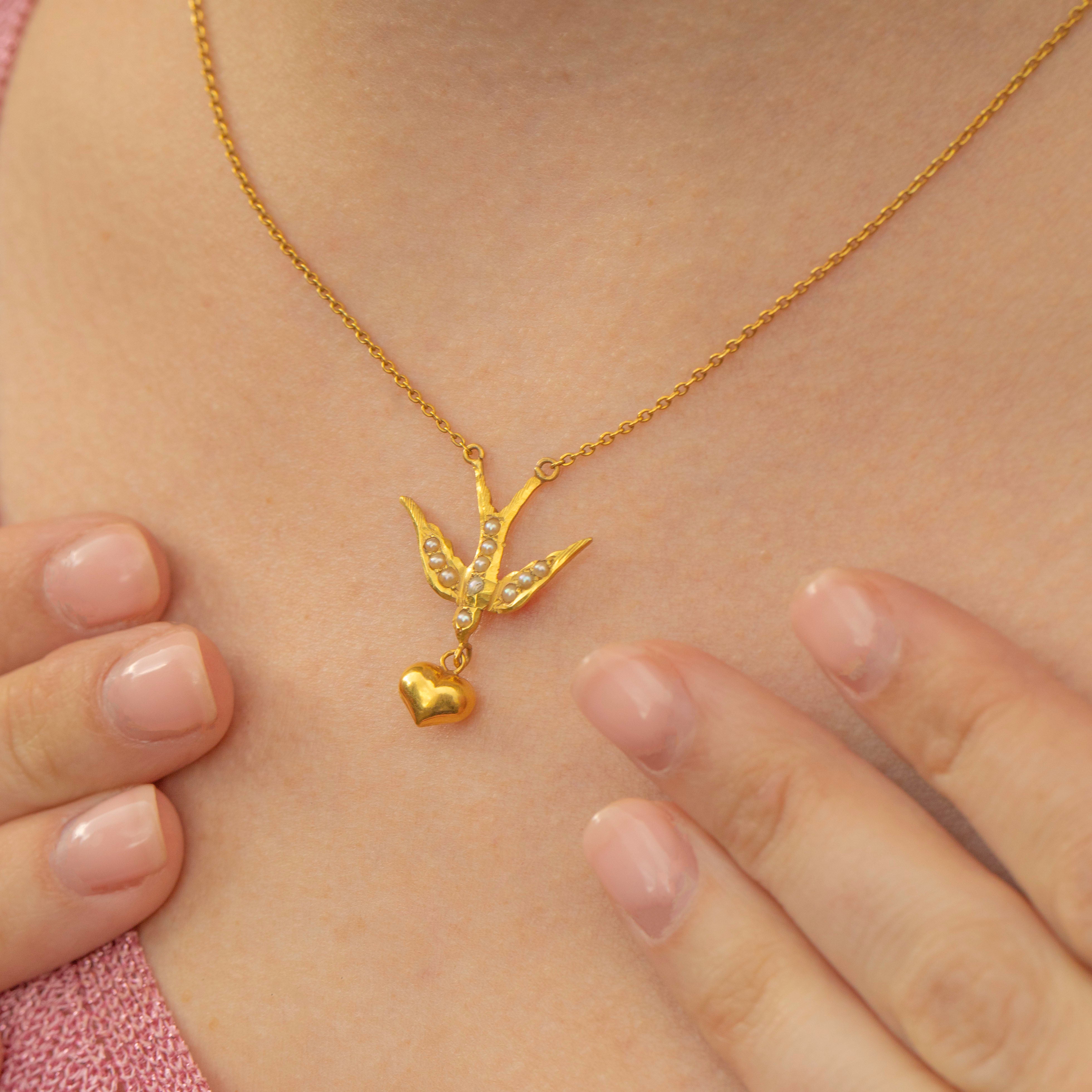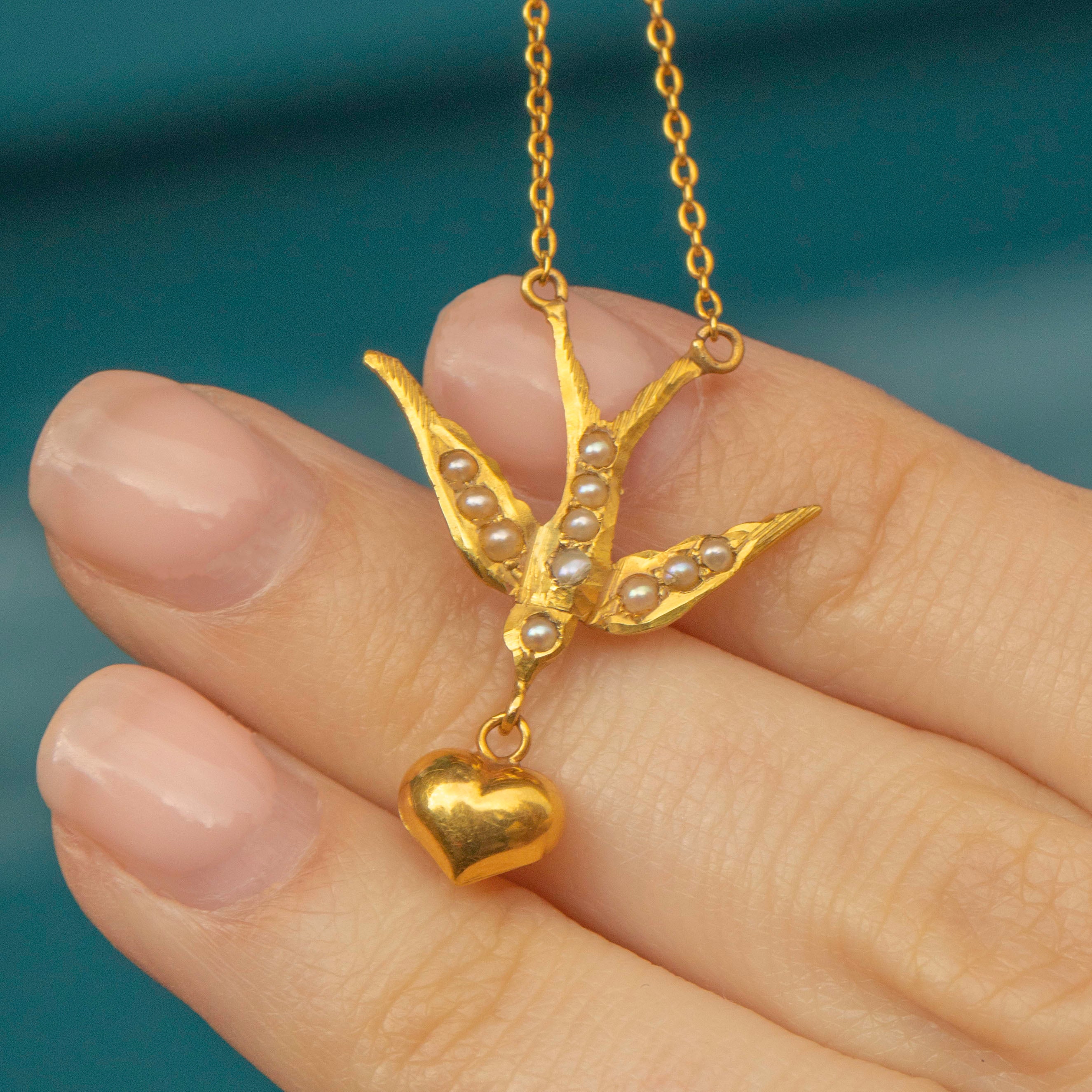 MATERIALS: Tests as 18ct Gold chain & heart drop, 15ct Gold swallow, Pearls.