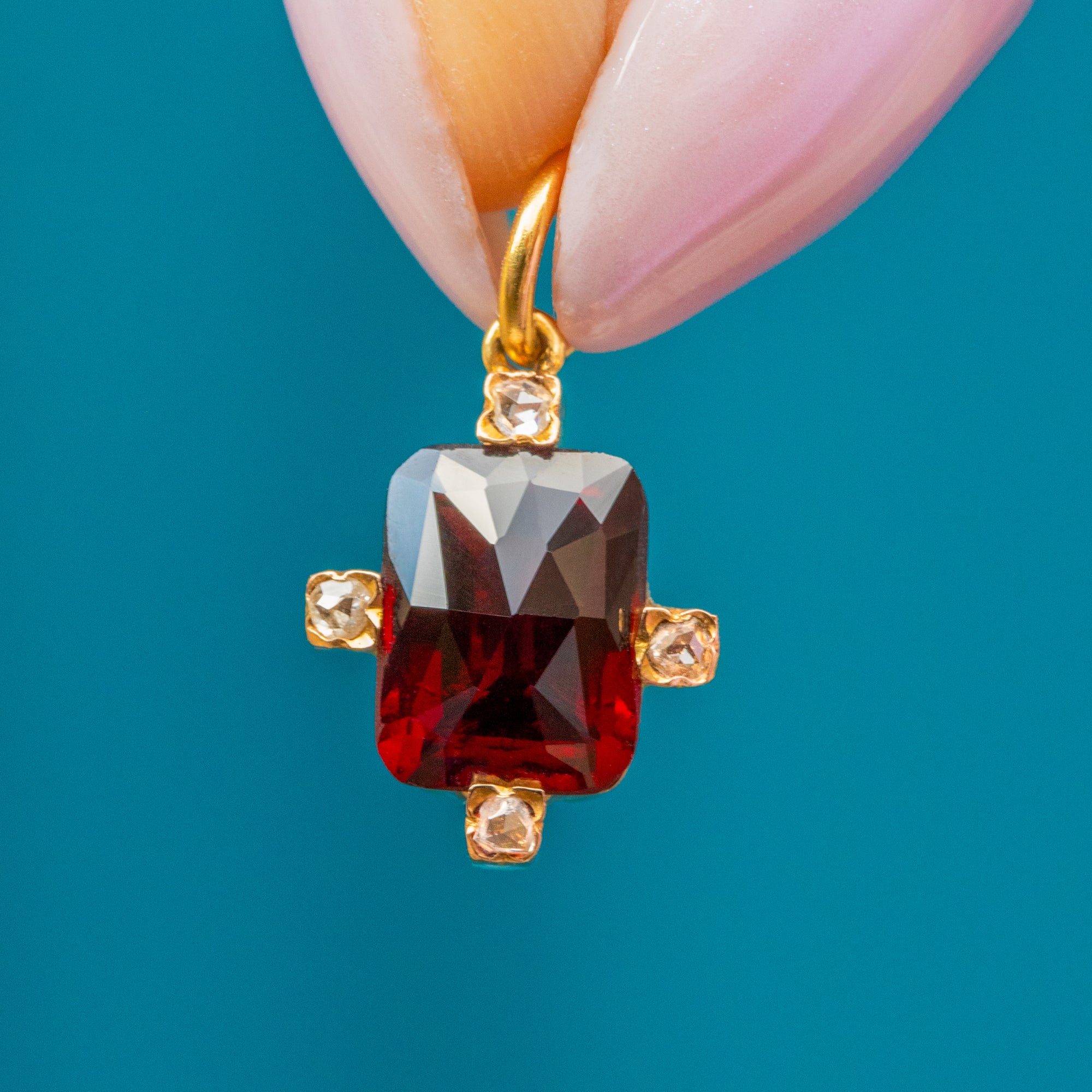 EXCELLENT. This antique 18ct Gold Perpignan Garnet Diamond charm is in lovely condition throughout. The Garnet is a stunning hue of deep scarlet red, perfectly complementing the silvery tones of the rose cut Diamonds! All gemstones are secure within their settings, allowing for confident wear.