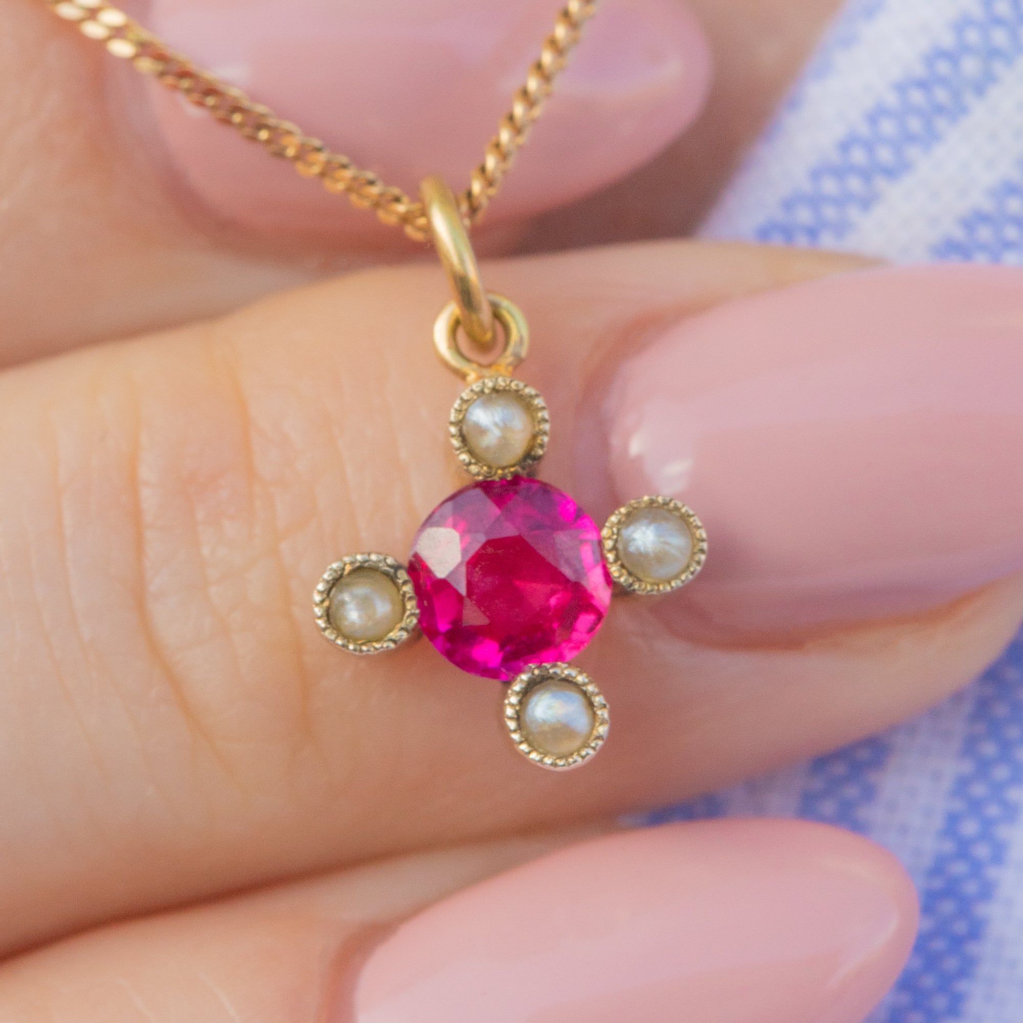 Antique 18ct Gold Pink Sapphire Pearl Charm, 0.50ct