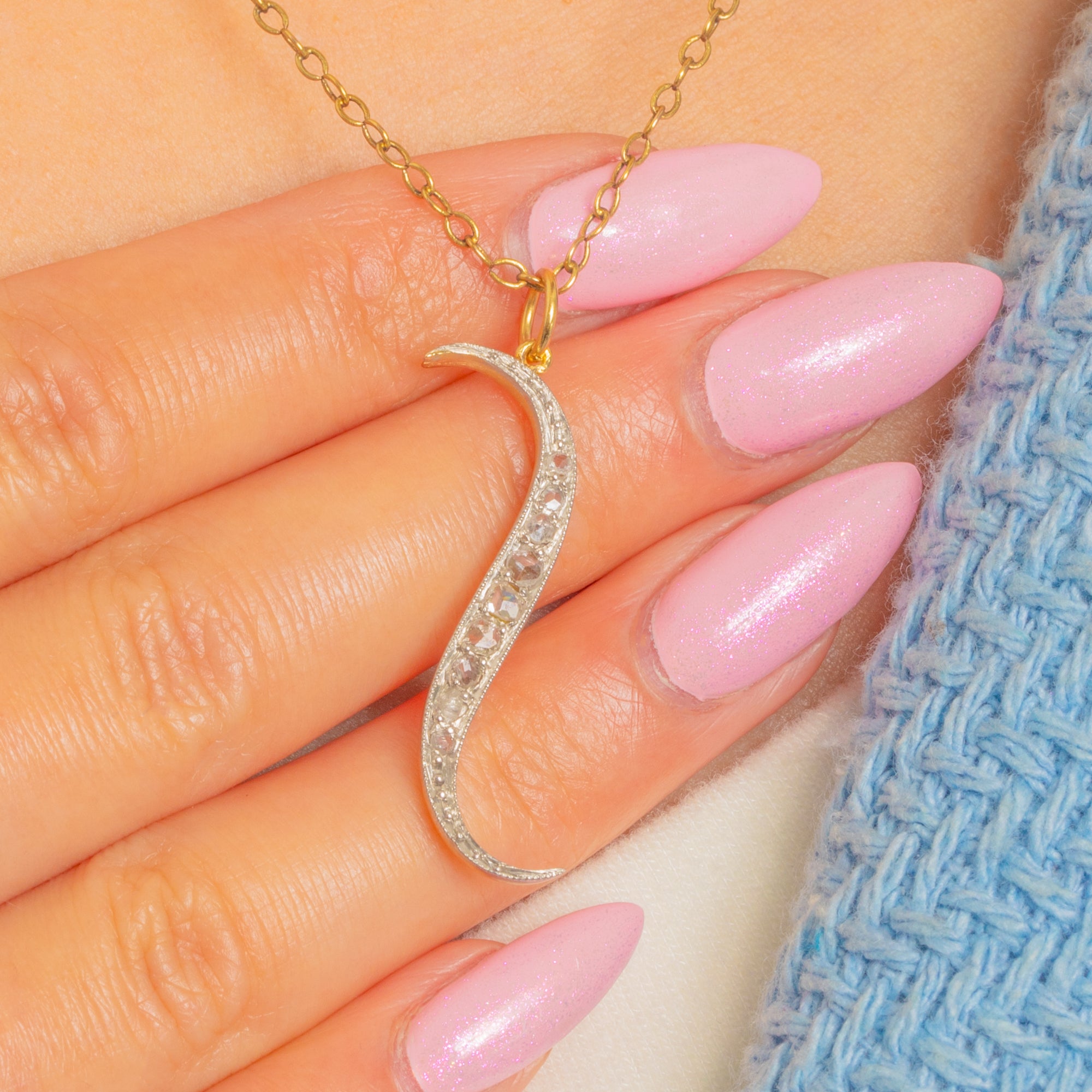 A slender swirl pendant in two sumptuous tones, this Victorian treasure marries rich 18ct Gold with a cool Platinum face dusted in nine glinting rose-cut Diamonds. The Diamonds are gracefully graduated along the arc, their antique faceting catching the light with a soft, romantic sparkle.