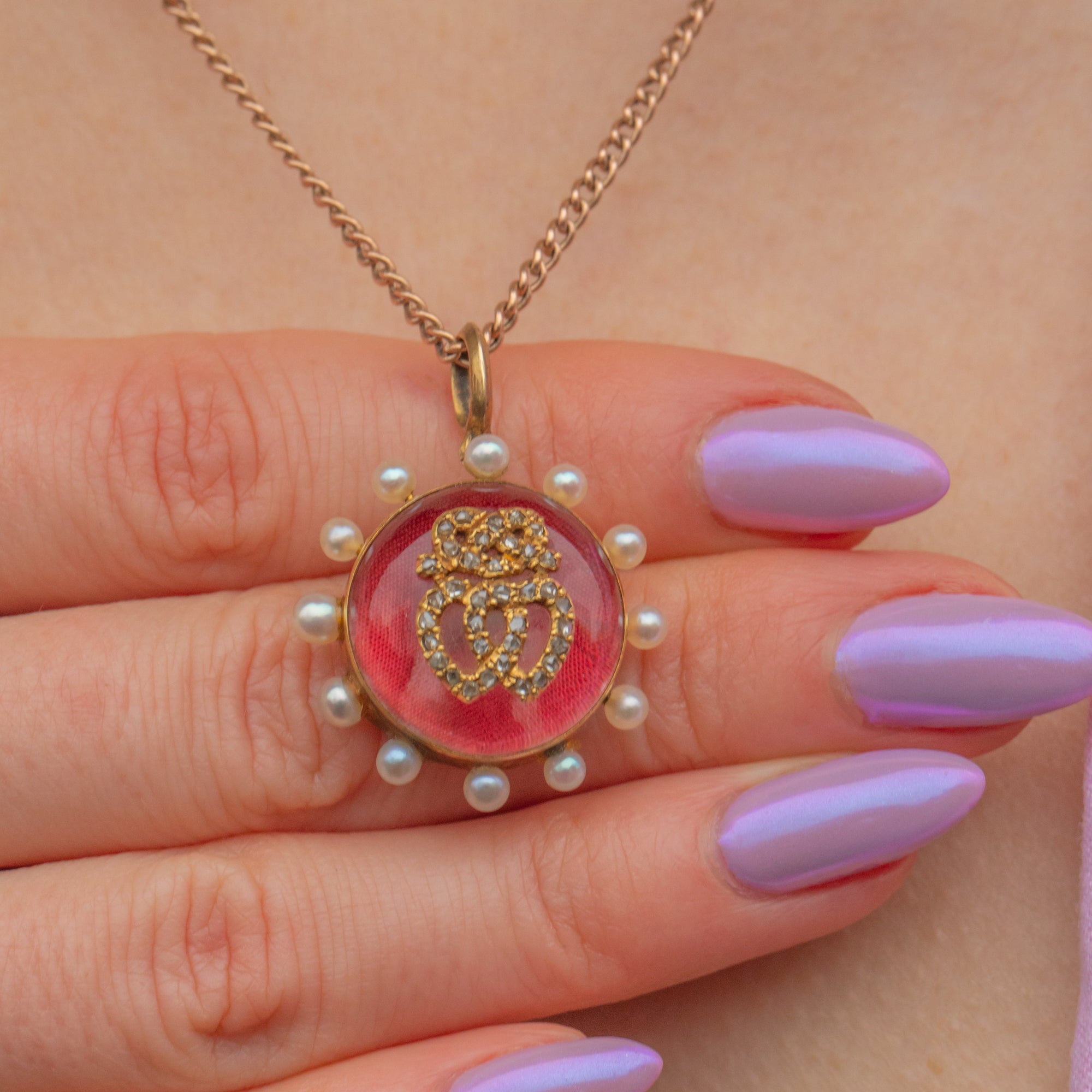 VERY GOOD. This antique 18ct Gold Rock Crystal Diamond heart pendant is in very good condition. Her Diamonds and Pearls are lustrous and free from any evident signs of wear. Her ribbon backing is slightly worn in the centre, however this is only visible under close inspection. With only some minor signs of age to the Gold settings, commensurate with age, she is in great condition.
