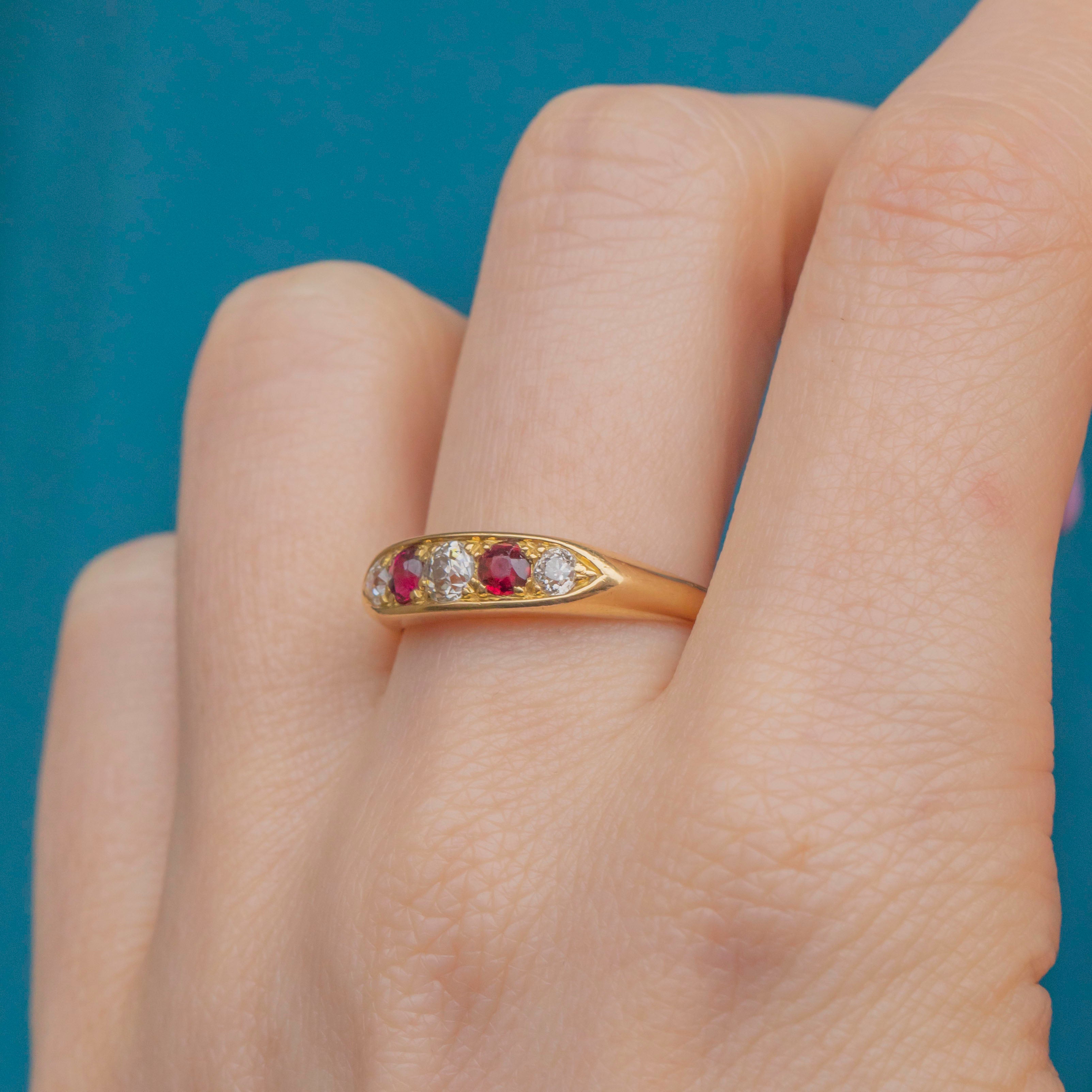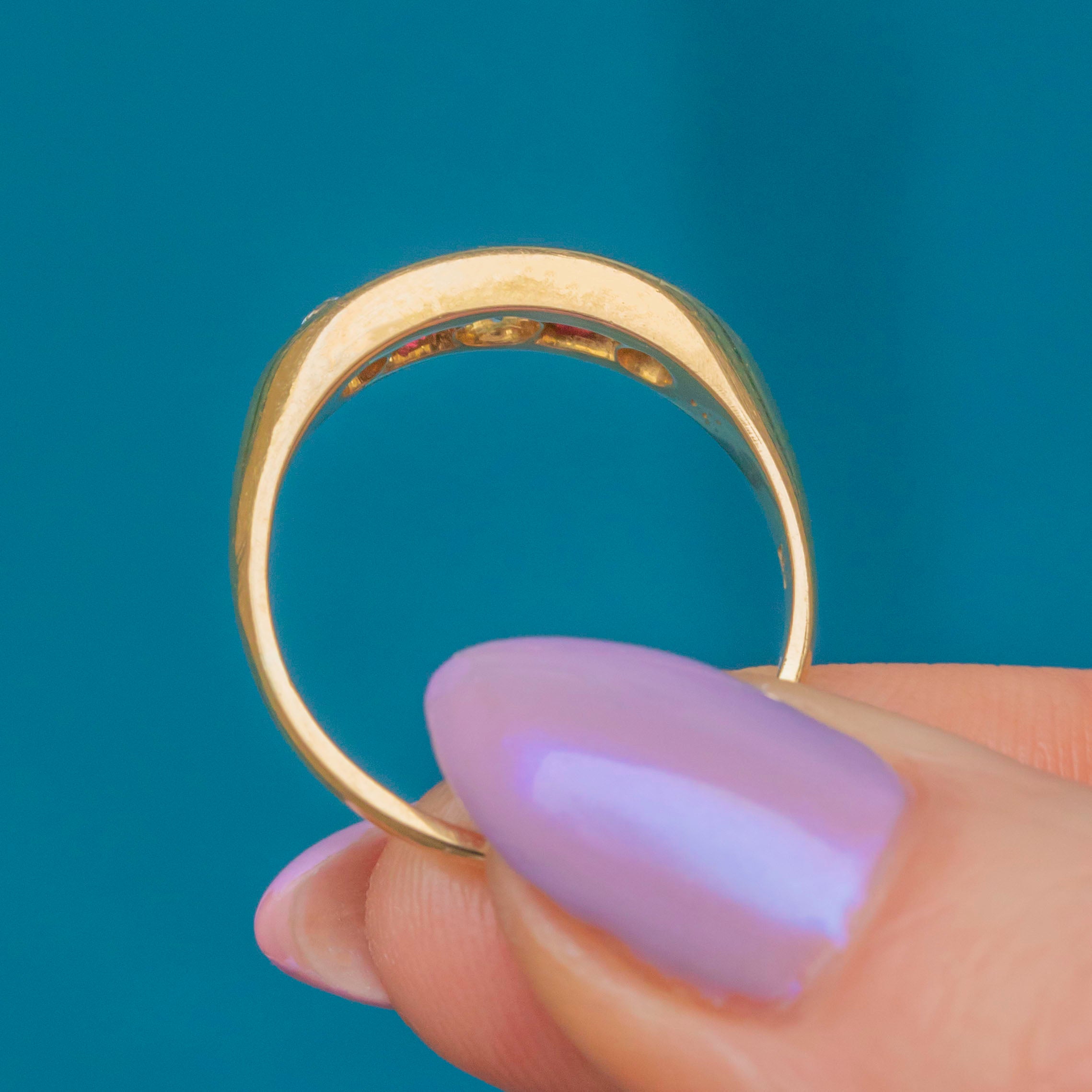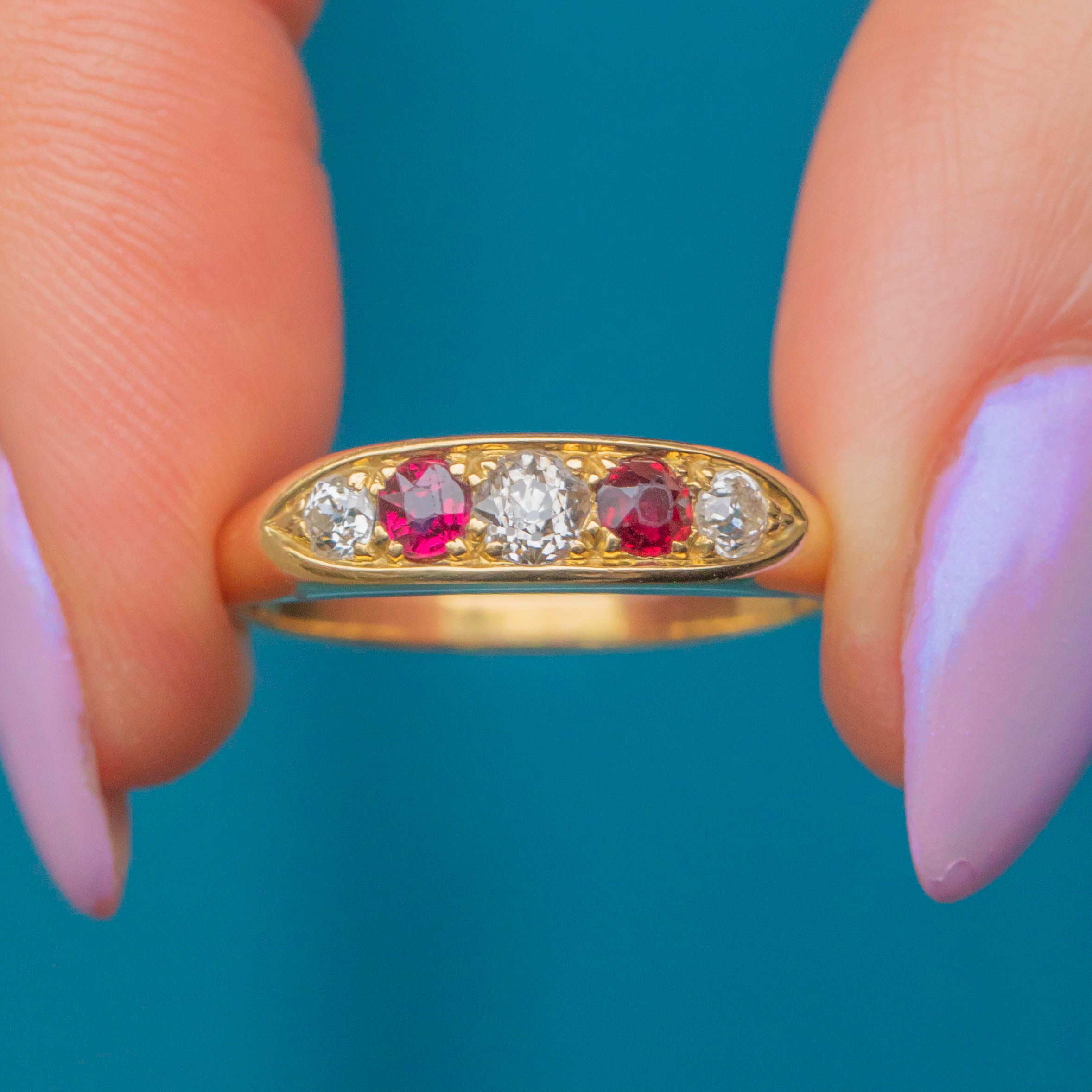 Crafted from luxurious 18ct yellow Gold, this Victorian ring showcases a stunning boat-shaped setting inlaid with alternating vibrant Rubies and twinkling Diamonds. The saturated Rubies exude a vibrant scarlet hue, perfectly offset by the crisp white Diamonds.