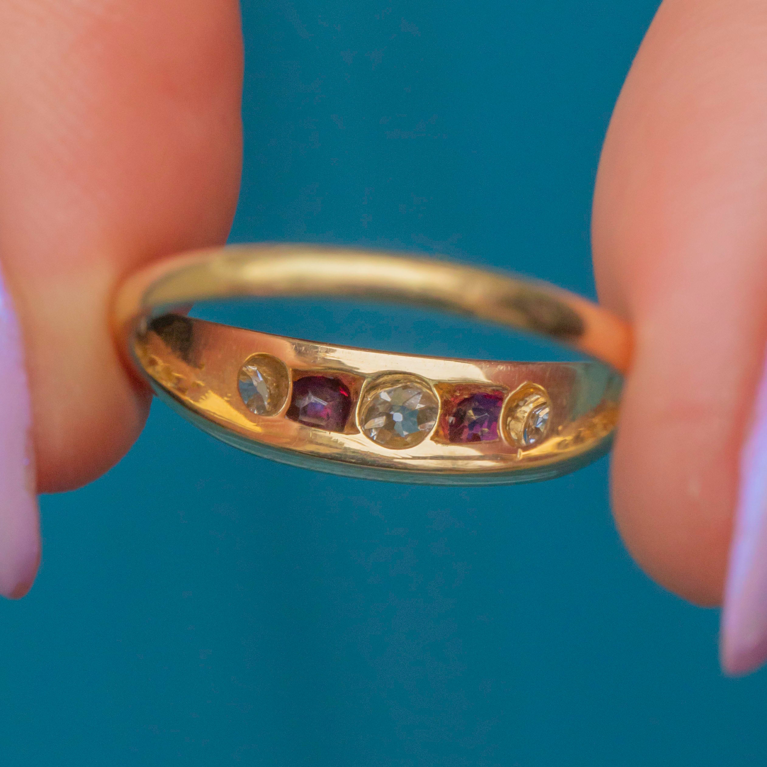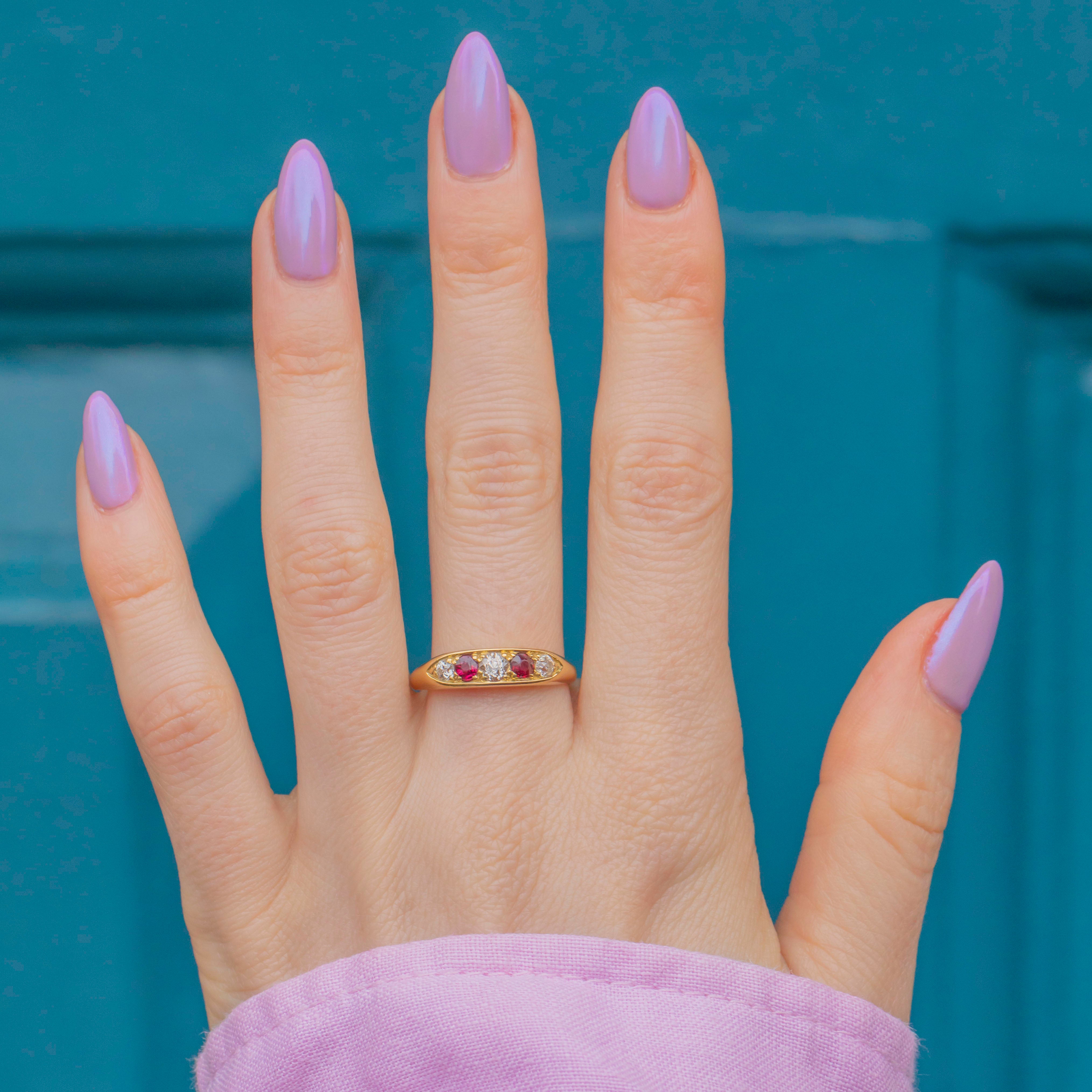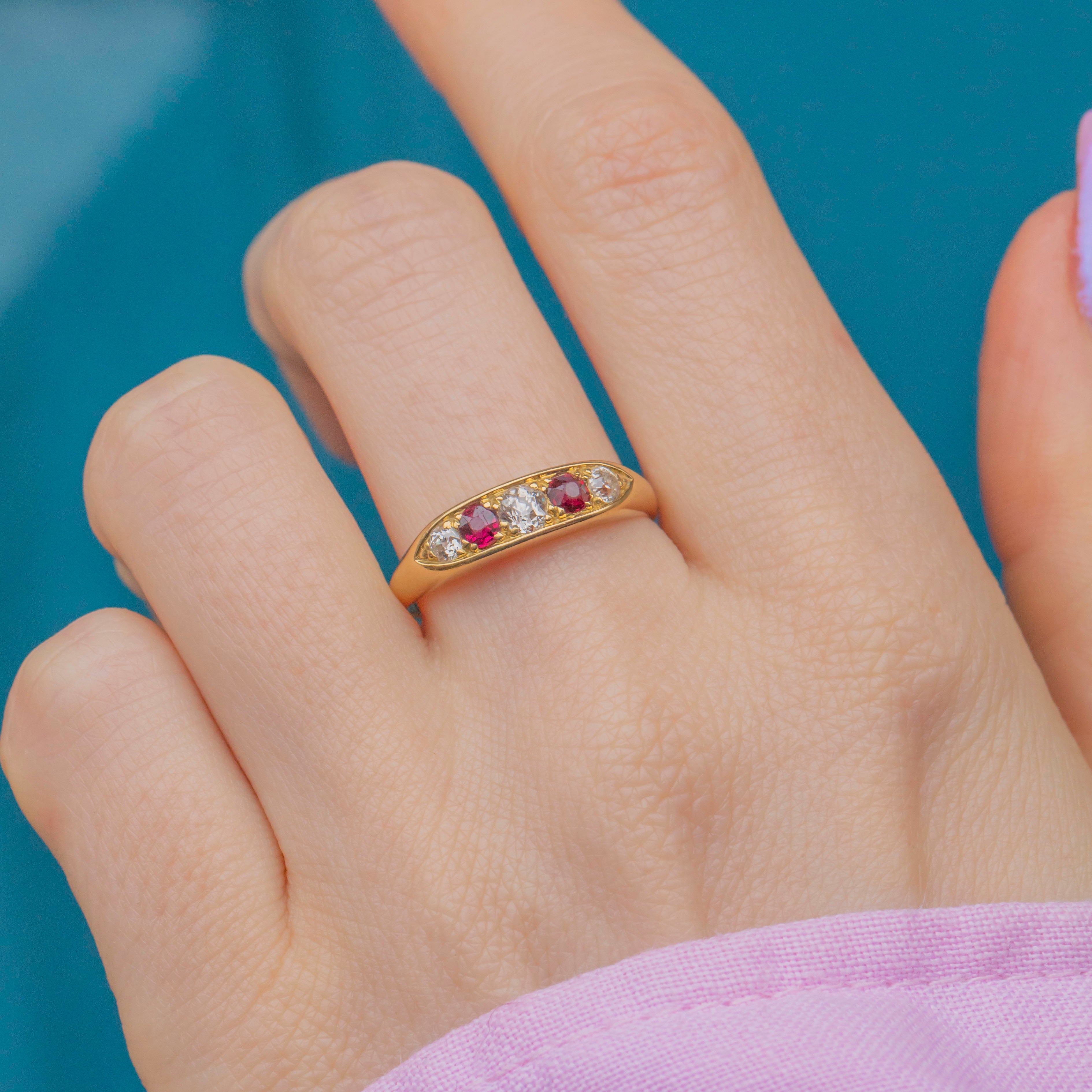 Crafted from luxurious 18ct yellow Gold, this Victorian ring showcases a stunning boat-shaped setting inlaid with alternating vibrant Rubies and twinkling Diamonds. The saturated Rubies exude a vibrant scarlet hue, perfectly offset by the crisp white Diamonds.