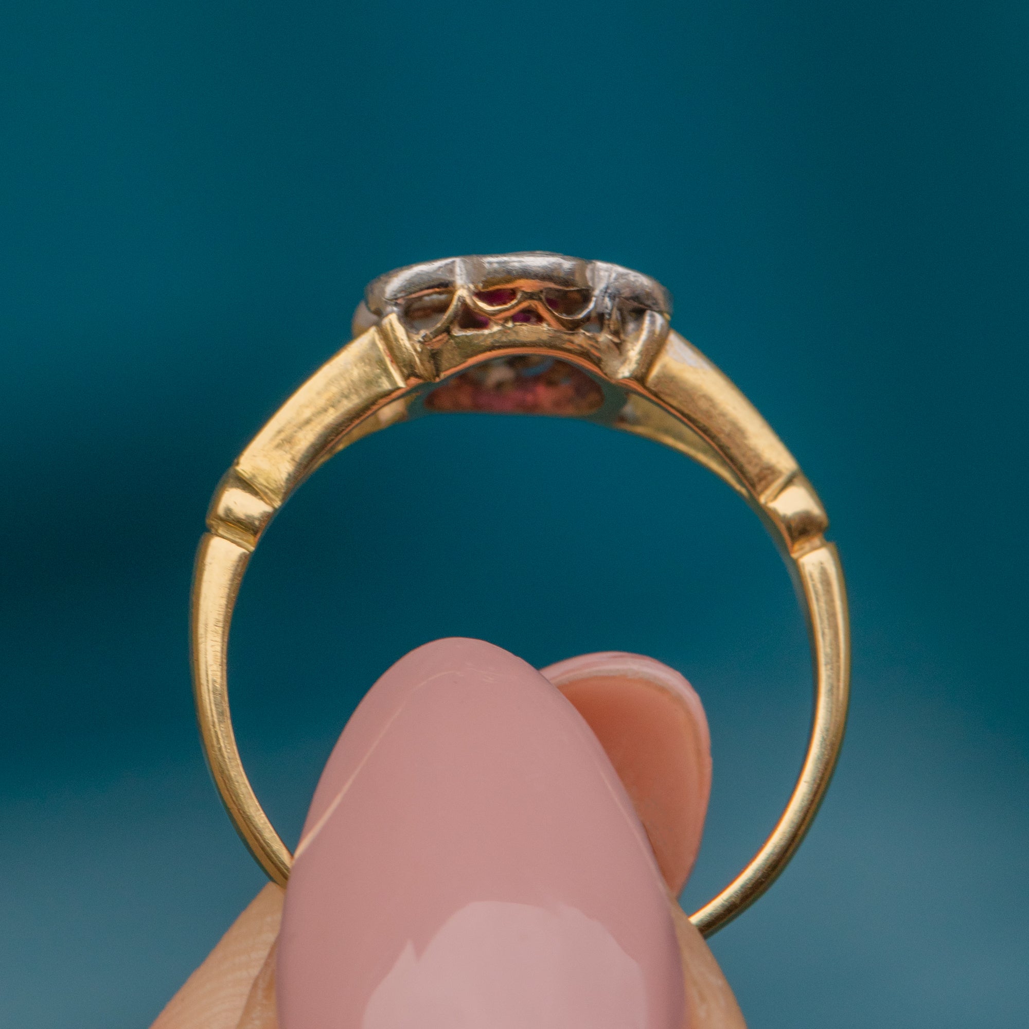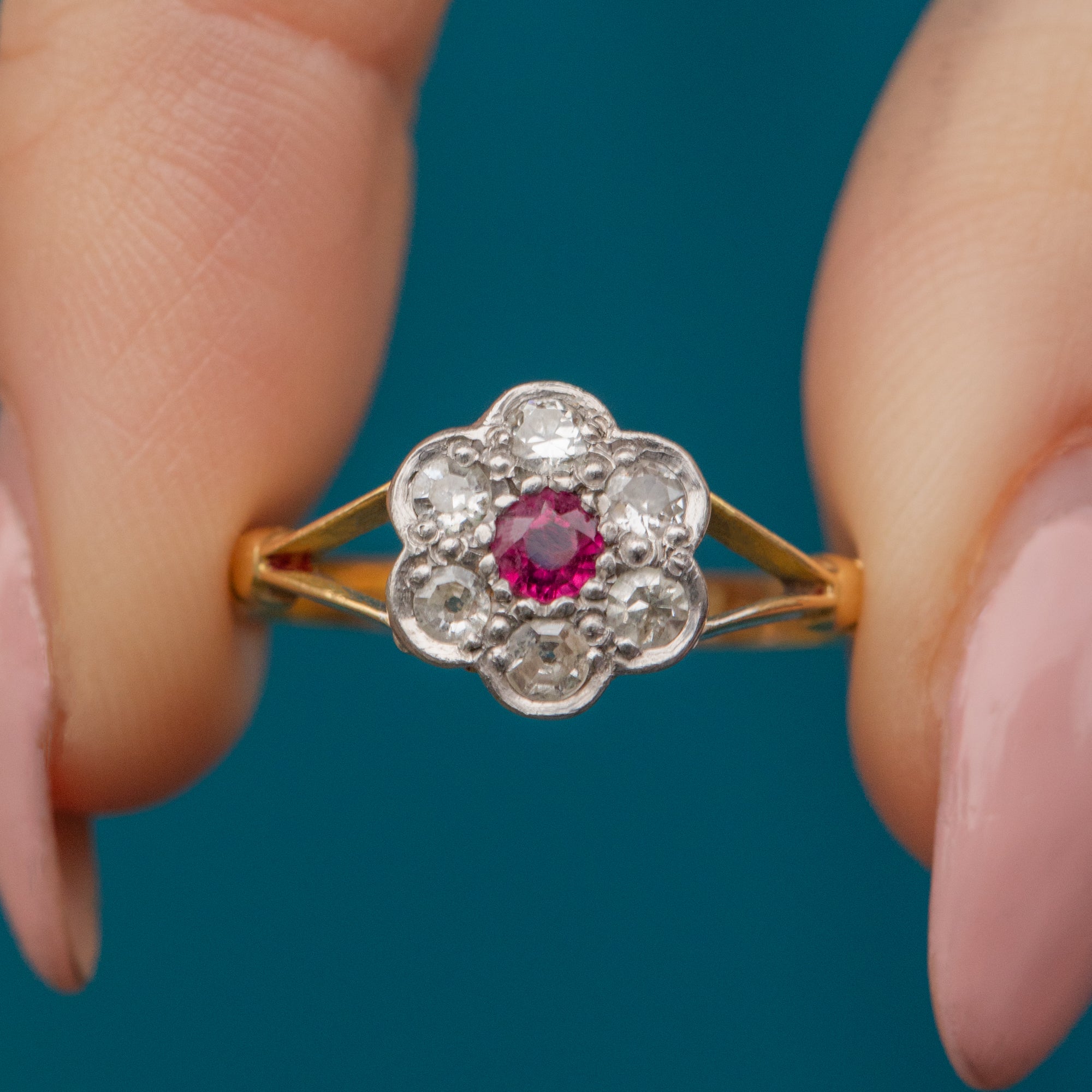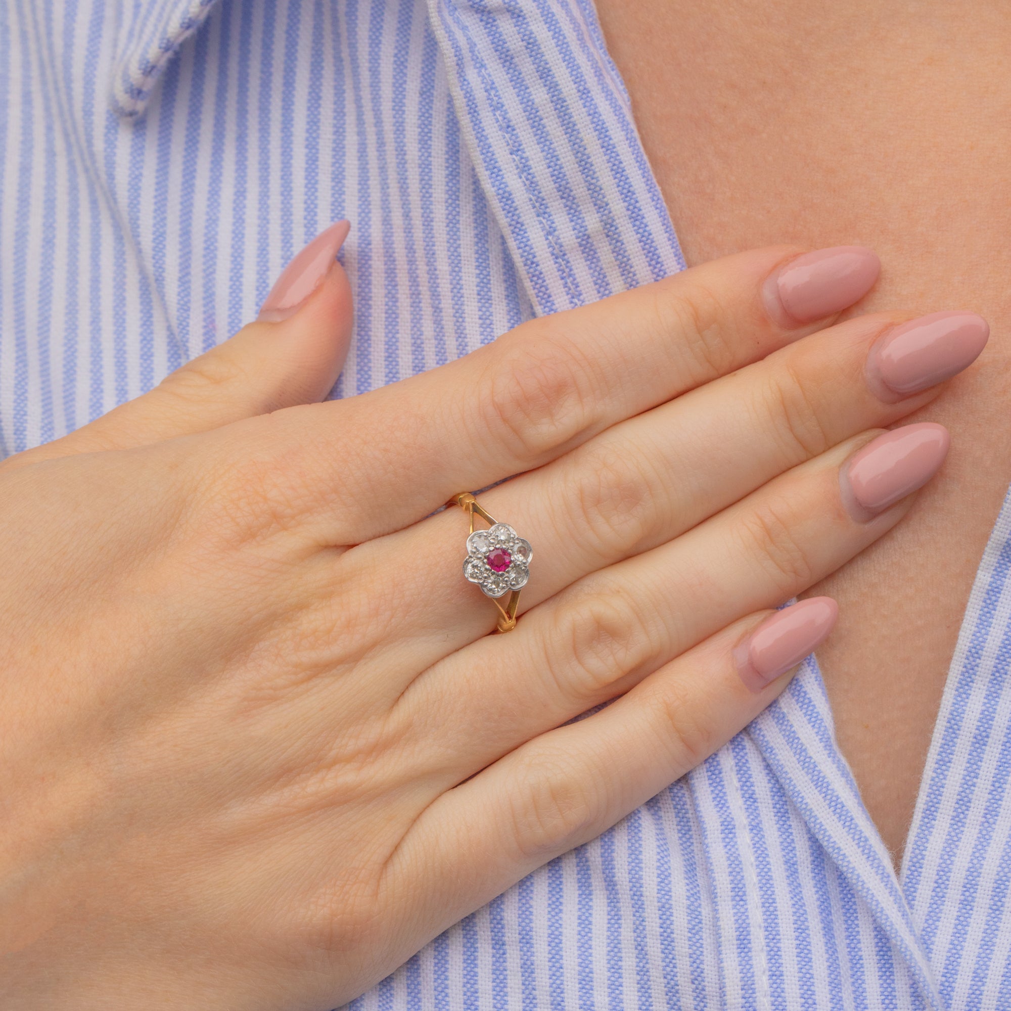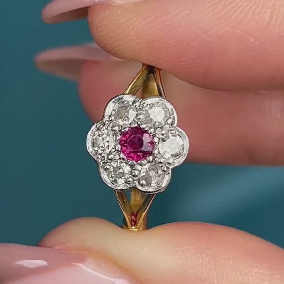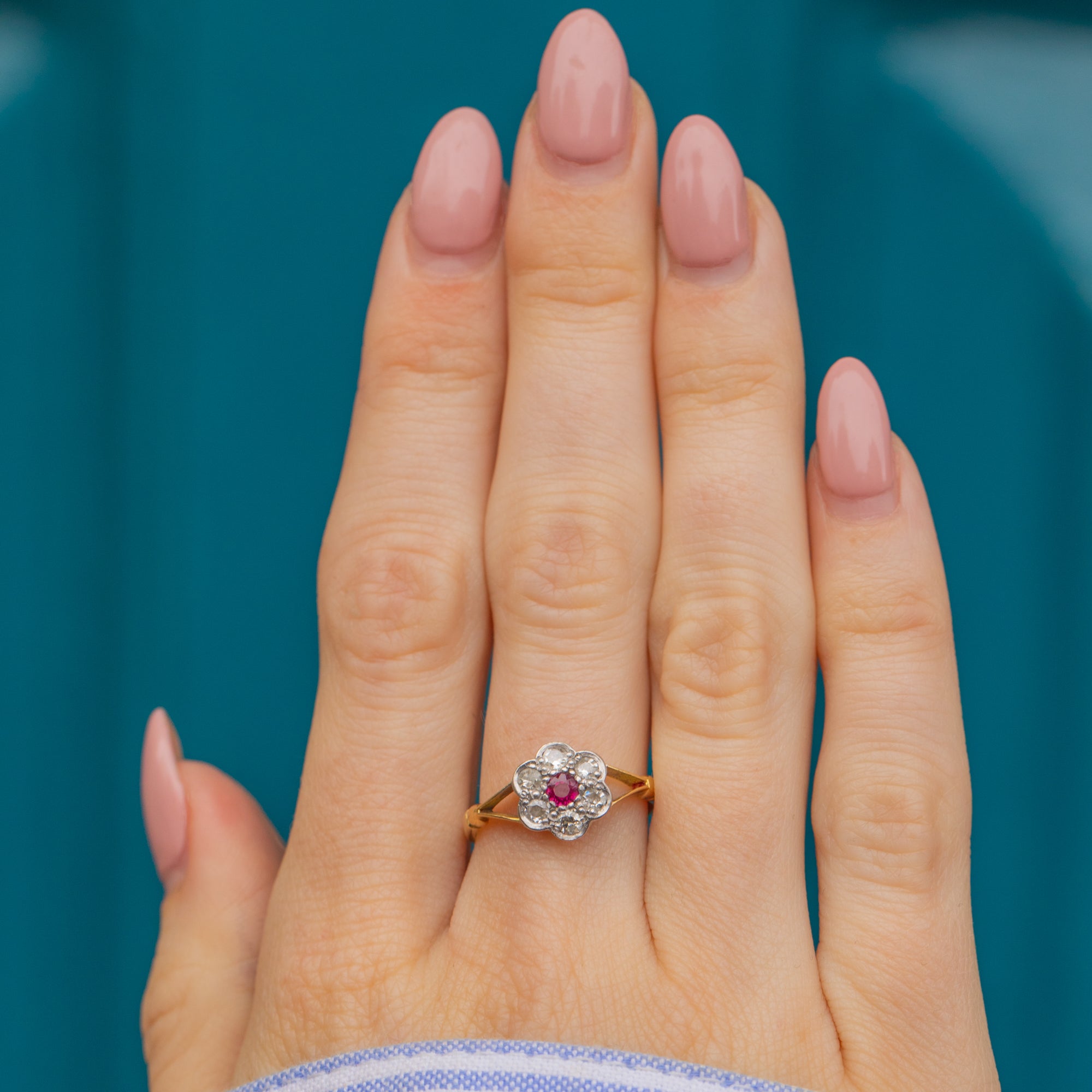 Antique 18ct Gold Ruby Diamond Daisy Cluster Ring, 0.30ct Diamond