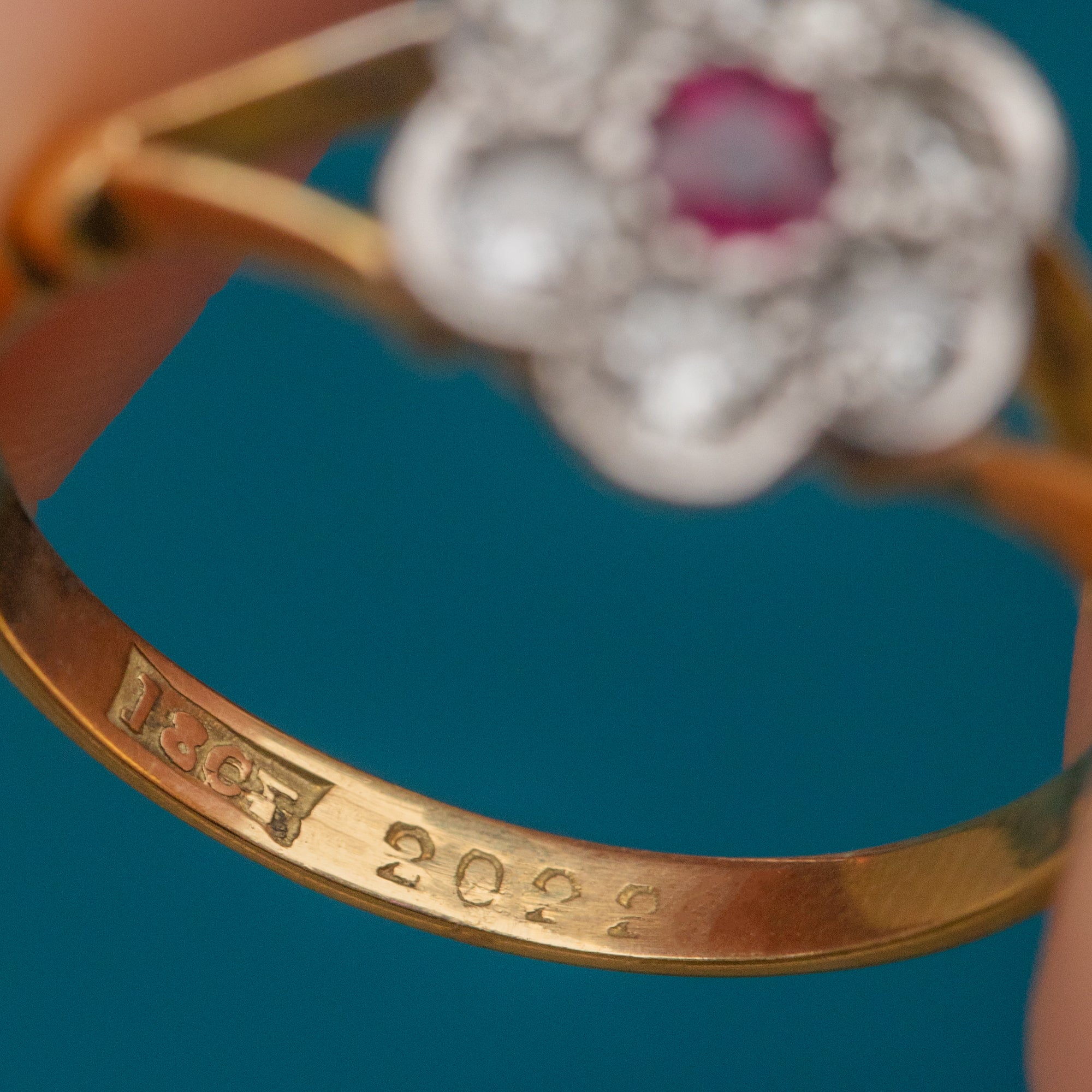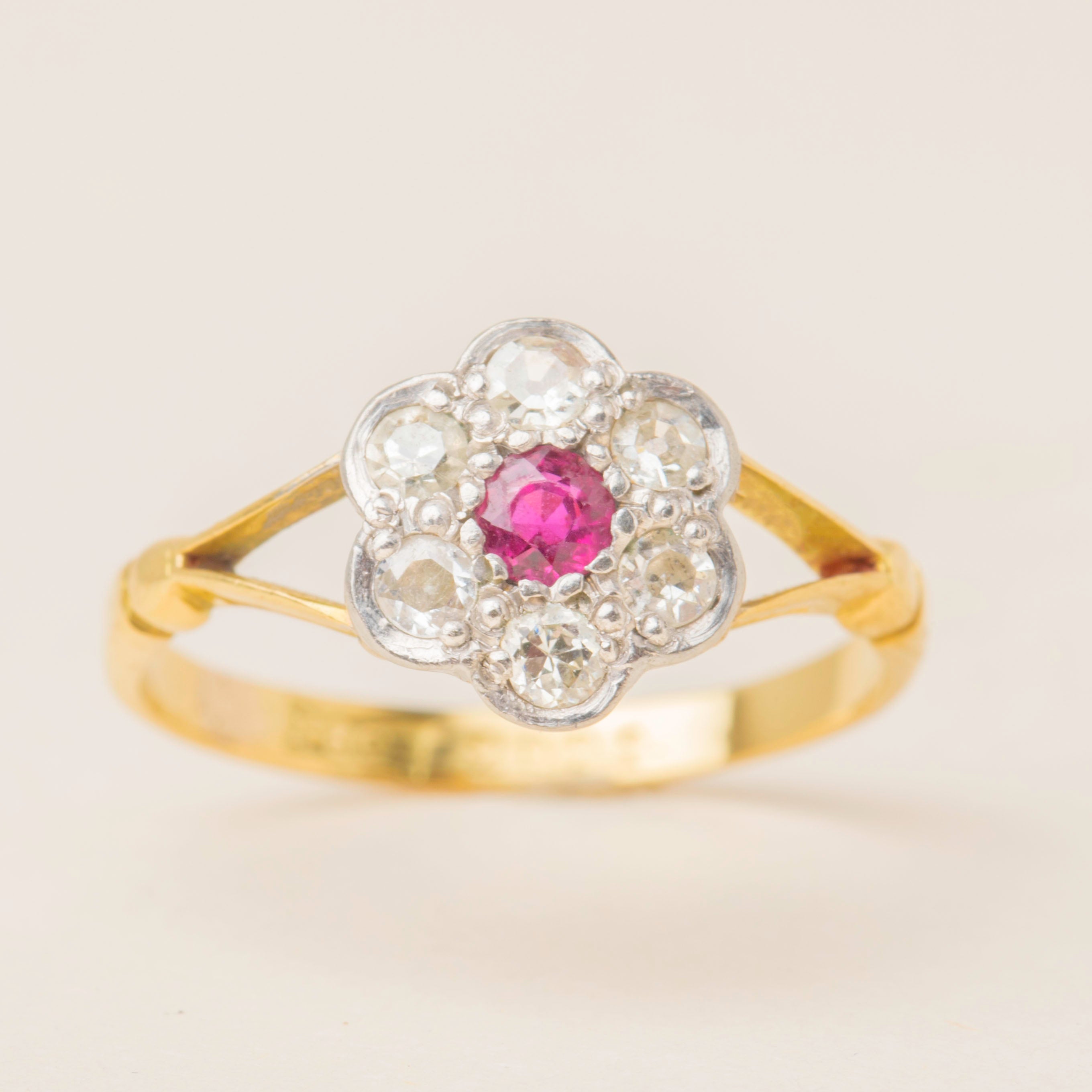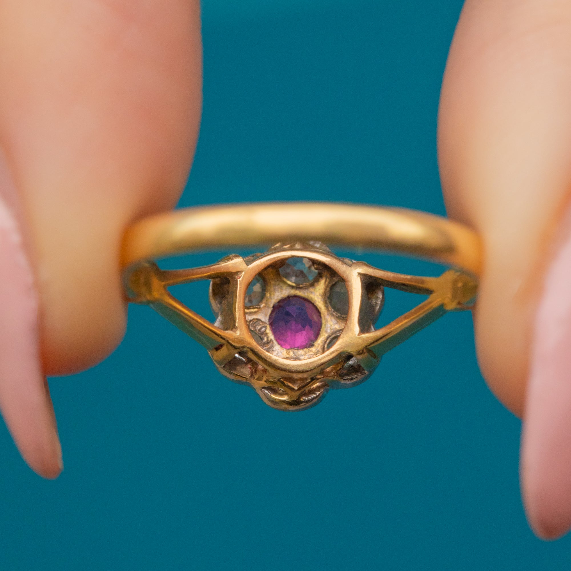 EXCELLENT. This antique 18ct Gold Ruby Diamond daisy cluster ring is in excellent condition. The Ruby is divine, the Diamonds secure and the piece wears like a dream. The split shoulders allow the flower to take centre stage, and the ring can be worn confidently.