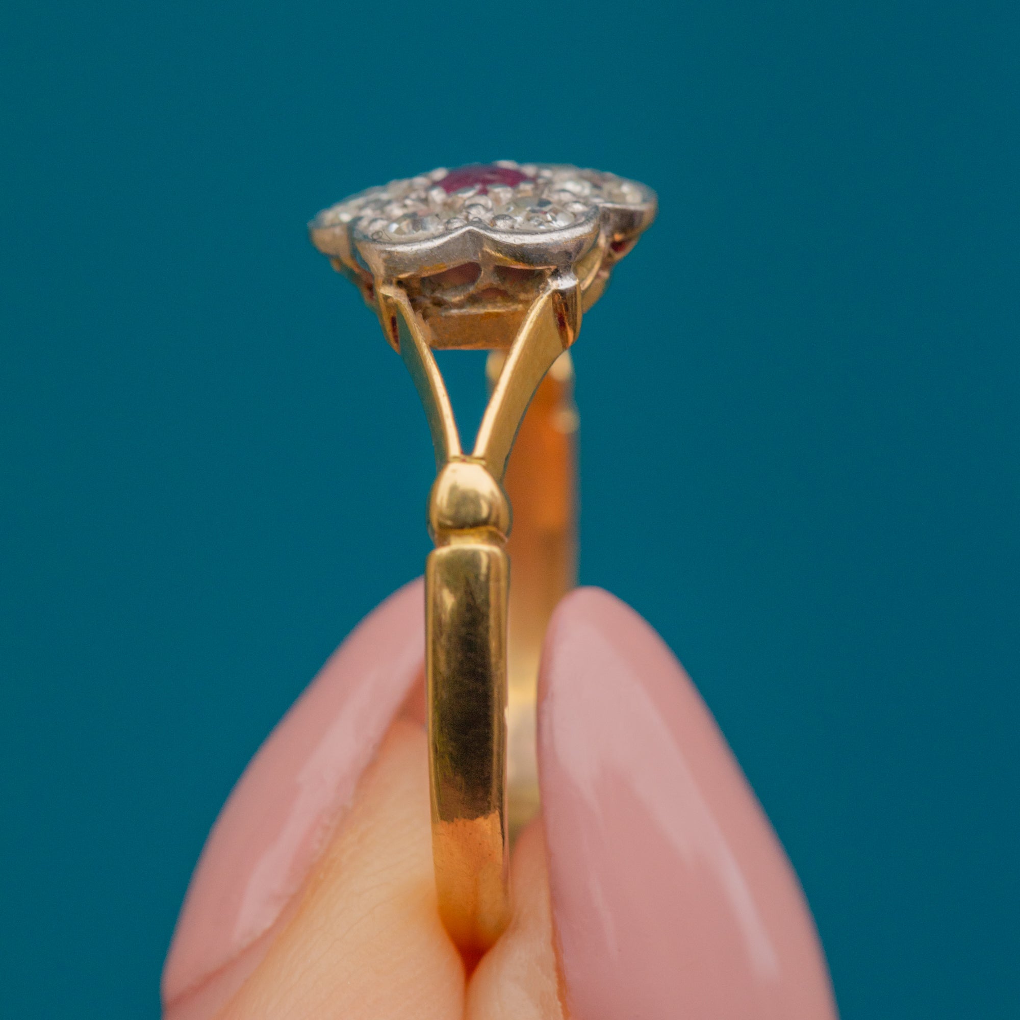 A splendid antique 18ct Gold Ruby Diamond daisy cluster ring! Offering you 0.30ct of Old-European and round cut Diamonds, haloing a berry red Ruby, this beautiful ring would be a fine choice for an engagement.