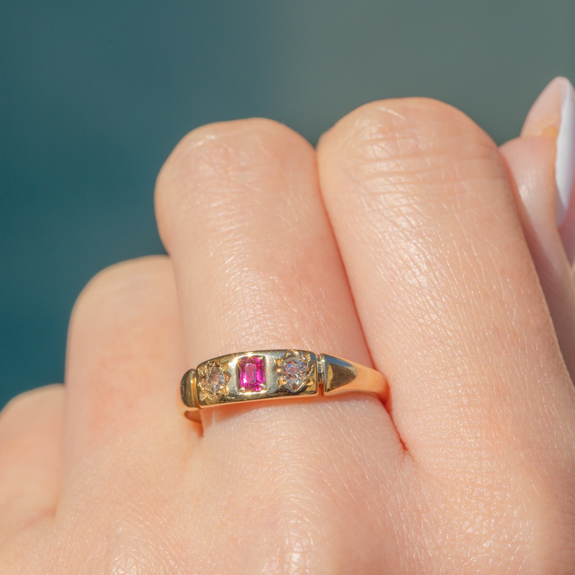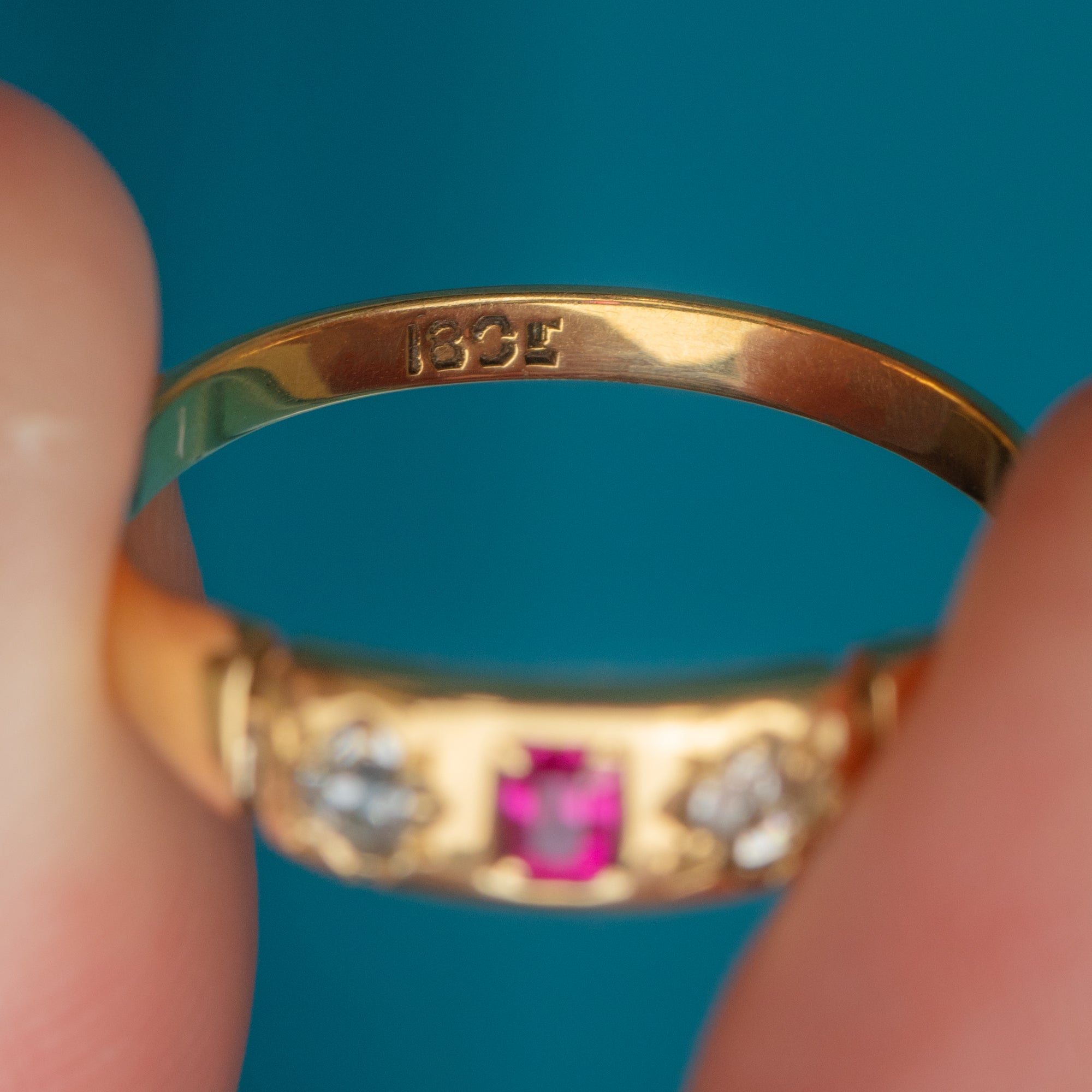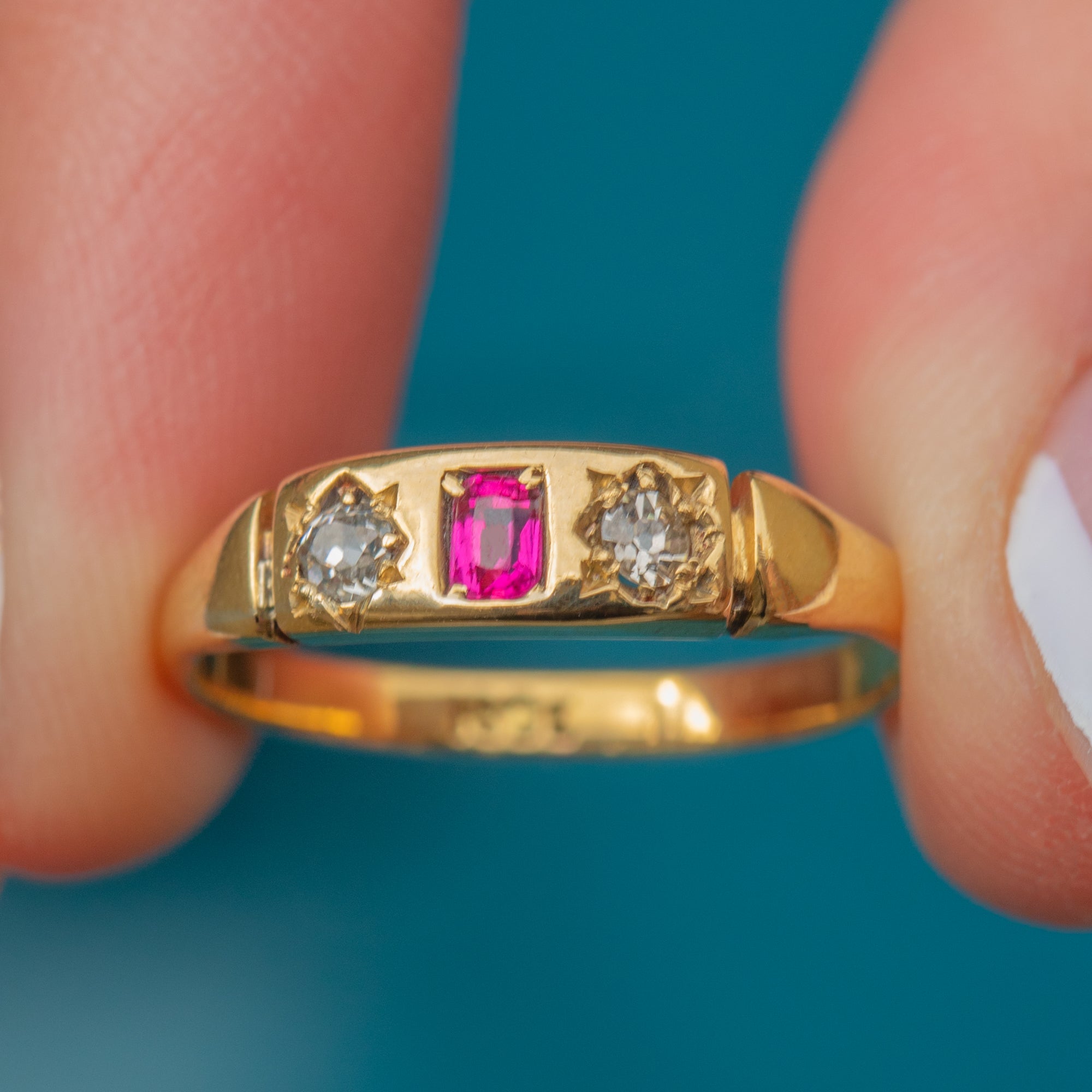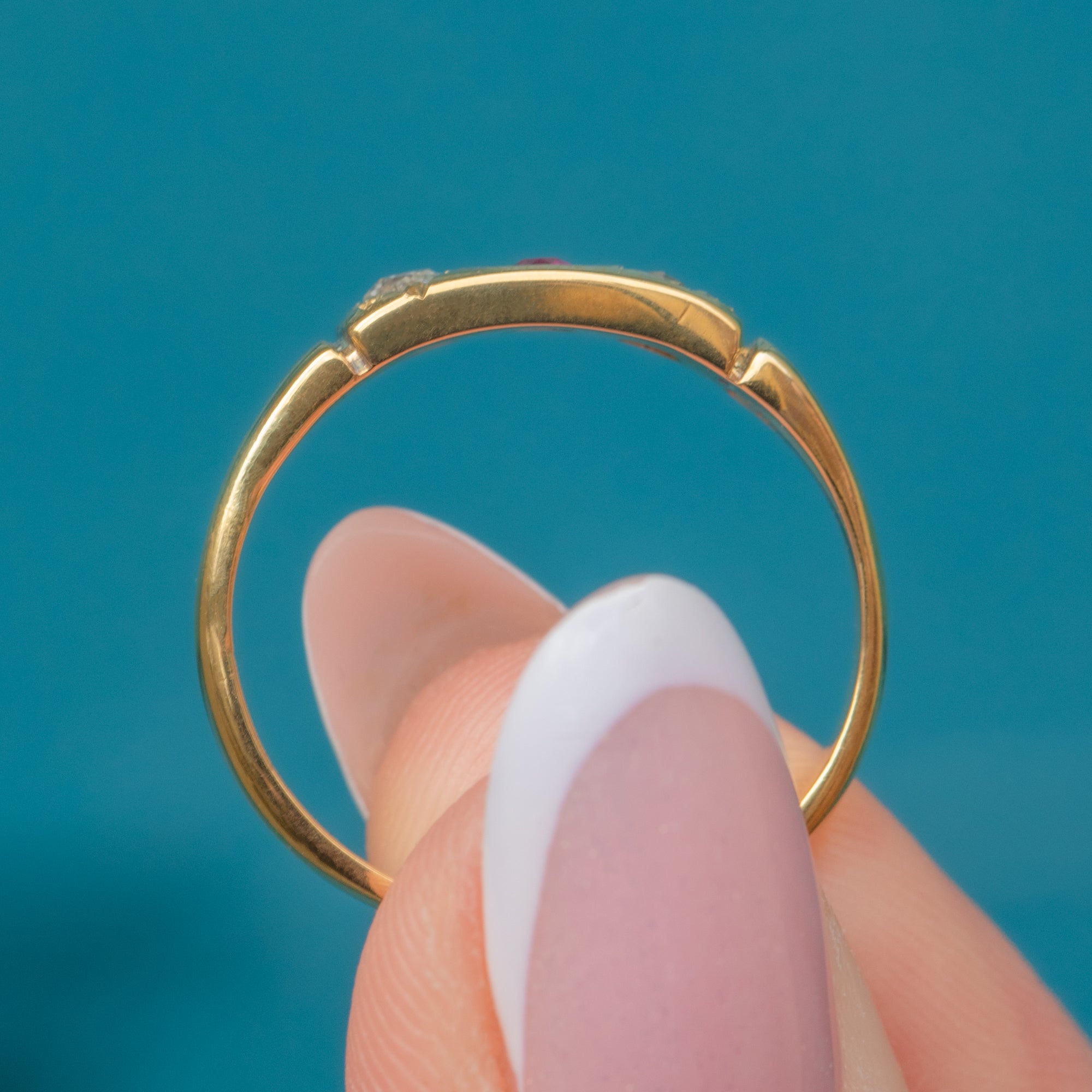This antique 18ct Gold Ruby Diamond gypsy ring will bring a touch of celestial charm to your curated ring stack! The slender ring band is crafted from brightly saturated 18ct Gold with a high-shine polish giving it a luxurious finish.