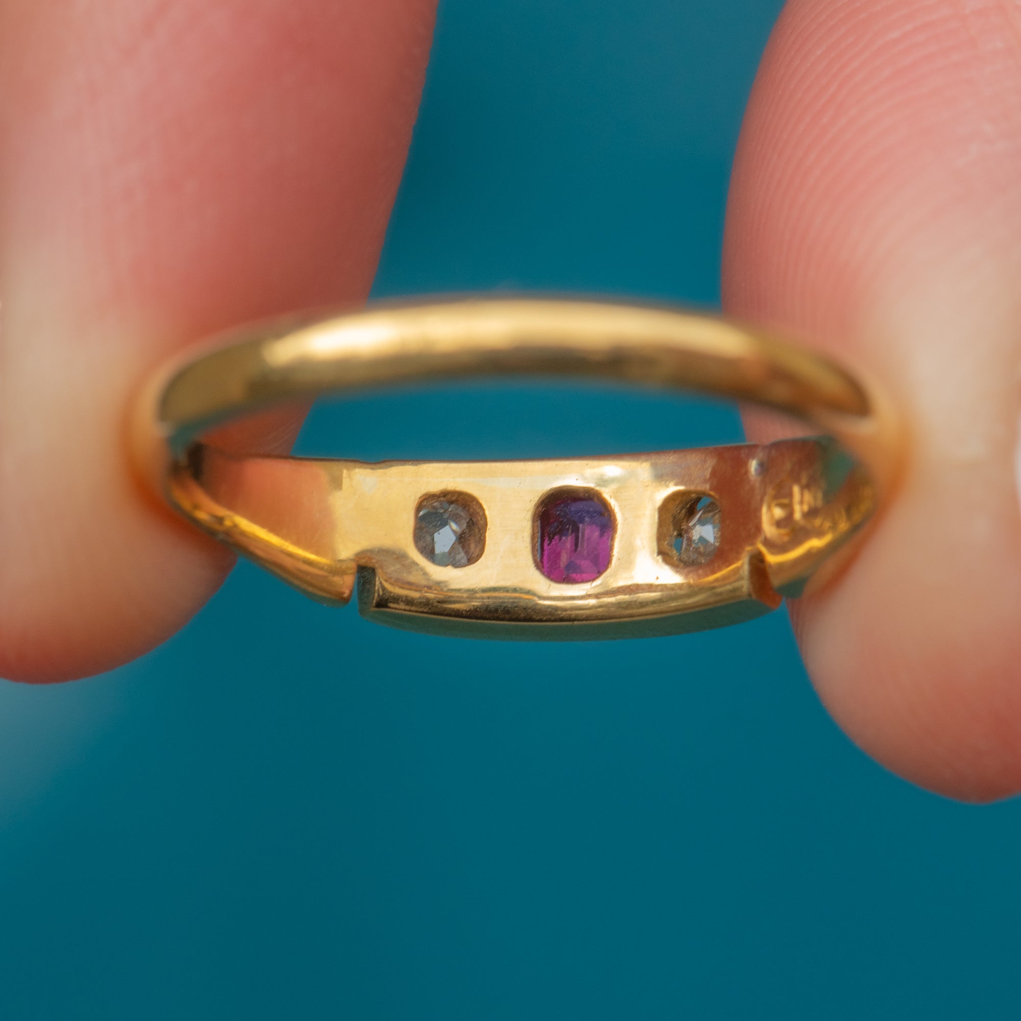 VERY GOOD-EXCELLENT: This antique 18ct Gold Ruby Diamond gypsy ring is in wonderful condition. The Gold is bright and buttery and the band has kept its form well, with only mild surface wear visible under close inspection. One of the claws on the Ruby setting has worn down, but it remains securely set. The gemstones have been immaculately preserved, free from fleabites or abrasions. With plenty of wear potential, don't hesitate to make this Victorian Ruby Diamond ring your newest acquisition!