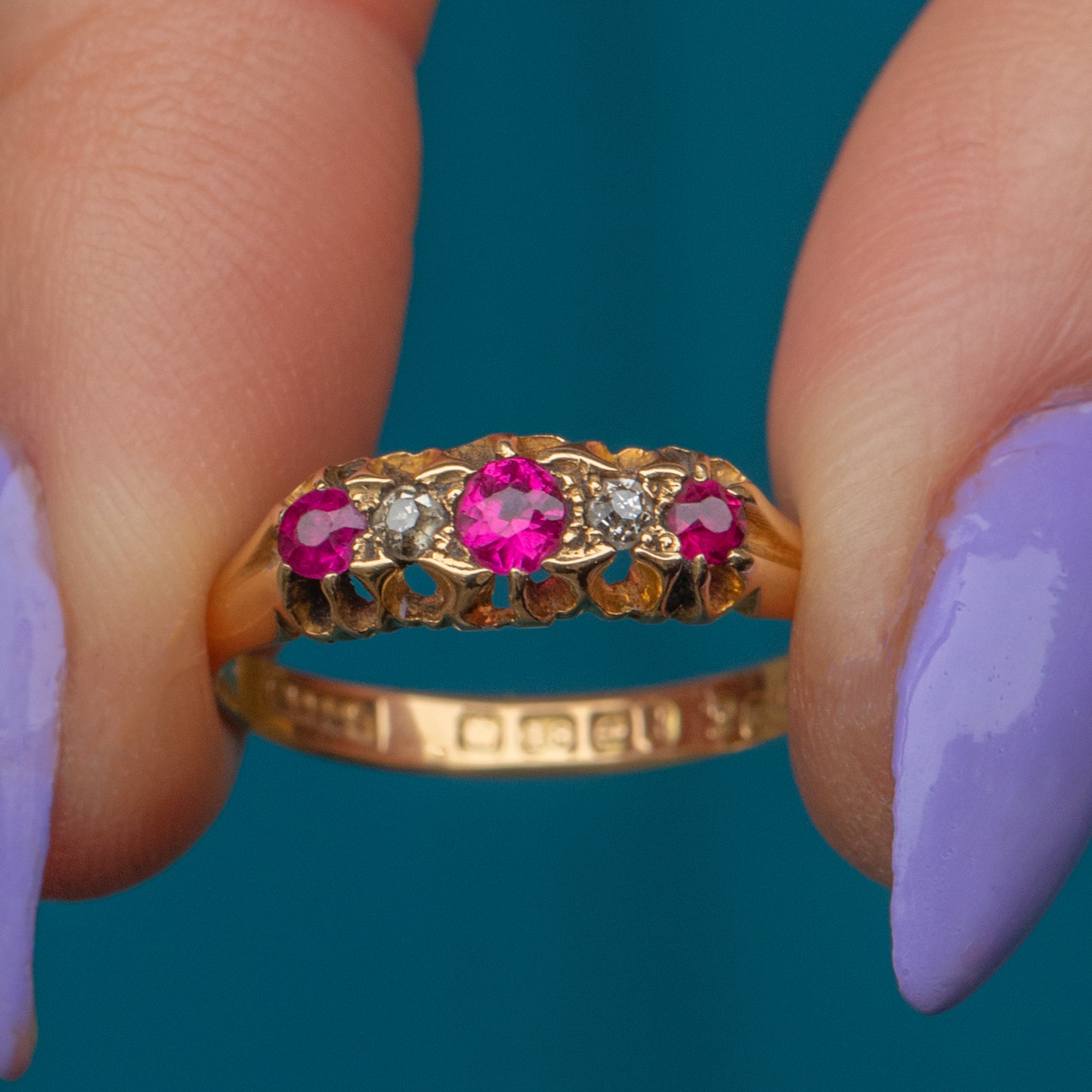 This is an exquisite antique 18ct Gold Ruby Diamond ring! With three vibrant hot pink Rubies, which are entirely natural, this ring certainly has the 'wow' factor.