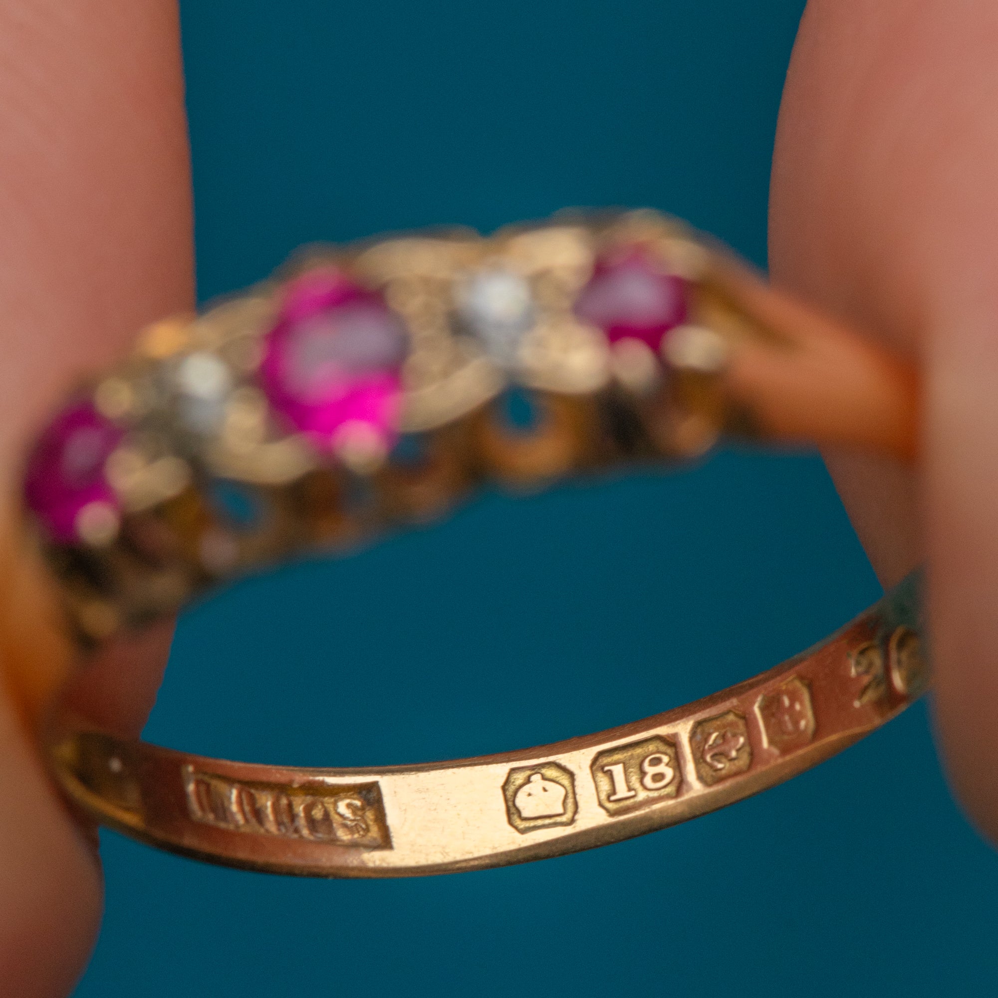 EXCELLENT: This is a splendid antique 18ct Gold Ruby Diamond ring! In excellent condition, this piece features three stunning Rubies, alongside bright and crisp Diamonds, which are all secure within their settings. The hallmarks inside of the smooth Gold band are crisp and have allowed us to date the ring to 1918! We simply don't have anything other to say than 'wow'.
