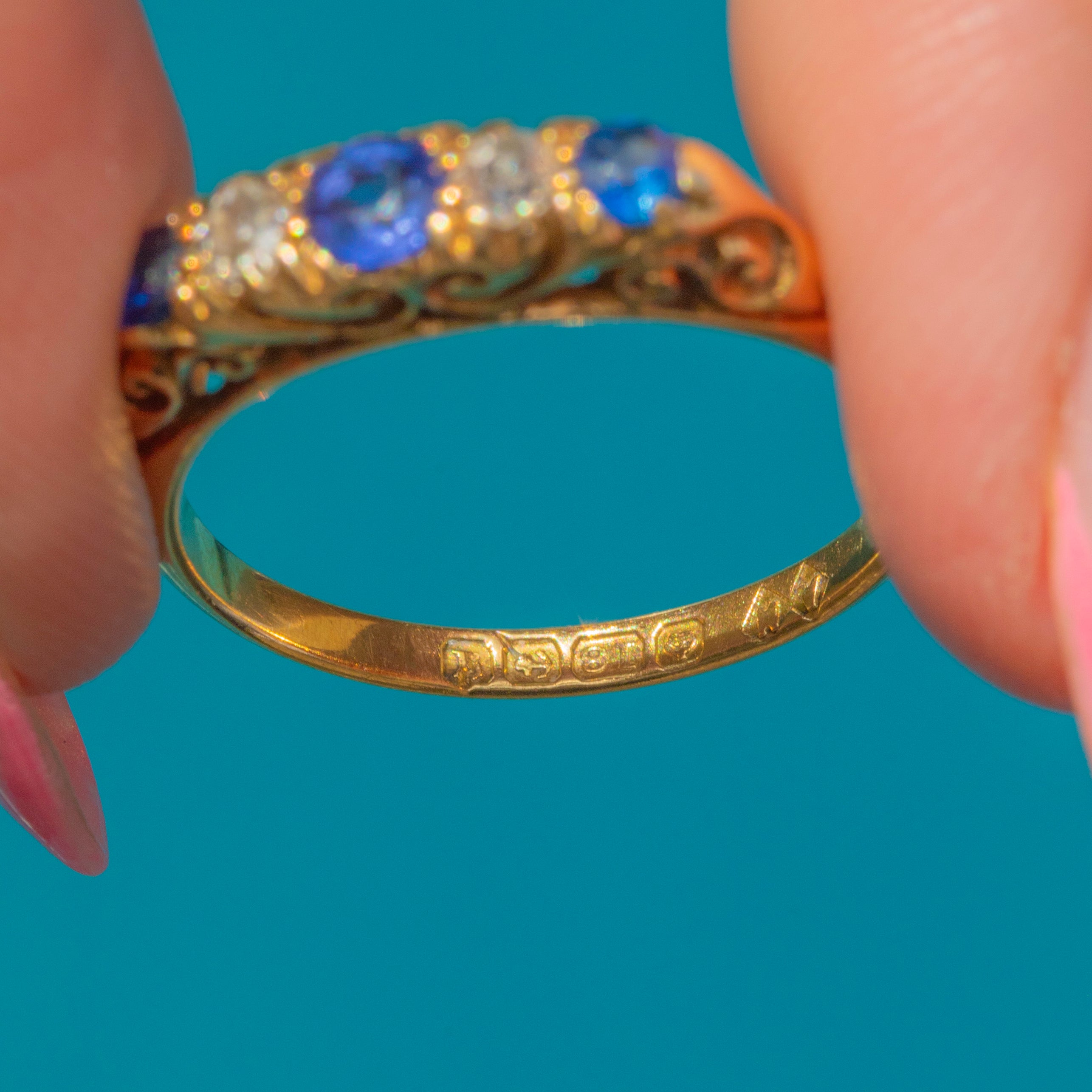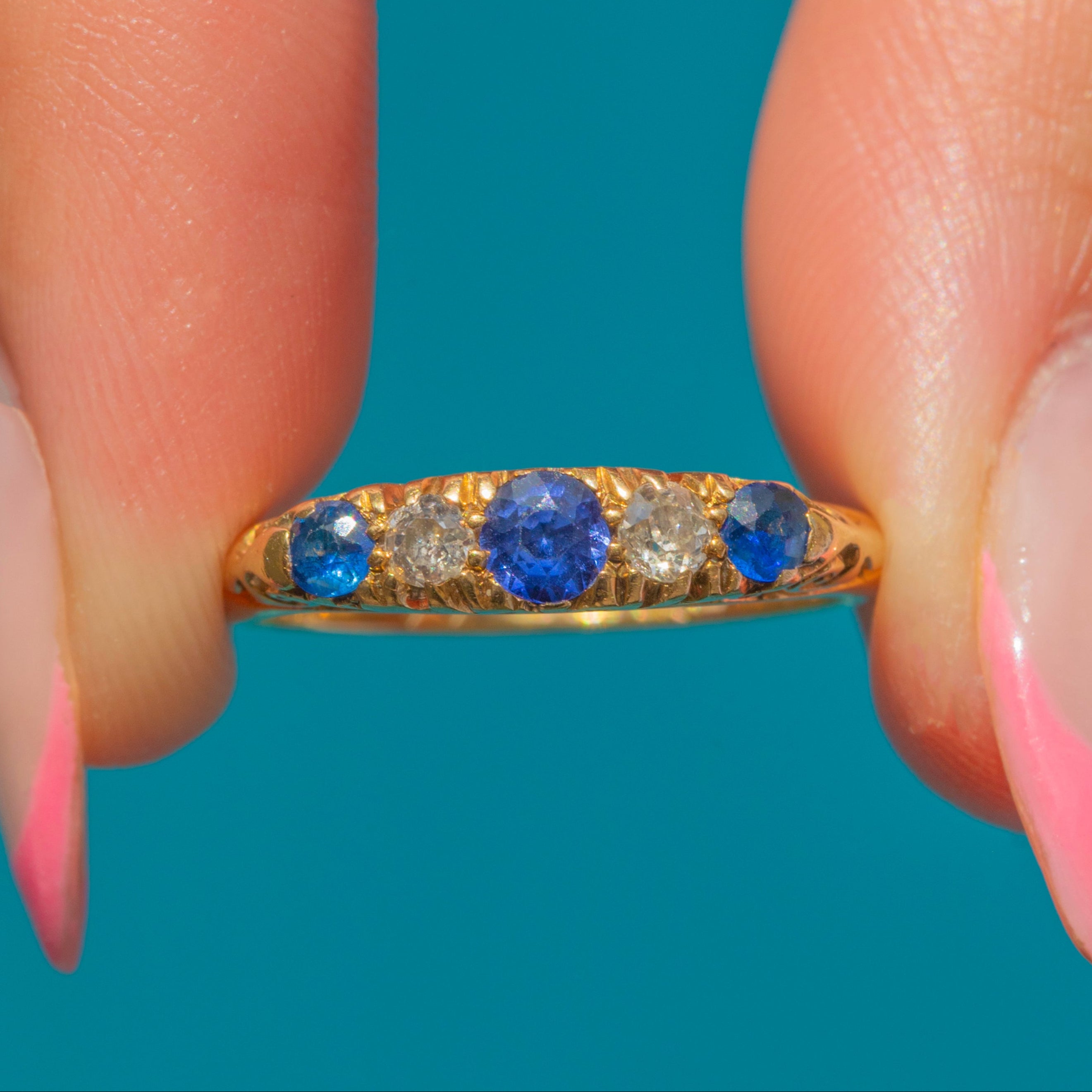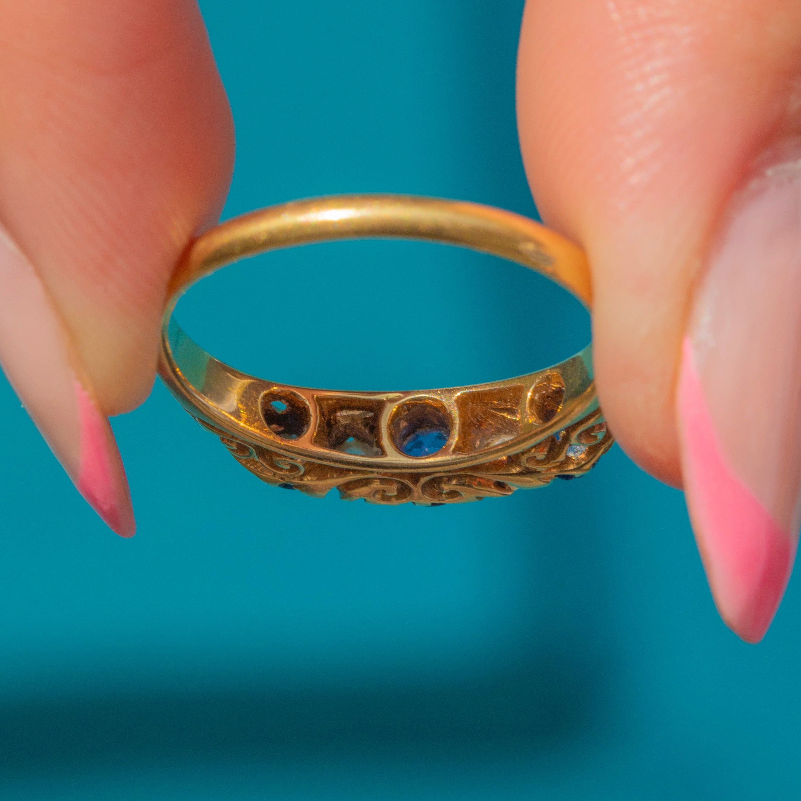 EXCELLENT: We are pleased to present this antique 18ct Gold Sapphire Diamond five stone ring in wonderful condition. Each of her gemstones are radiant and secure in its setting, with no chips or abrasions visible. The Gold is bright and buttery, with very minor surface wear, and a full set of legible antique hallmarks.