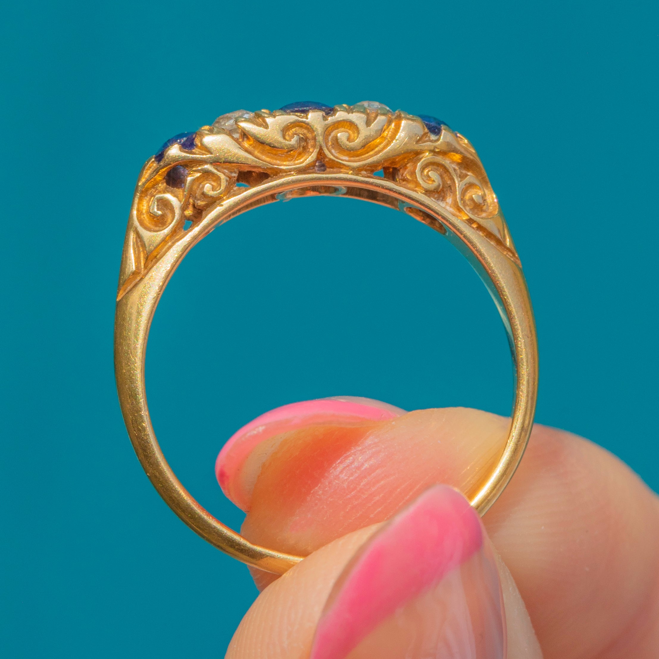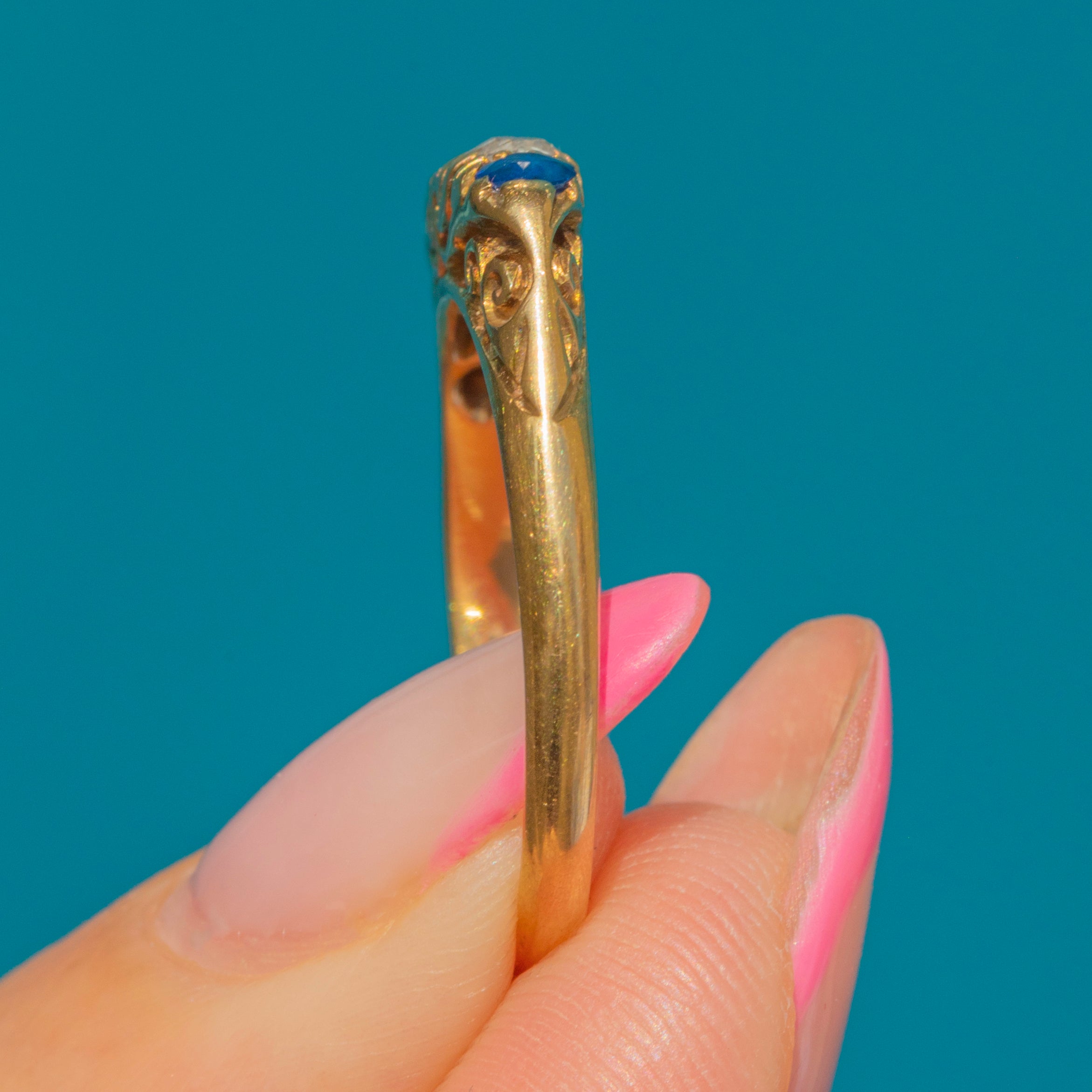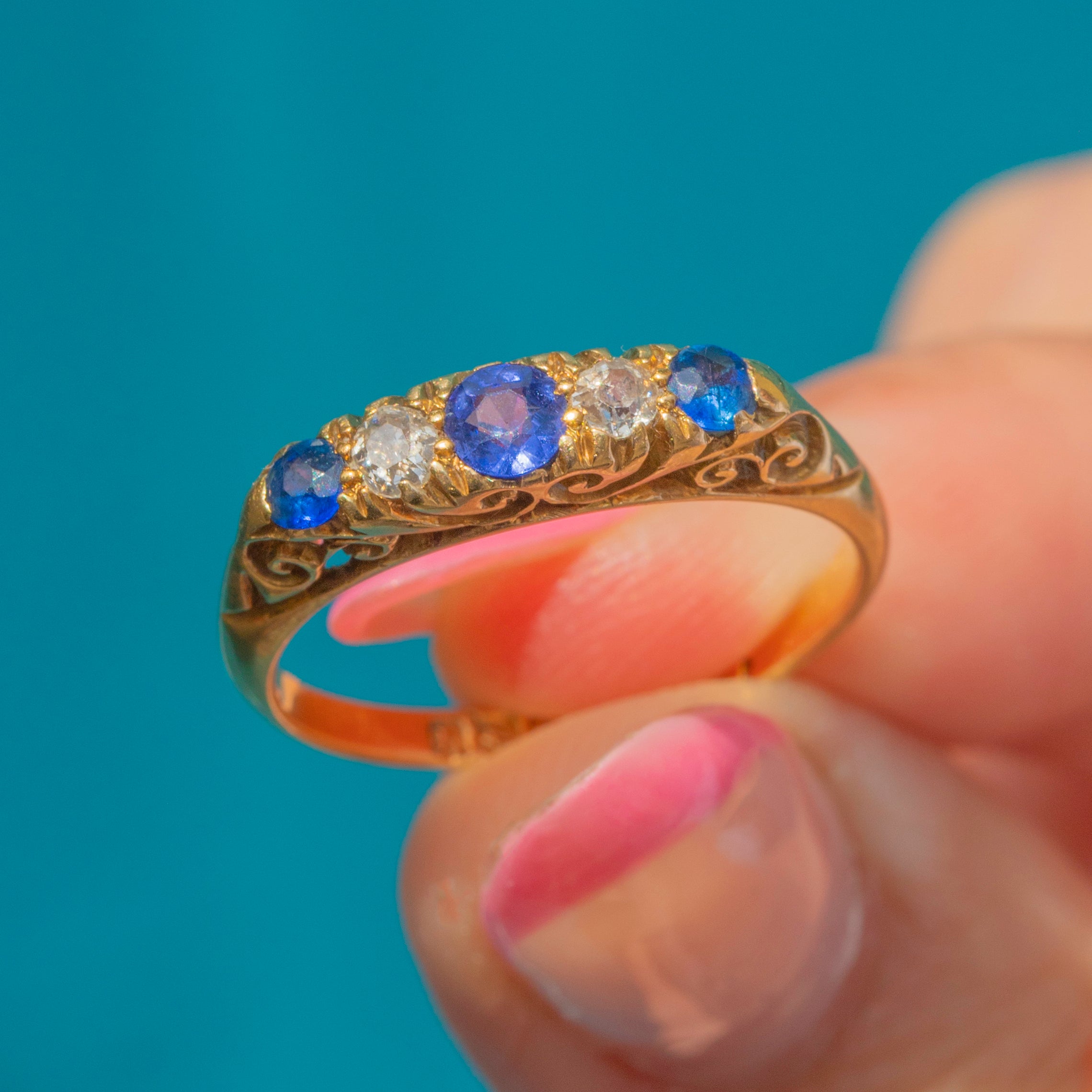 EXCELLENT: We are pleased to present this antique 18ct Gold Sapphire Diamond five stone ring in wonderful condition. Each of her gemstones are radiant and secure in its setting, with no chips or abrasions visible. The Gold is bright and buttery, with very minor surface wear, and a full set of legible antique hallmarks.