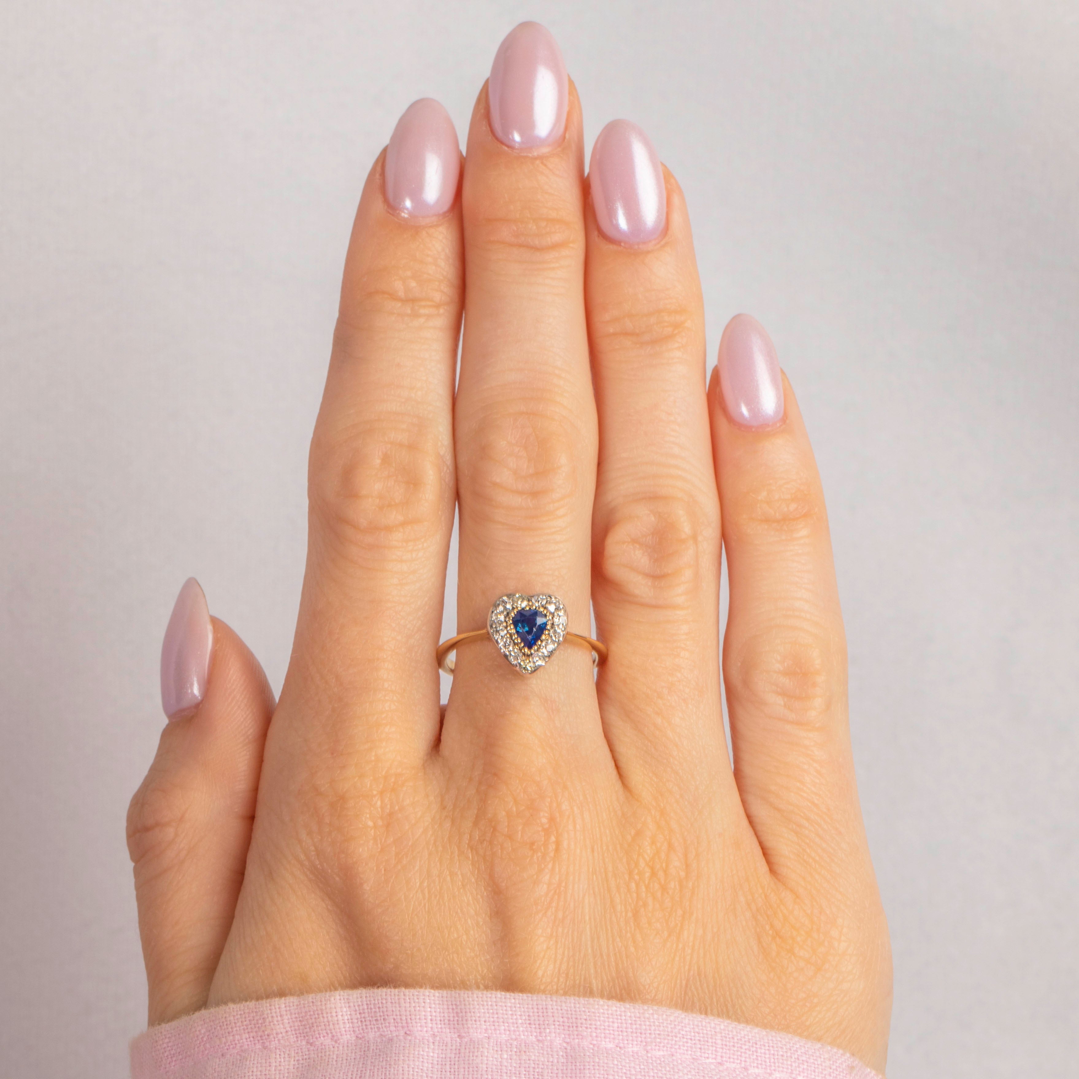 This antique 18ct Gold Sapphire Diamond heart ring looks as though she has been plucked from a fairytale! Glistening from afar, you can't help but fall weak at the knees for her romantic heart form, inlaid with a midnight blue 0.30ct Sapphire at the centre, haloed by scintillating Diamonds.