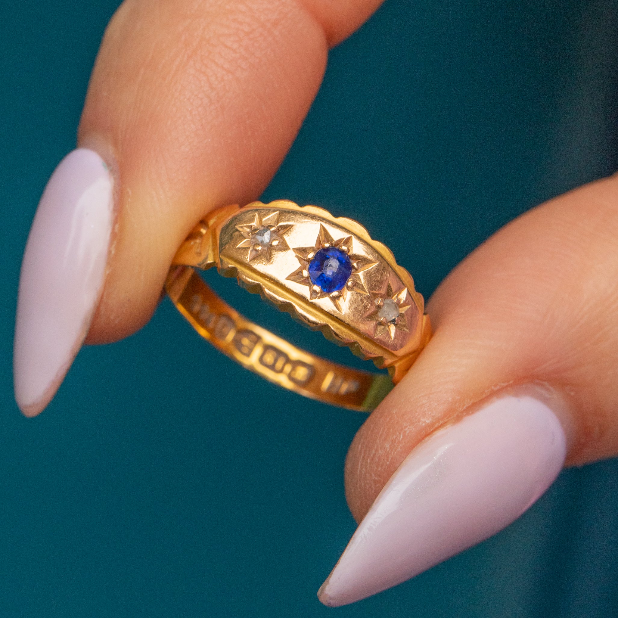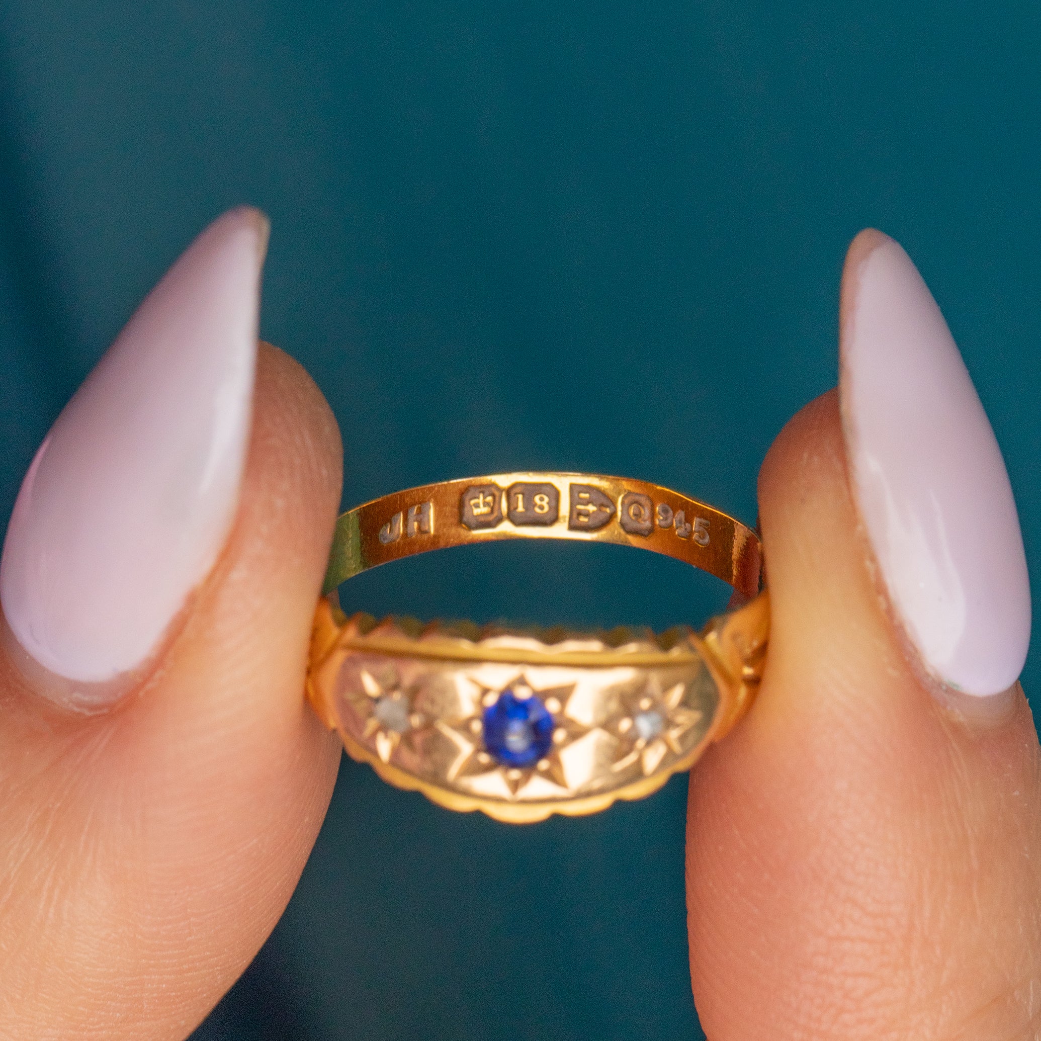 The combination of the deep midnight blue Sapphire flanked by twinkling Diamonds creates a sublime gemstone trilogy, displayed within bold star settings surrounded by a scalloped border for a decorative finish. The full set of hallmarks allows us to accurately date this treasure to c.1899, making her a fine collector's piece!
